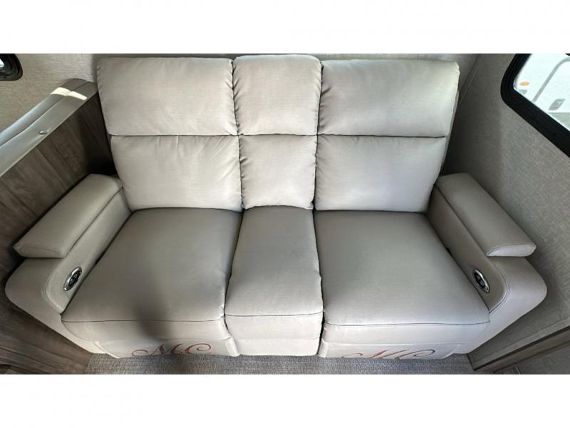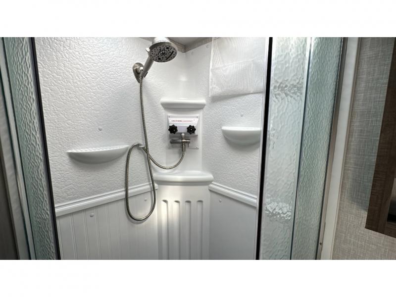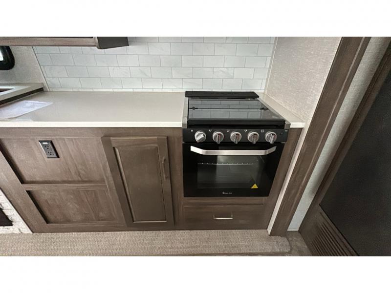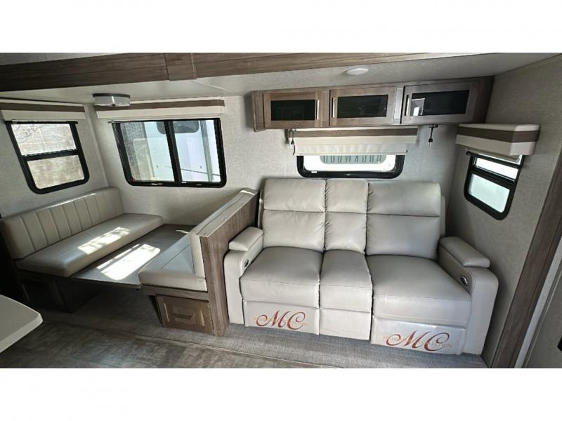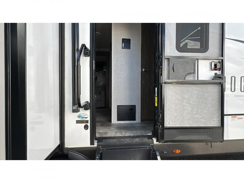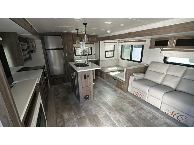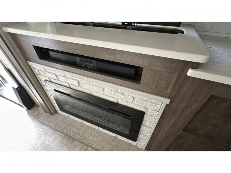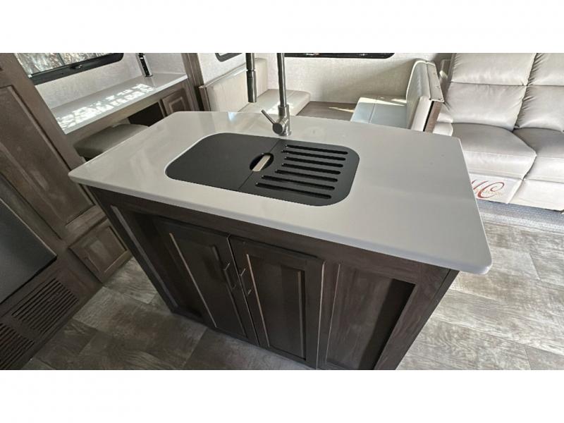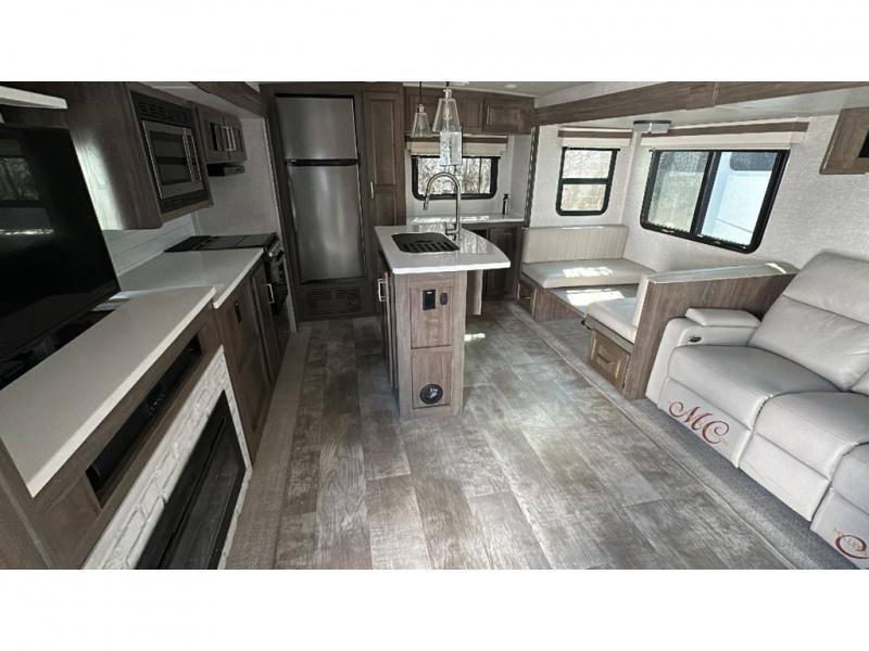 Hike the trails, fish the lake, and relax indoors after the cook whips up a meal with full amenities in the rear kitchen which also includes extra counter space that can be utilizes as a desk as well, and a center island that provides more prep and serving surface, and a place to dry the dishes. The 44" booth dinette allows you to eat your meals together and watch the LED TV with fireplace below. The theater seating is another comfortable place to relax, and the double entry bathroom is convenient especially at night. And the cook will love having an outside kitchen with a burner top and refrigerator, plus there is an outside griddle.