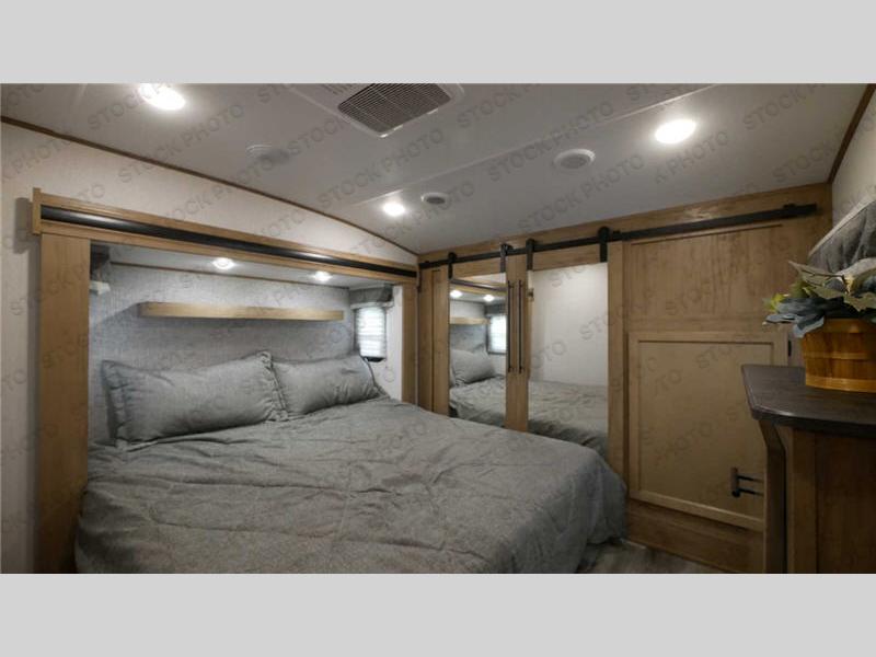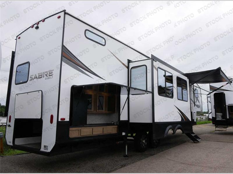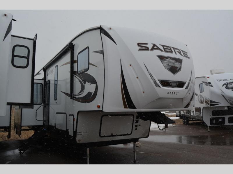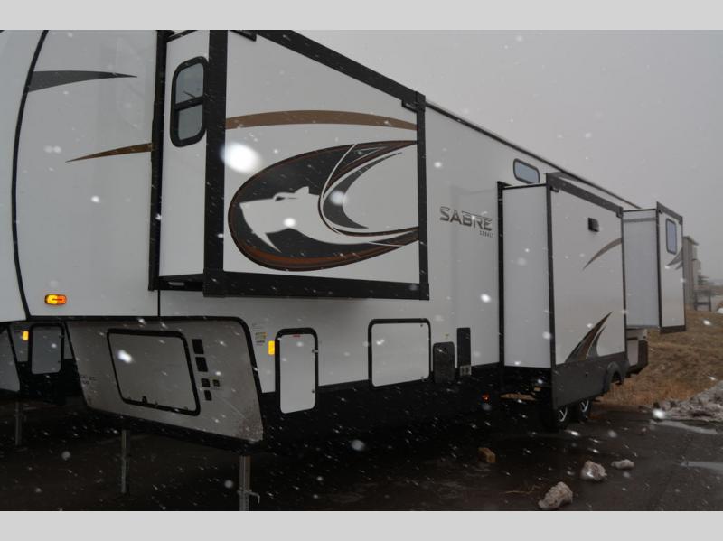 You will experience luxurious camping trips at an affordable price with any one of these Forest River Sabre fifth wheels! These models are durable and ready to travel anytime of the year thanks to features like the high-gloss gel-coat front cap with LED lighting, the PVC roof membrane, and the forced air underbelly with enclosed gate valves. The electric auto-leveling system makes setting up easy and safe, and the adjustable power awning with LED lighting will create an inviting outdoor living space. Each model includes a universal docking station which includes a black tank flush and an outside shower, and the backlit "Secure Step" landing for you to enter and exit the unit safely. Inside, you will love the design of the ambient accent lighting above the crown molding in the living area, the real wood lumbercore cabinetry, and the vintage gaslight decorative lighting!