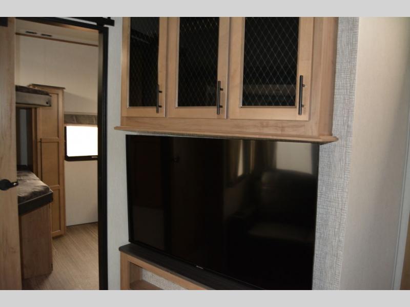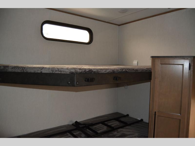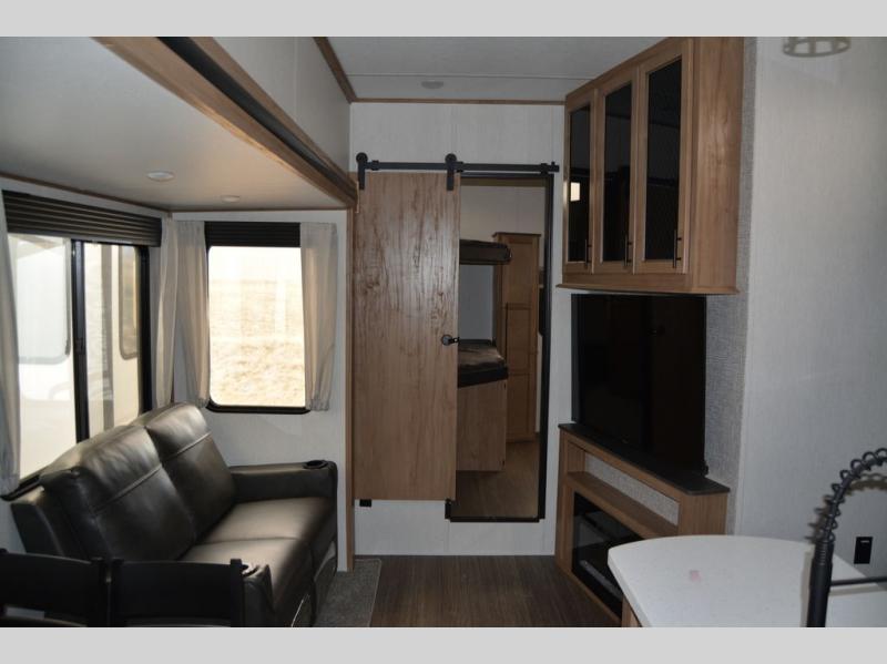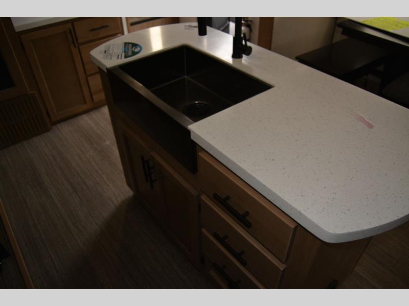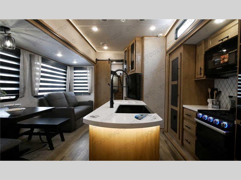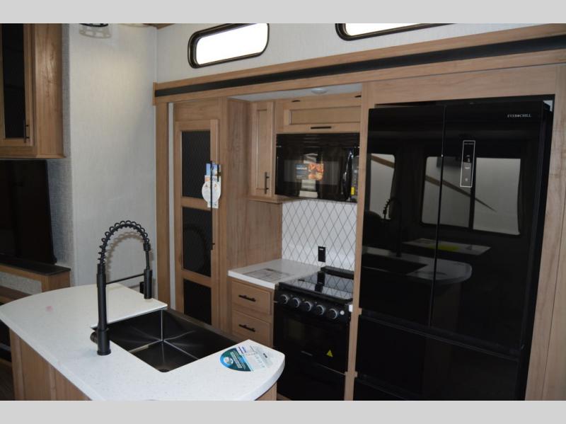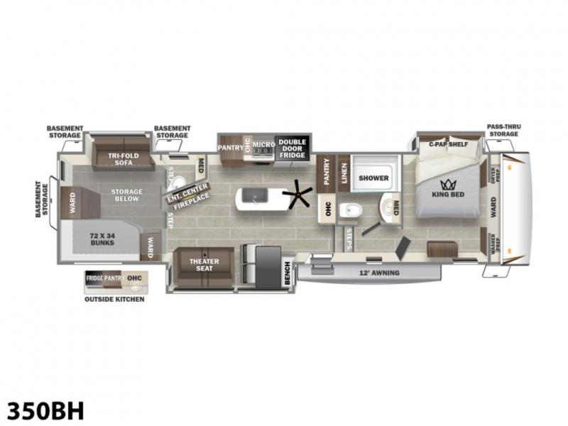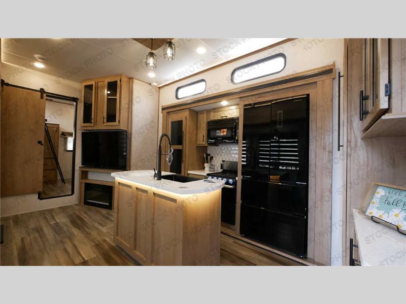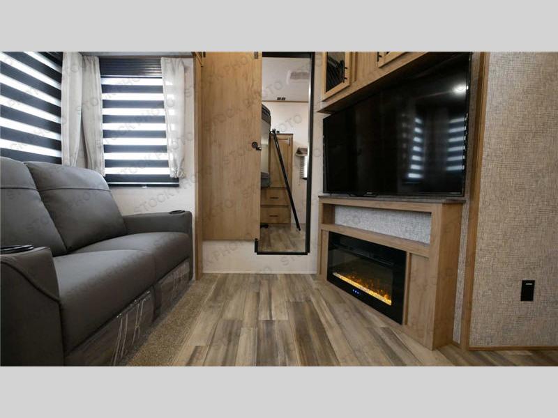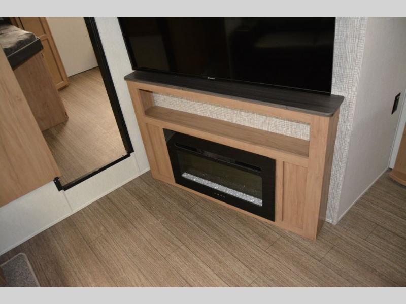 One look at this fifth wheel and you'll be ready to take it home! The rear private bunkhouse includes bunk beds, a tri-fold sofa, a half bath, plus basement storage below for luggage, coolers, or yard games. You'll enjoy your own space up front in the private bedroom that includes a king bed slide out, a shelf for a CPAP machine, plus a front wardrobe with washer and dryer prep if you choose to go full-time. The main living and kitchen area will be a favorite place to meet together since there is a Smart TV, a fireplace, and theater seating as well. The chef will love the extra counter space provided by the kitchen island, and there is a ceiling fan here to cool them off when they're cooking.