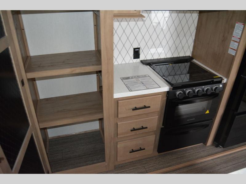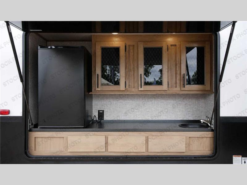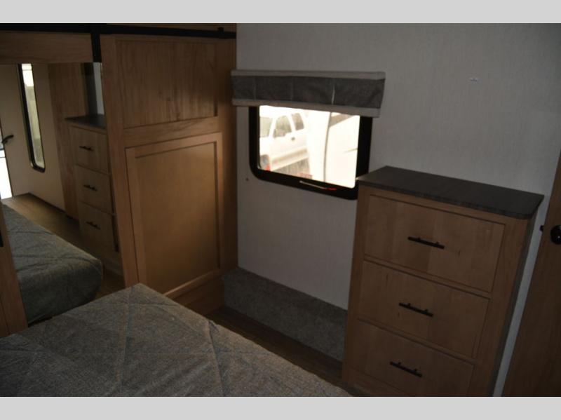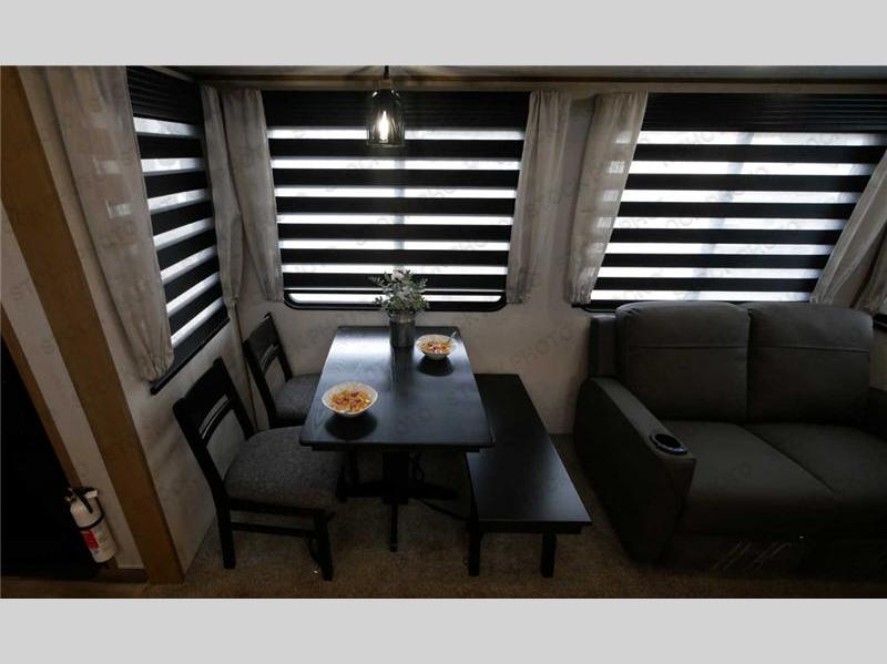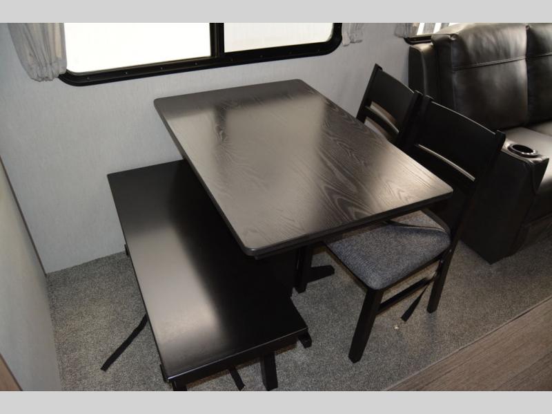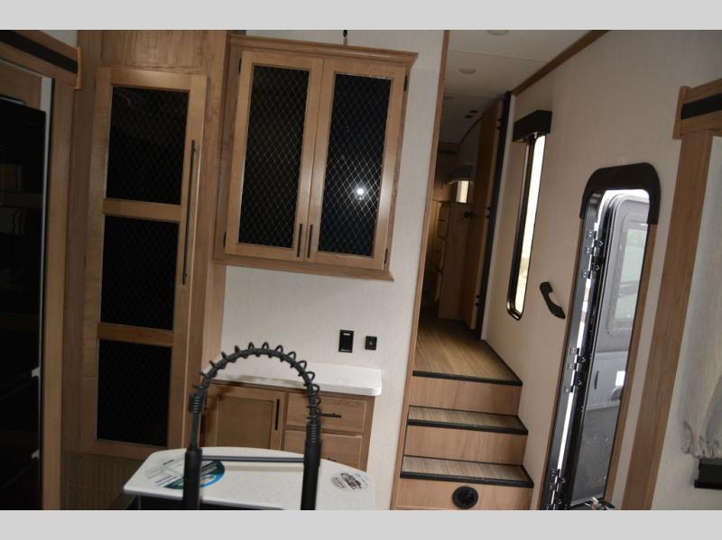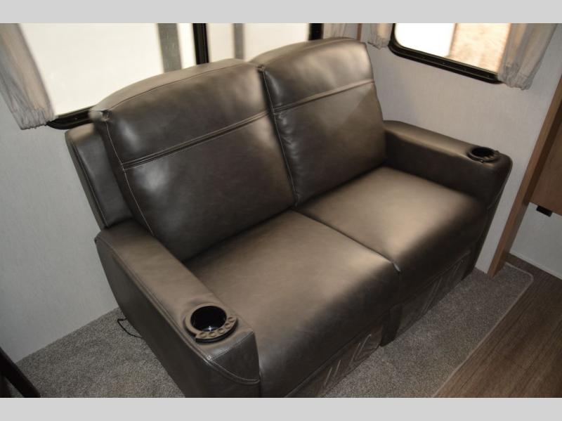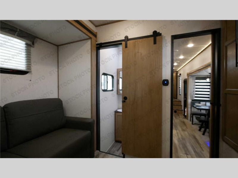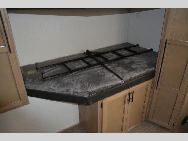 One look at this fifth wheel and you'll be ready to take it home! The rear private bunkhouse includes bunk beds, a tri-fold sofa, a half bath, plus basement storage below for luggage, coolers, or yard games. You'll enjoy your own space up front in the private bedroom that includes a king bed slide out, a shelf for a CPAP machine, plus a front wardrobe with washer and dryer prep if you choose to go full-time. The main living and kitchen area will be a favorite place to meet together since there is a Smart TV, a fireplace, and theater seating as well. The chef will love the extra counter space provided by the kitchen island, and there is a ceiling fan here to cool them off when they're cooking.