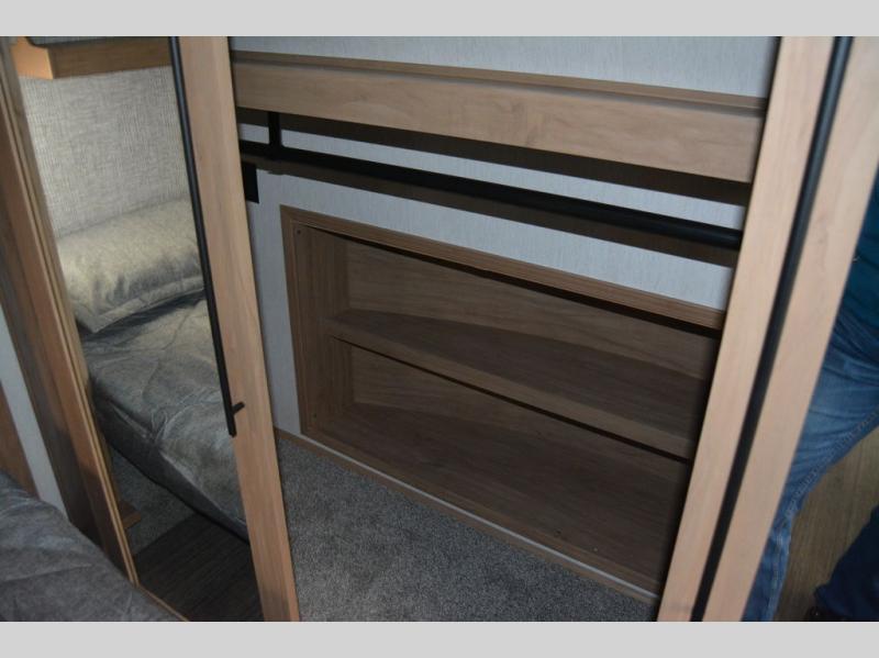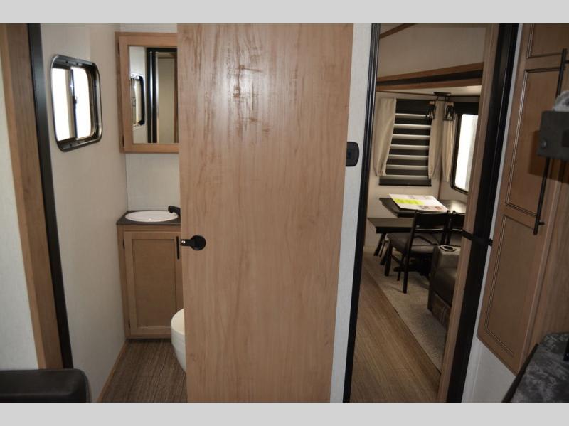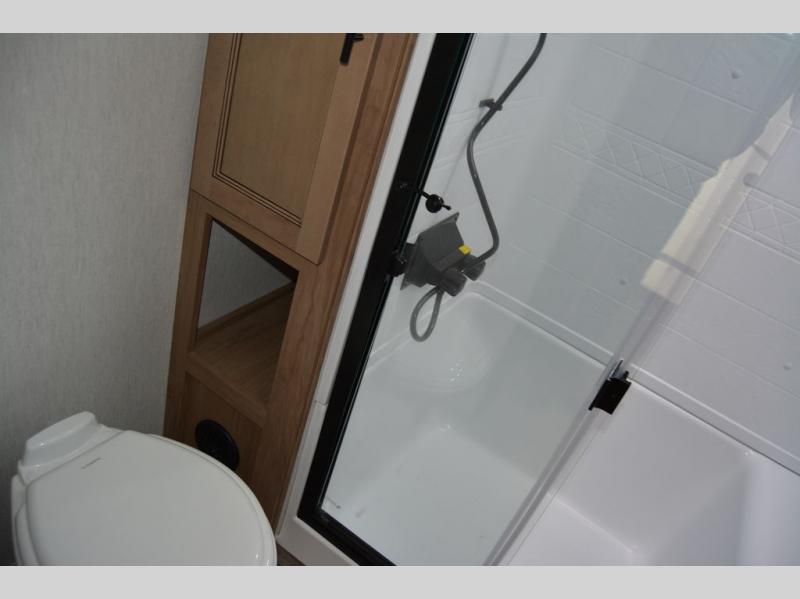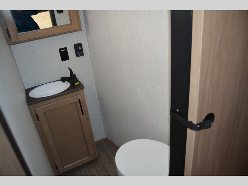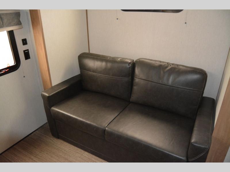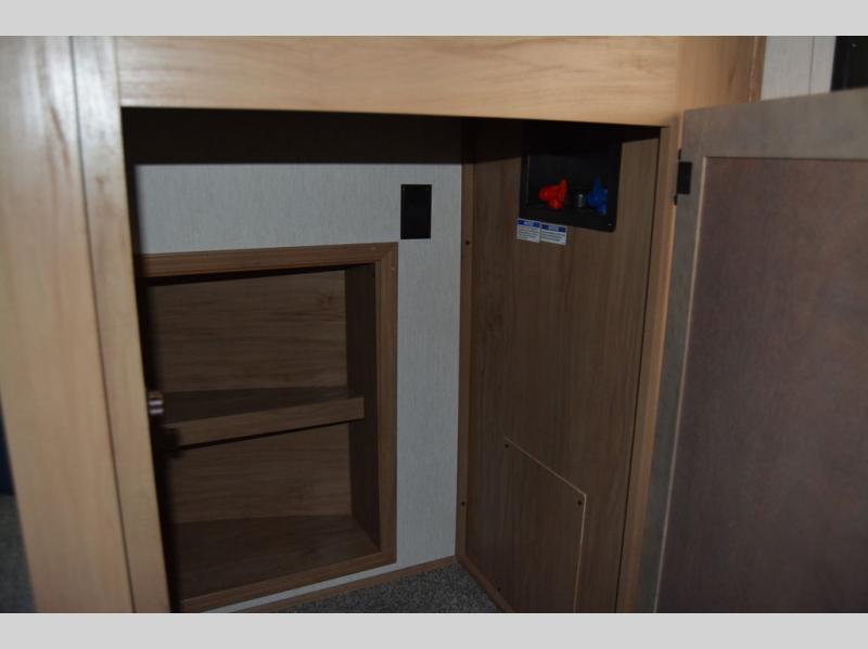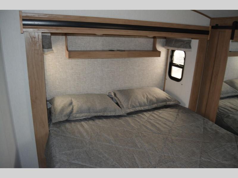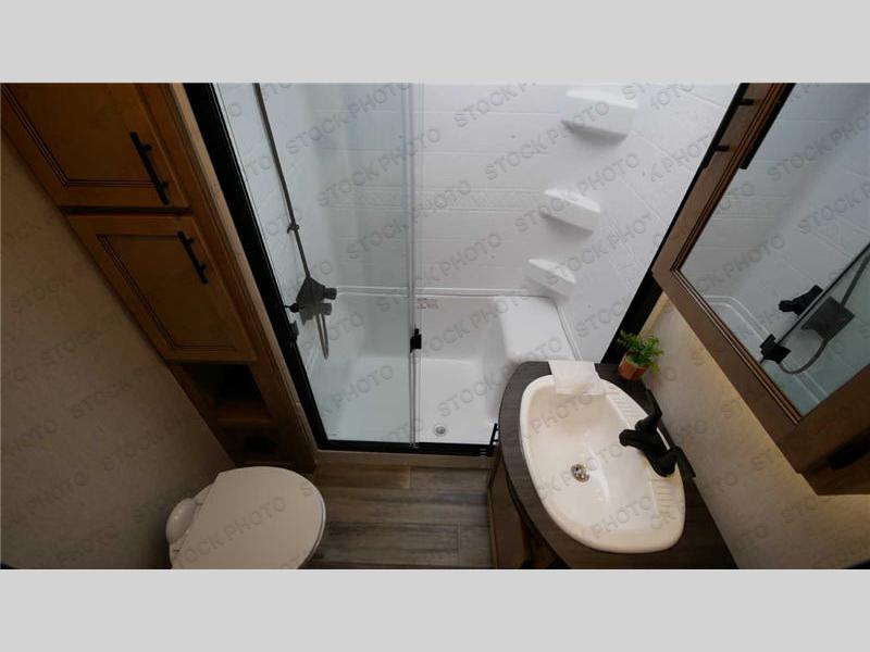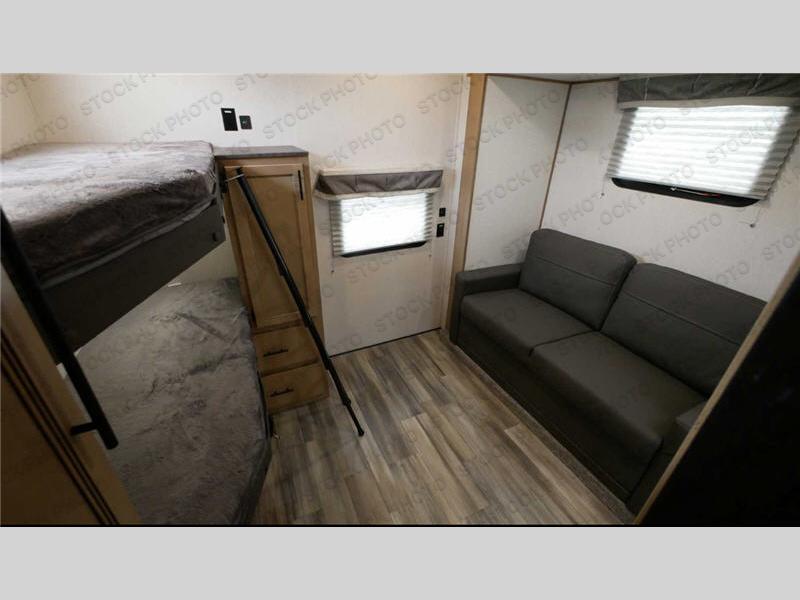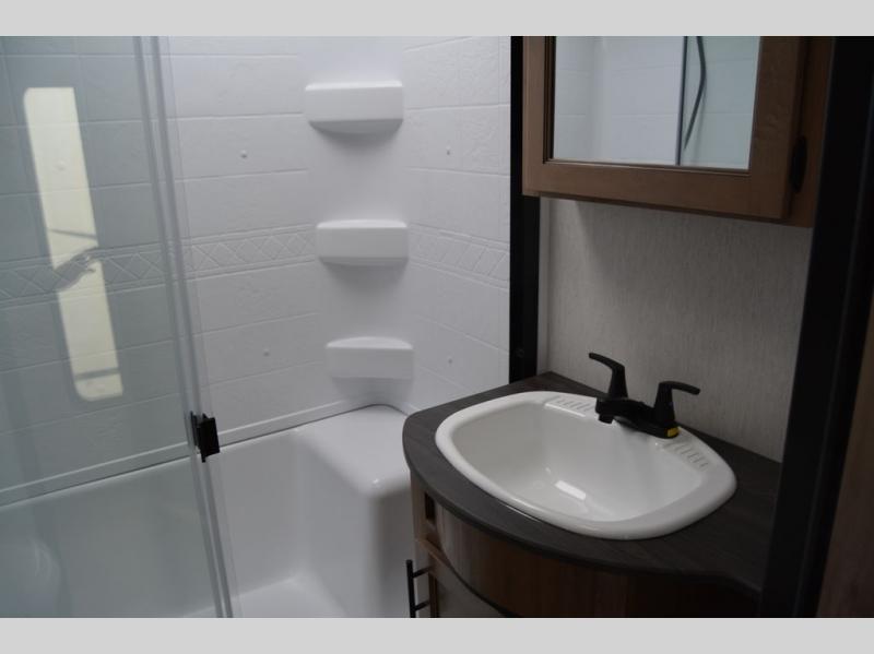 One look at this fifth wheel and you'll be ready to take it home! The rear private bunkhouse includes bunk beds, a tri-fold sofa, a half bath, plus basement storage below for luggage, coolers, or yard games. You'll enjoy your own space up front in the private bedroom that includes a king bed slide out, a shelf for a CPAP machine, plus a front wardrobe with washer and dryer prep if you choose to go full-time. The main living and kitchen area will be a favorite place to meet together since there is a Smart TV, a fireplace, and theater seating as well. The chef will love the extra counter space provided by the kitchen island, and there is a ceiling fan here to cool them off when they're cooking.