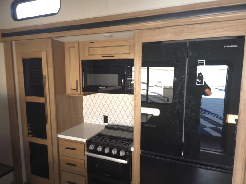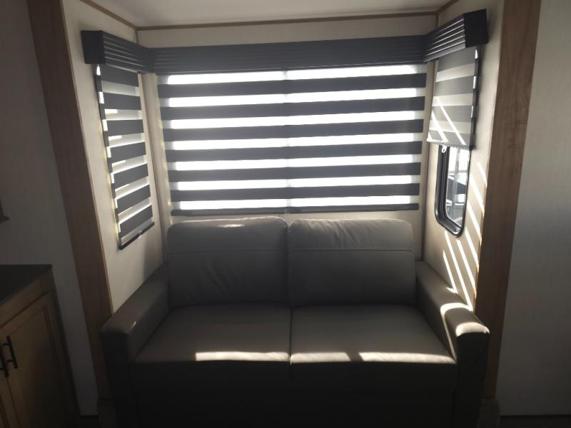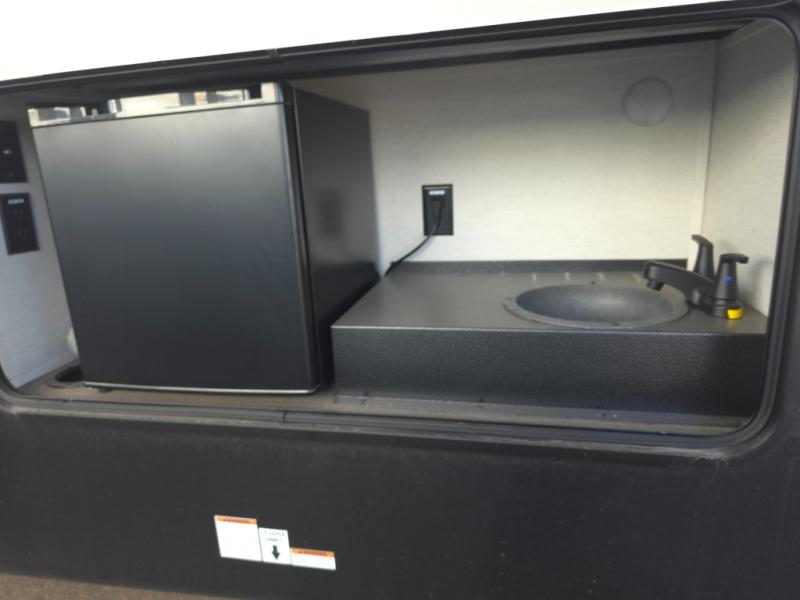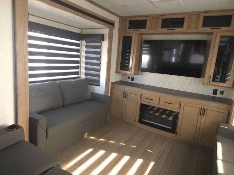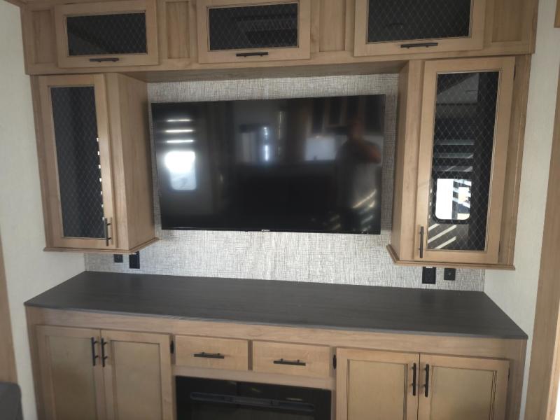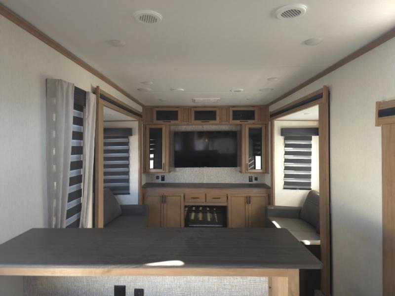 Pack your bags and head across the country in this cozy fifth wheel for six. The rear living area includes two tri-fold sofas, a Smart TV, 55" theater seating for two, plus two cabinets, making this space a second bedroom at night for guests. In the morning, you can prepare breakfast on the three burner range, then dine together at the free-standing table with bench seating and two chairs. There is plenty of storage space here, including a pantry, a hutch, and overhead cabinets. The full bath will allow you to stay clean throughout your trip, and you'll feel right at home in the front private bedroom with a king bed. This model also includes an outside kitchen with a sink and a refrigerator for snacks, plus basement storage in front and back as well as a massive pass-thru storage below the living area for all your gear!