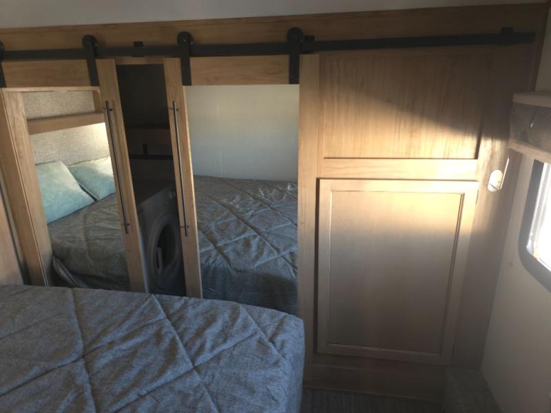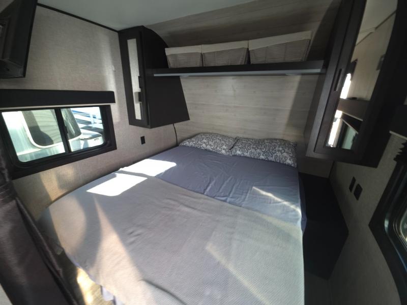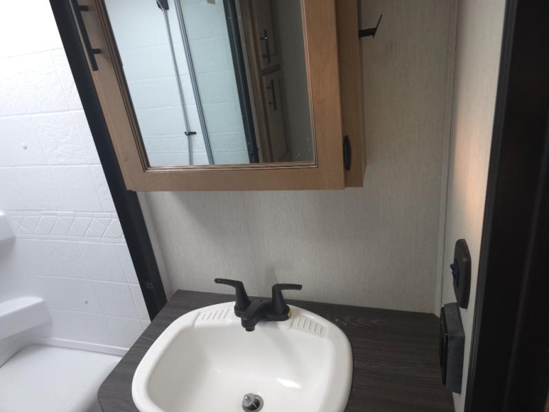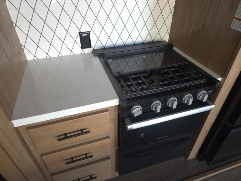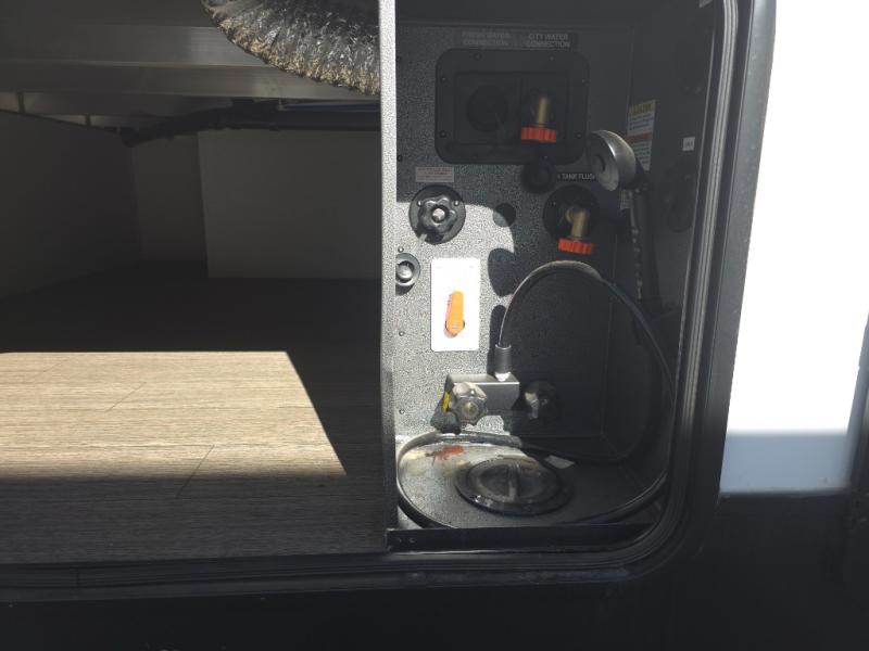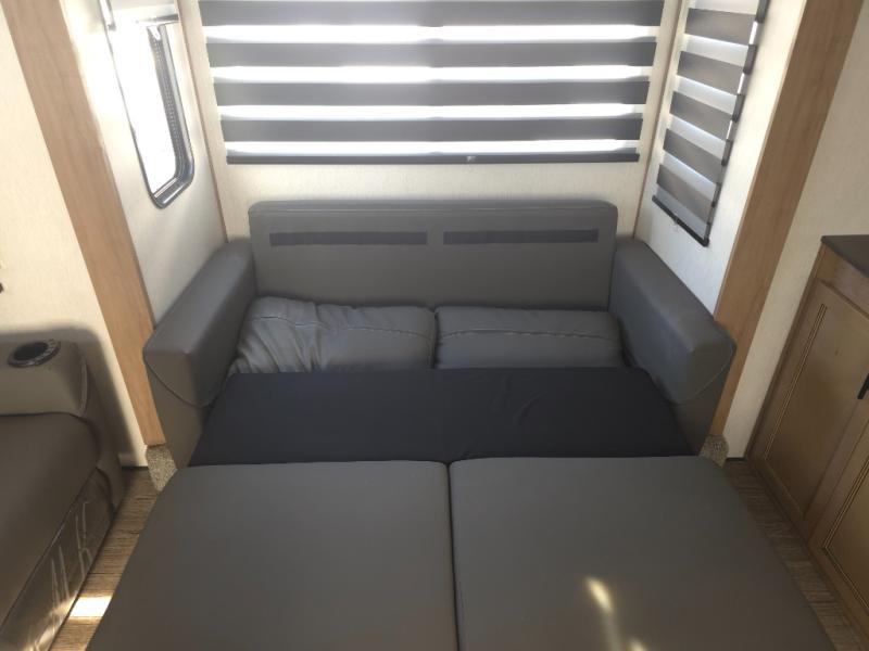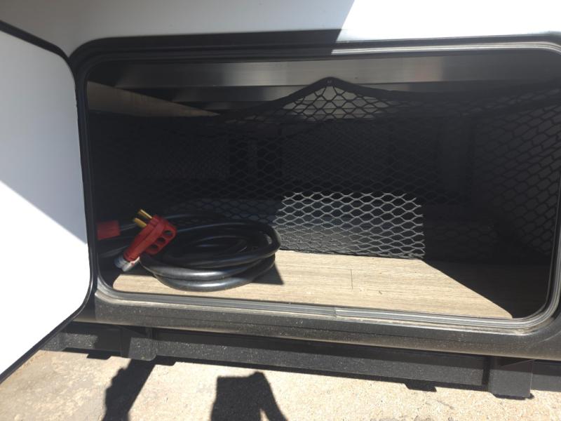 Pack your bags and head across the country in this cozy fifth wheel for six. The rear living area includes two tri-fold sofas, a Smart TV, 55" theater seating for two, plus two cabinets, making this space a second bedroom at night for guests. In the morning, you can prepare breakfast on the three burner range, then dine together at the free-standing table with bench seating and two chairs. There is plenty of storage space here, including a pantry, a hutch, and overhead cabinets. The full bath will allow you to stay clean throughout your trip, and you'll feel right at home in the front private bedroom with a king bed. This model also includes an outside kitchen with a sink and a refrigerator for snacks, plus basement storage in front and back as well as a massive pass-thru storage below the living area for all your gear!