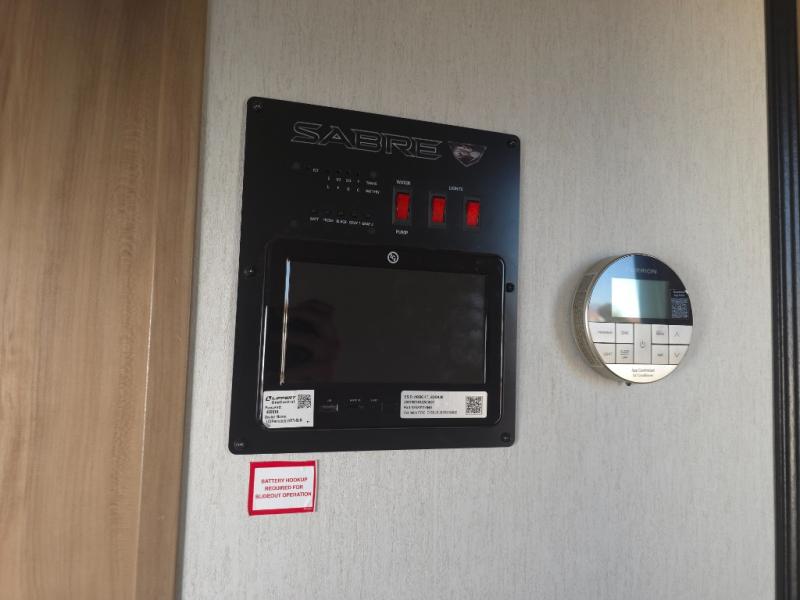 You will experience luxurious camping trips at an affordable price with any one of these Forest River Sabre fifth wheels! These models are durable and ready to travel anytime of the year thanks to features like the high-gloss gel-coat front cap with LED lighting, the PVC roof membrane, and the forced air underbelly with enclosed gate valves. The electric auto-leveling system makes setting up easy and safe, and the adjustable power awning with LED lighting will create an inviting outdoor living space. Each model includes a universal docking station which includes a black tank flush and an outside shower, and the backlit "Secure Step" landing for you to enter and exit the unit safely. Inside, you will love the design of the ambient accent lighting above the crown molding in the living area, the real wood lumbercore cabinetry, and the vintage gaslight decorative lighting!
