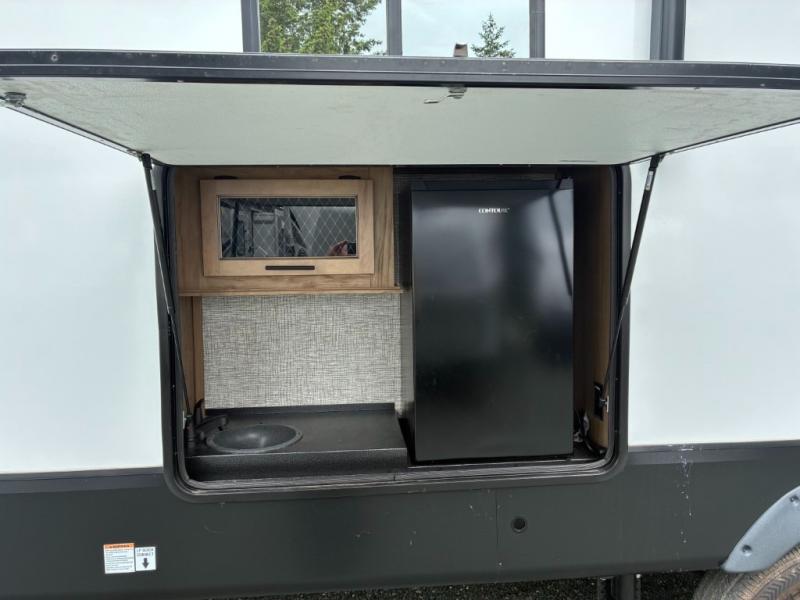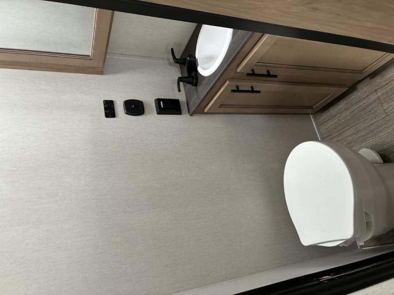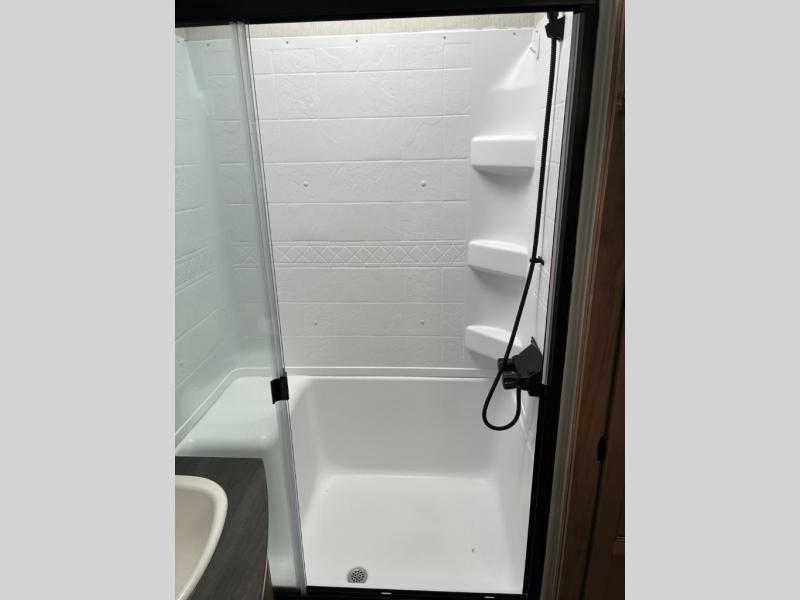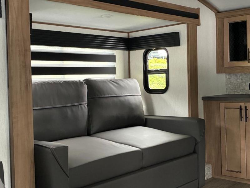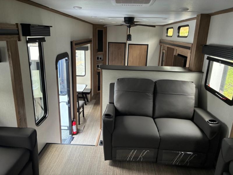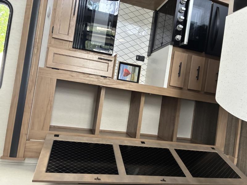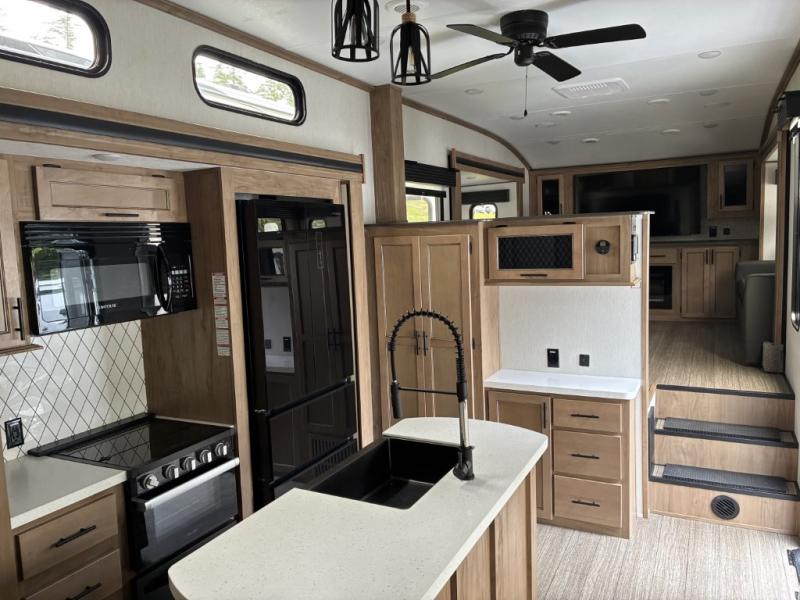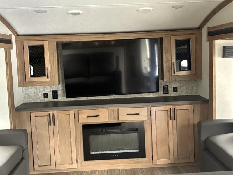 This Sabre fifth wheel with a full and half bath is sure to be a crowd pleaser! The front living area is the perfect place for everyone to visit each other comfortably on the two tri-fold sofas that can be transformed into extra sleeping spaces, or at the theater seating for complete relaxation. You will also find an entertainment center with a fireplace and a Smart TV. This Sabre has a kitchen filled with convenient features, such as a 12V refrigerator with French doors, a kitchen island, and a lighted pantry with motion sensors. The rear master suite has access to its very own full bathroom with a double-sink vanity for two to get ready at once, and a wardrobe that is prepped for an optional washer and dryer to be added for convenience!