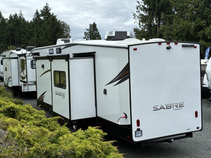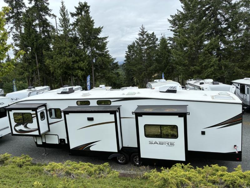 You will experience luxurious camping trips at an affordable price with any one of these Forest River Sabre fifth wheels! These models are durable and ready to travel anytime of the year thanks to features like the high-gloss gel-coat front cap with LED lighting, the PVC roof membrane, and the forced air underbelly with enclosed gate valves. The electric auto-leveling system makes setting up easy and safe, and the adjustable power awning with LED lighting will create an inviting outdoor living space. Each model includes a universal docking station which includes a black tank flush and an outside shower, and the backlit "Secure Step" landing for you to enter and exit the unit safely. Inside, you will love the design of the ambient accent lighting above the crown molding in the living area, the real wood lumbercore cabinetry, and the vintage gaslight decorative lighting!