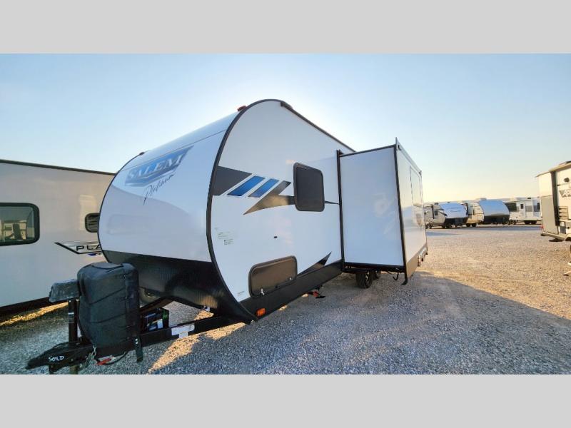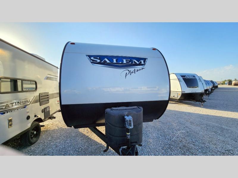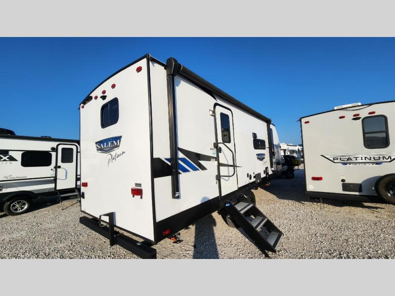Set your sights on this Salem Platinum Edition travel trailer that can comfortably sleep four people which makes it the perfect unit for a small family. After you've set up camp and had a look around the campground, come back to this unit to enjoy lunch or take a quick rest. The chef of the family can cook on the three-burner cooktop or make something quick in the microwave, and the 8' chaise lounge will be a perfect spot to relax or play a game of cards. You'll appreciate the full rear bath that includes a walk-in shower and a closet for extra towels. This unit also features a front private bedroom with a custom king bed that you are sure to love, and you'll find plenty of storage space throughout, including an exterior pass-through compartment for the fishing poles.