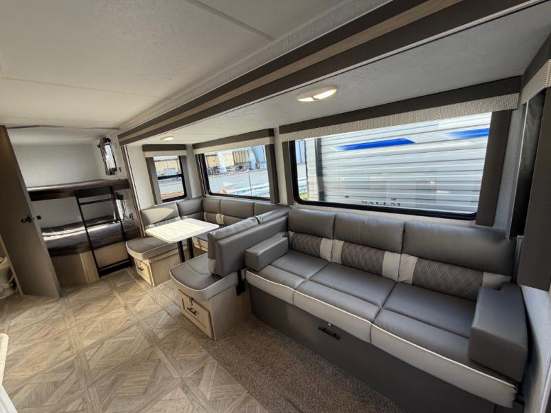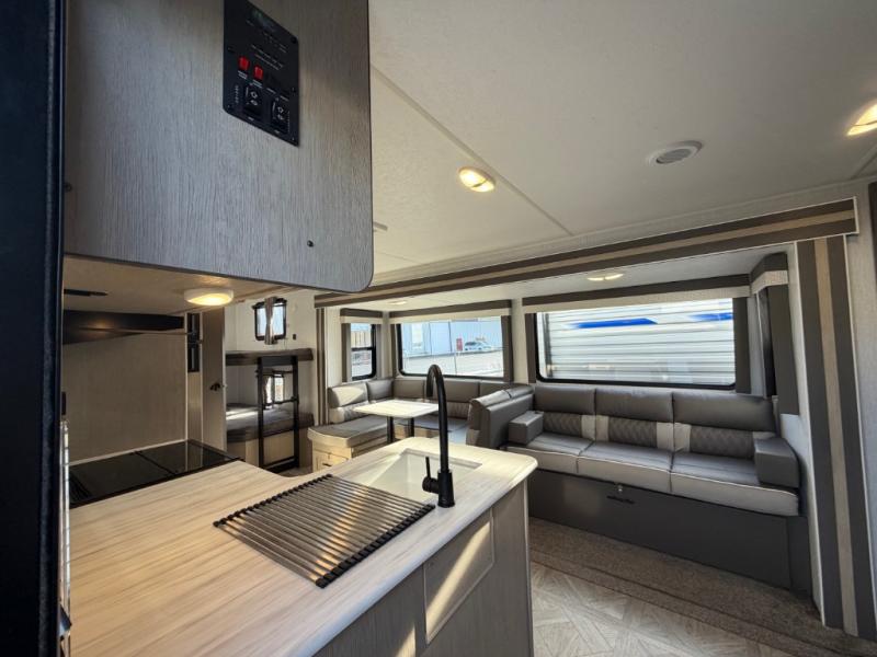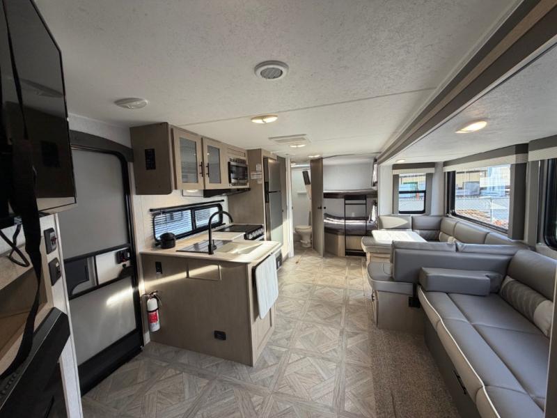 Inside, a large slide-out expands your living space, housing a U-shaped dinette and a cozy sofa—ideal for meals, lounging, or game nights. The full kitchen features an undermount sink, cooktop, refrigerator, and two pantries, including a walk-in, giving you plenty of storage for extended stays. The double-size rear bunks are perfect for kids, guests, or both, and they're conveniently located right next to the full bathroom.