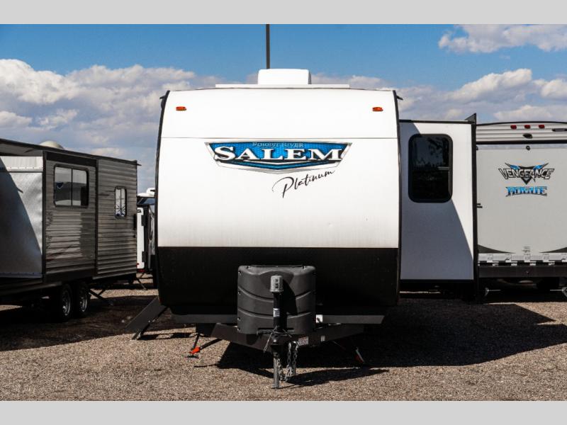 It's time to check out this exciting and full-featured Salem Platinum Edition travel trailer! This unit provides two separated sleeping spaces; a rear private bunkhouse and a front private bedroom. Another feature that is just as helpful as the one in your own home is the kitchen. With an 11 cu. ft. frost free refrigerator, a three burner cooktop, a double sink, and abundant cabinet storage, you will be able to create delicious meals for the entire family. Plus, if you prefer to have a sunrise breakfast, you can simply take your preparations outside to the outdoor kitchen!