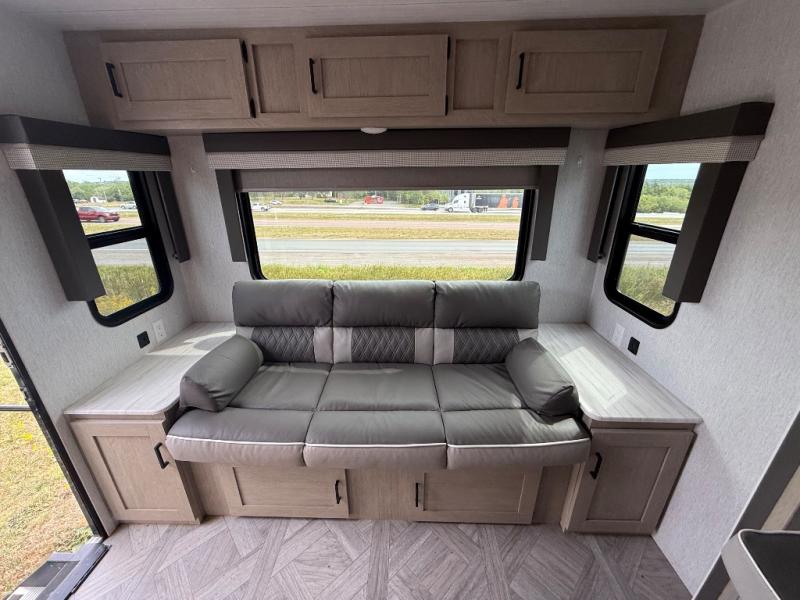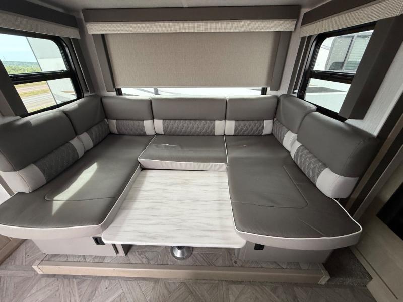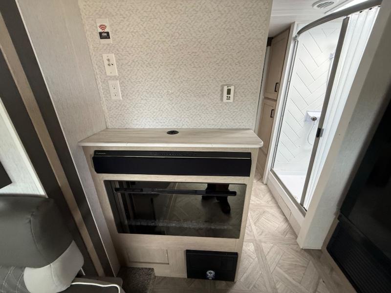This travel trailer is packed full of features, but is still lightweight coming in at just over 5,000 lbs.! You will feel right at home in the front master bedroom with a custom king bed that has closets on either side, CPAP storage, and a walk-in closet to keep your clothes looking their best. The walk-through bathroom has a walk-in shower with fiberglass surround and a skylight above for added natural lighting as you get ready. The U-shaped dinette slide has a panoramic window for you to enjoy your beautiful scenery as you eat dinner, and there is a fireplace at the entertainment center for a relaxing evening indoors. There is a pass-through storage area to store your outdoor camping gear, and a 16' power awning and exterior speakers to crank up the tunes!