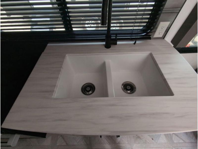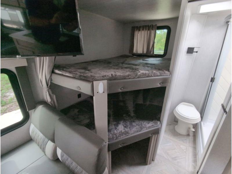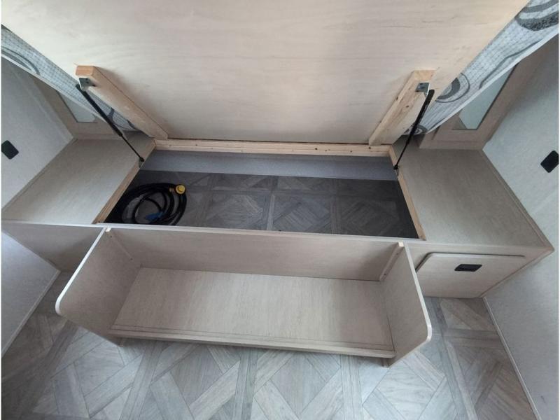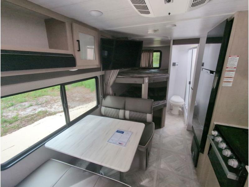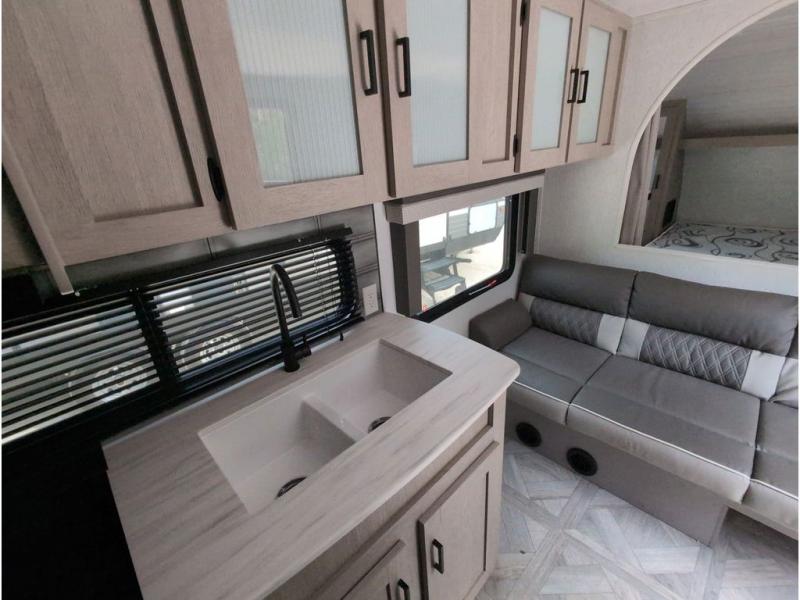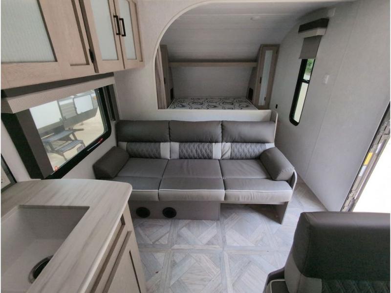 Load up this light weight travel trailer with double-size bunks and head to your favorite campsite! There is plenty of seating and sleeping spaces between the rear bunks, the custom king bed, the booth dinette, and the sofa. The front bed has closets on either side of it and a privacy curtain to draw at night. The oversized 11 cu. ft. refrigerator will keep your perishables fresh and the three burner cooktop is just waiting for you to prepare a delicious home cooked meal. And you might want to add the optional outside kitchen for a sunrise breakfast!