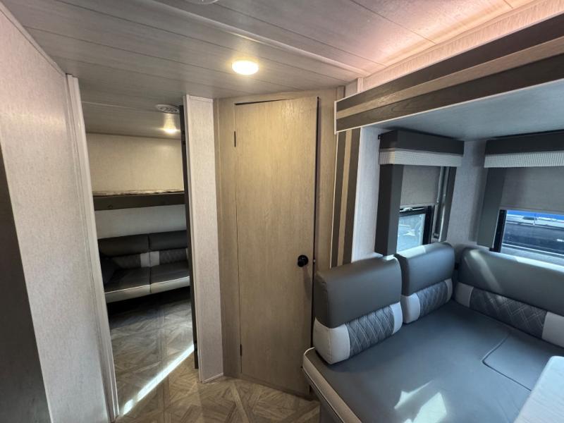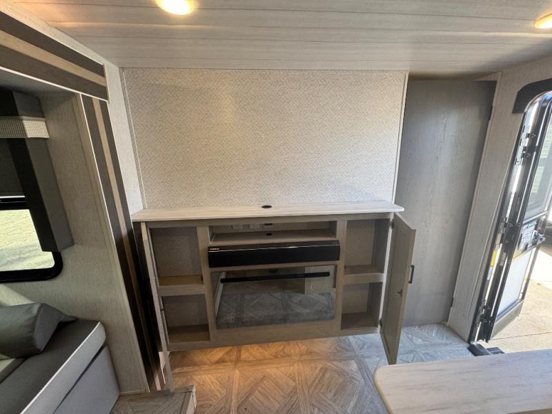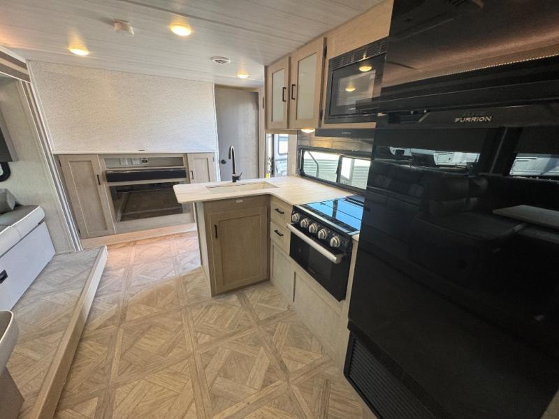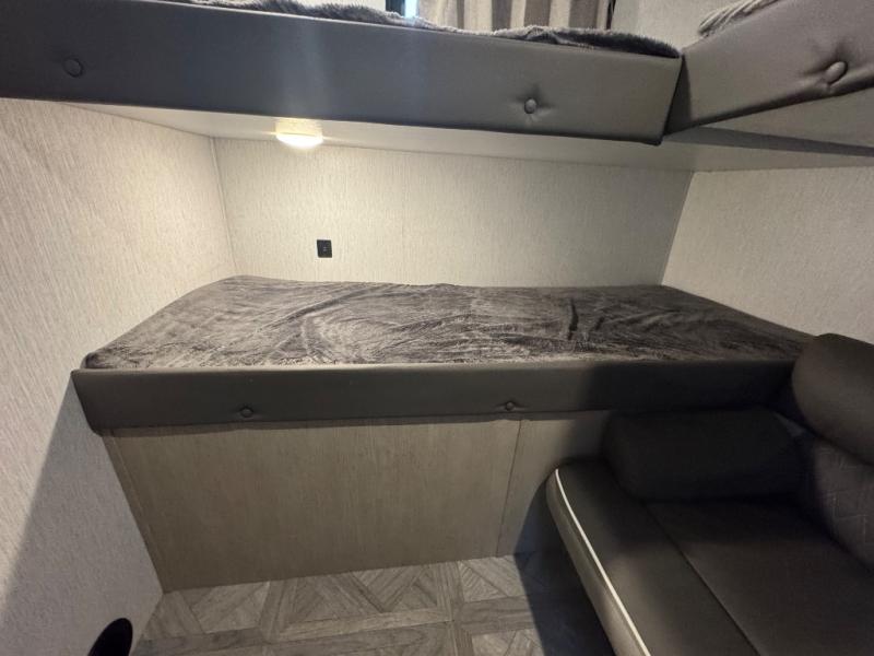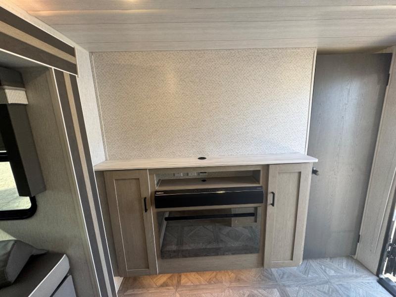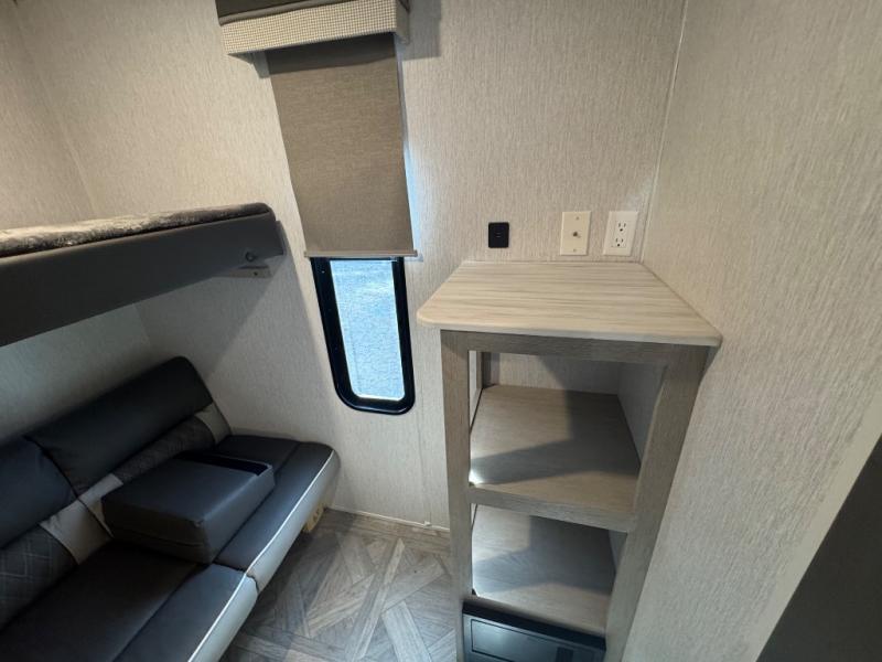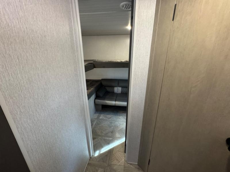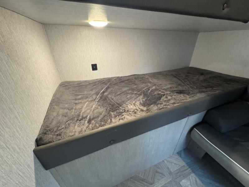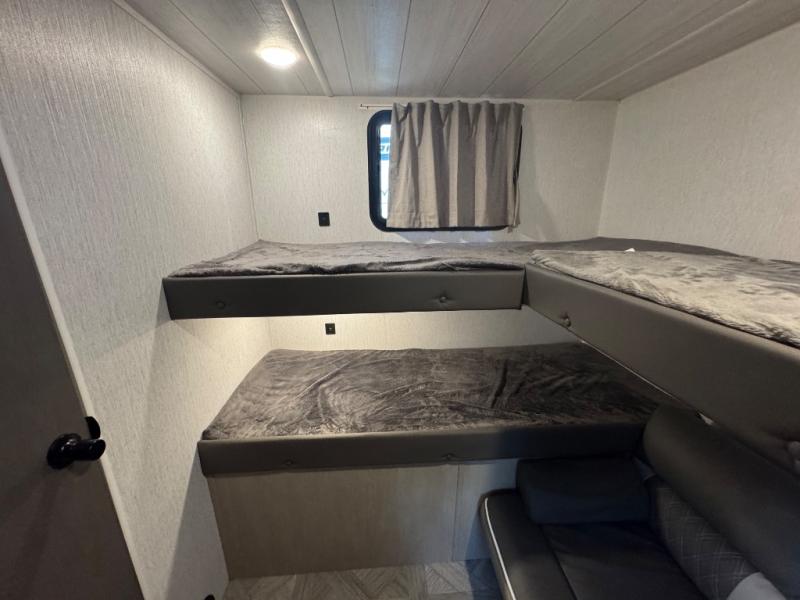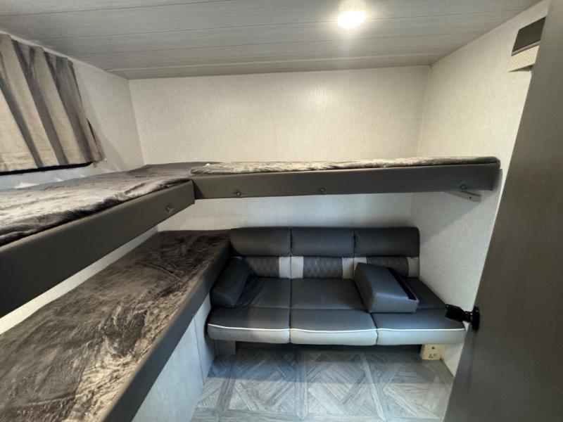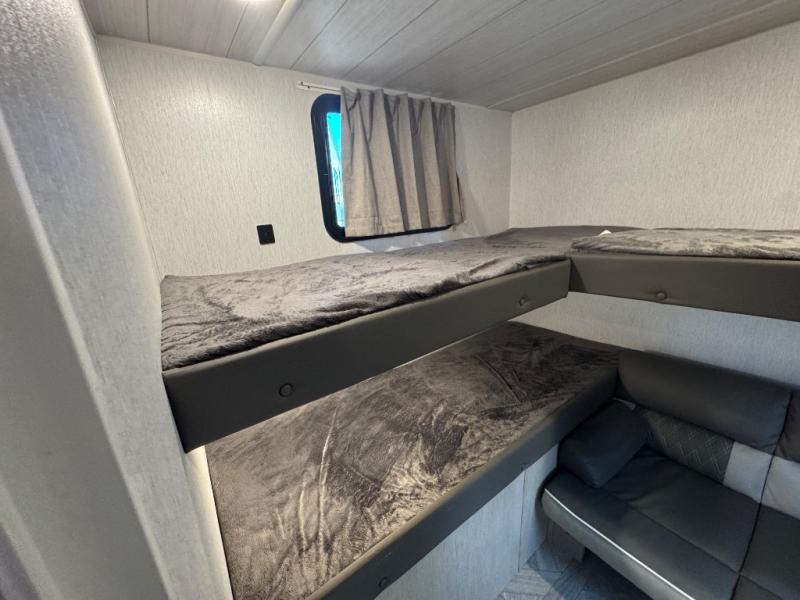 This versatile bunkhouse travel trailer is big enough for the whole family, but still light in weight! The private bunkhouse has a set of 30" x 74" bunk beds and a 30" x 74" bunk bed above a Jiffy sofa. Just outside the bunkhouse is a pantry big enough to store everyone's favorite snacks, and a full bathroom with a walk-in shower. The three burner cooktop is just waiting for you to create a delicious meal, and the U-shaped dinette welcomes everyone to enjoy each meal in comfort, plus there is a large panoramic window for a perfect view of your surroundings. Any time of day kick back on the Versa-lounge and relax by the fireplace at the entertainment center. The exterior features a pass-through storage area for you to keep your outdoor camping gear stowed away when not in use, a 16' power awning to protect you, and an exterior camp kitchen!