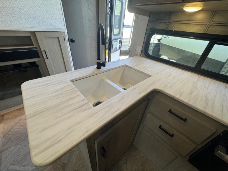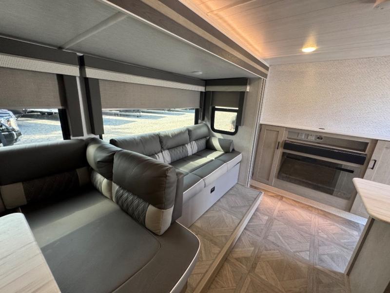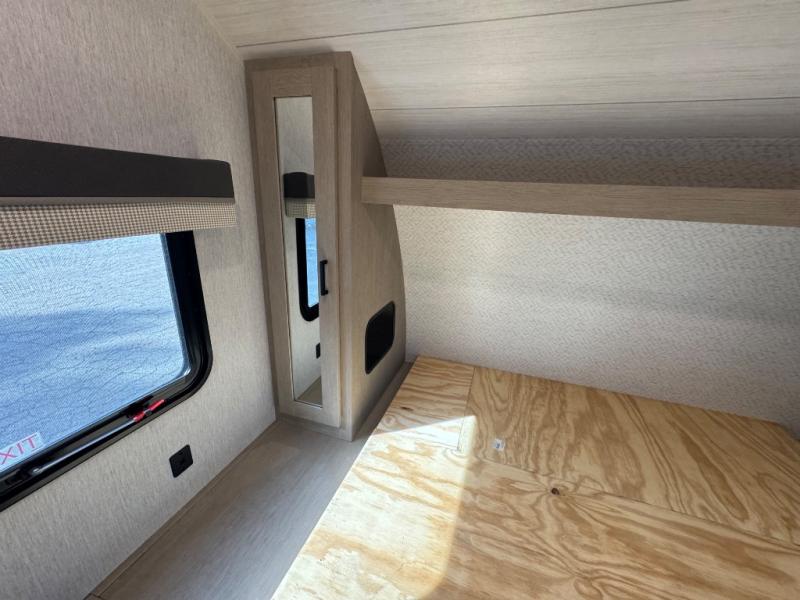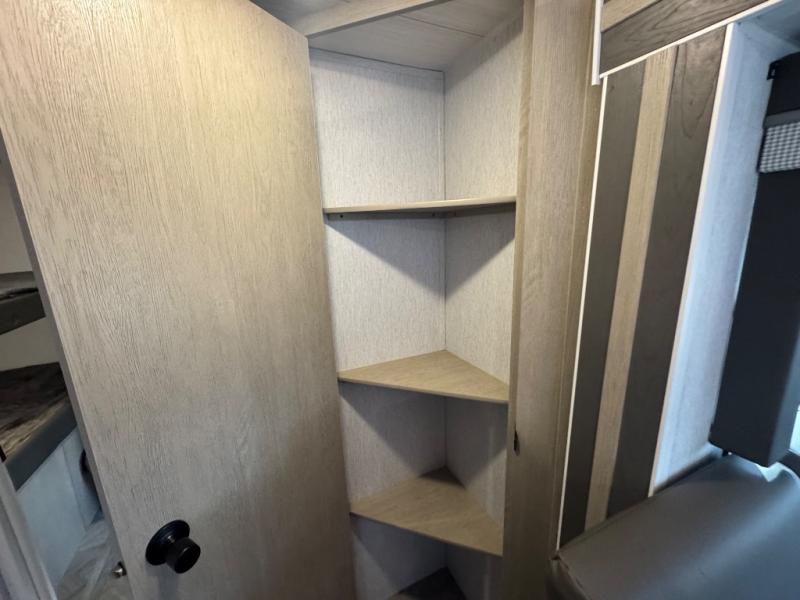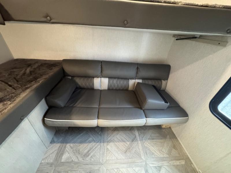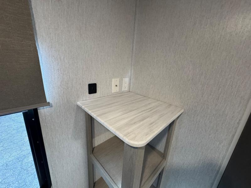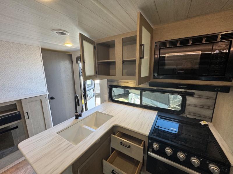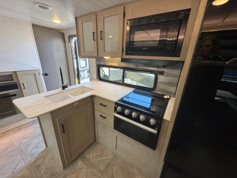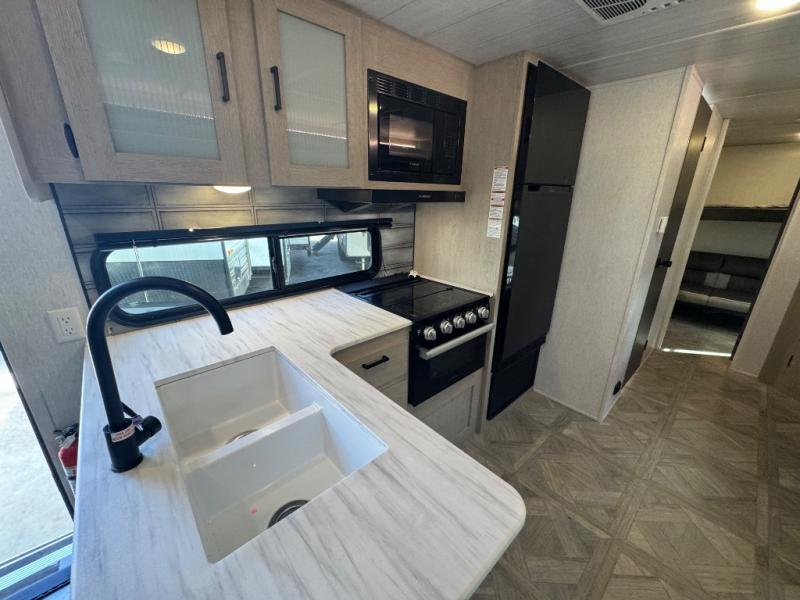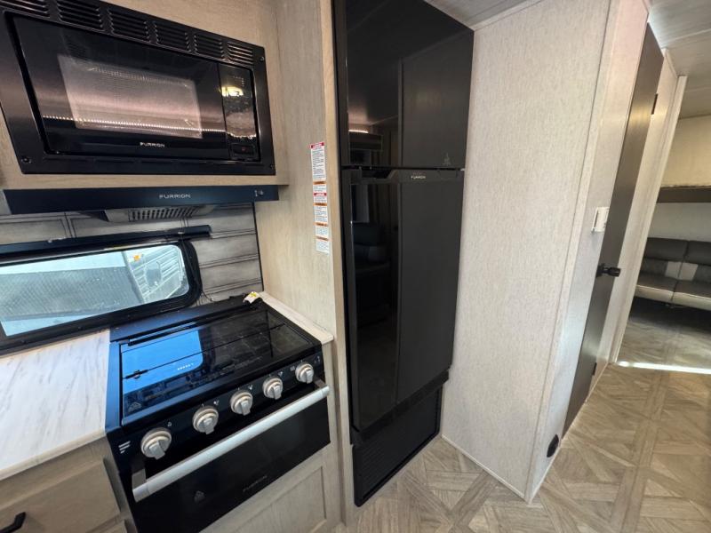 This versatile bunkhouse travel trailer is big enough for the whole family, but still light in weight! The private bunkhouse has a set of 30" x 74" bunk beds and a 30" x 74" bunk bed above a Jiffy sofa. Just outside the bunkhouse is a pantry big enough to store everyone's favorite snacks, and a full bathroom with a walk-in shower. The three burner cooktop is just waiting for you to create a delicious meal, and the U-shaped dinette welcomes everyone to enjoy each meal in comfort, plus there is a large panoramic window for a perfect view of your surroundings. Any time of day kick back on the Versa-lounge and relax by the fireplace at the entertainment center. The exterior features a pass-through storage area for you to keep your outdoor camping gear stowed away when not in use, a 16' power awning to protect you, and an exterior camp kitchen!
