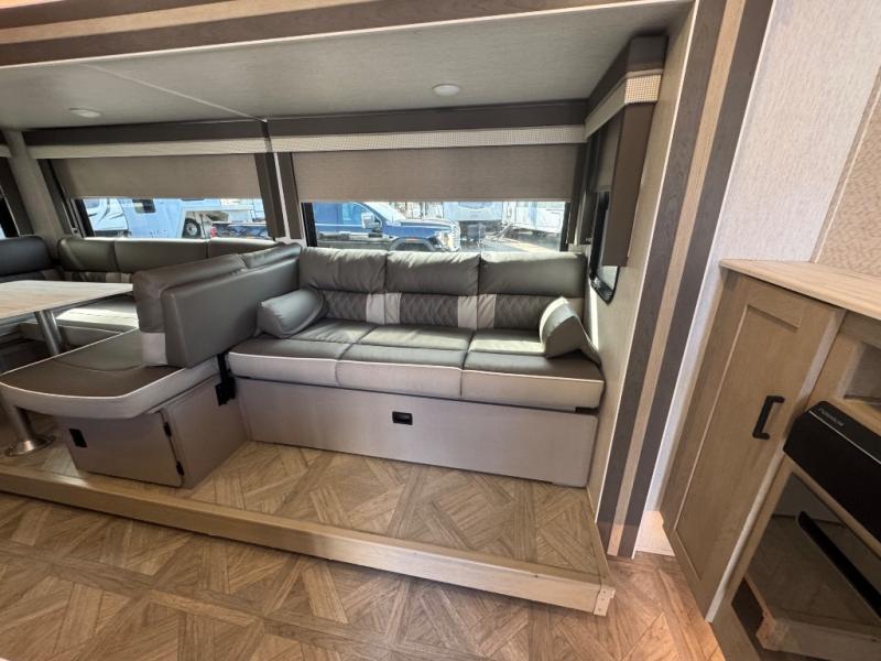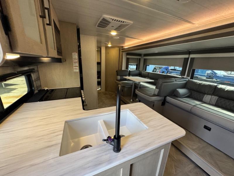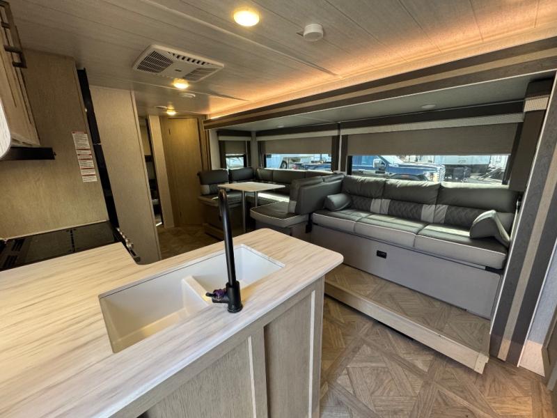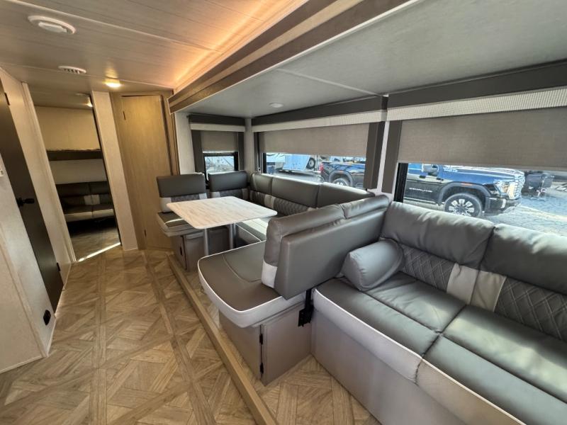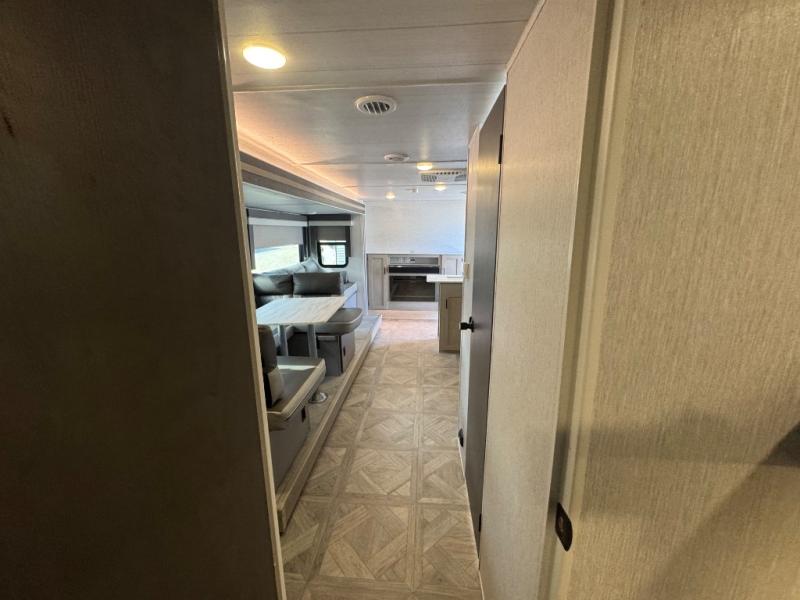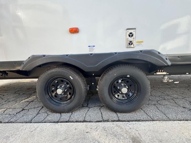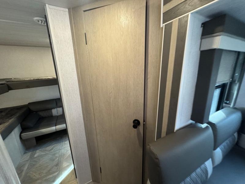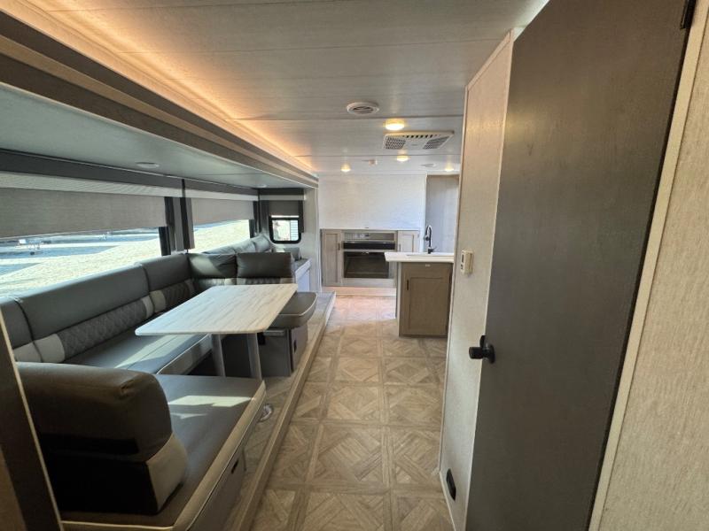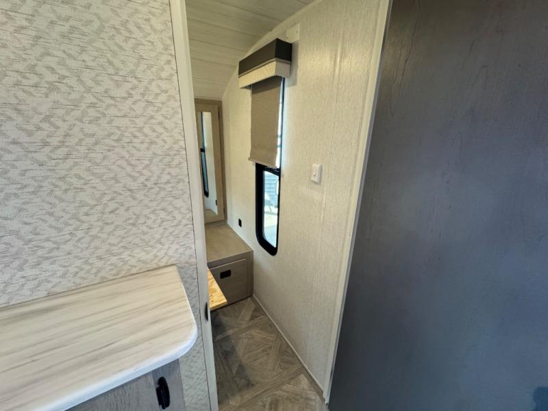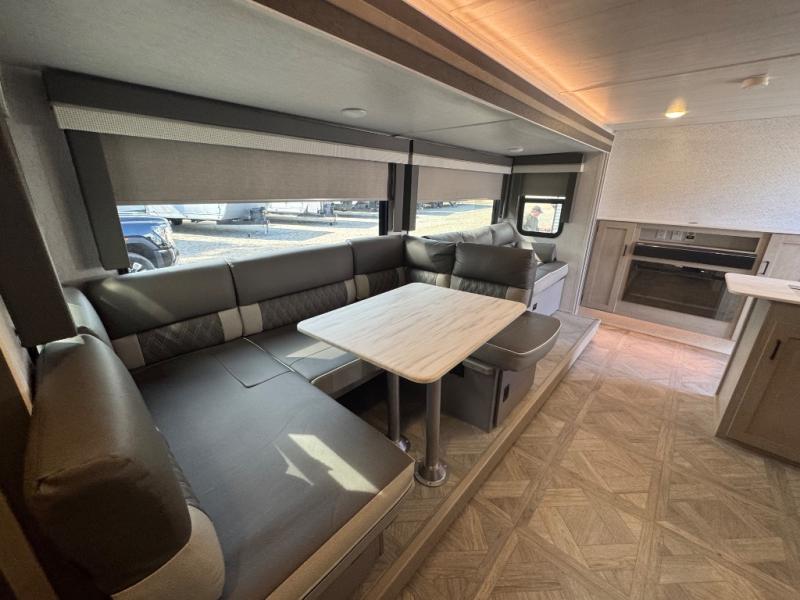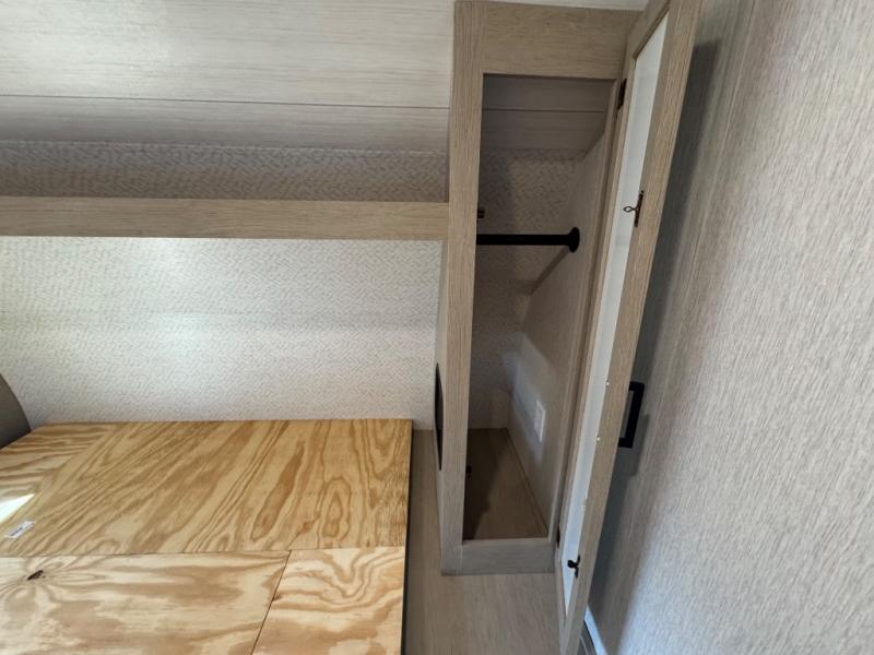 This versatile bunkhouse travel trailer is big enough for the whole family, but still light in weight! The private bunkhouse has a set of 30" x 74" bunk beds and a 30" x 74" bunk bed above a Jiffy sofa. Just outside the bunkhouse is a pantry big enough to store everyone's favorite snacks, and a full bathroom with a walk-in shower. The three burner cooktop is just waiting for you to create a delicious meal, and the U-shaped dinette welcomes everyone to enjoy each meal in comfort, plus there is a large panoramic window for a perfect view of your surroundings. Any time of day kick back on the Versa-lounge and relax by the fireplace at the entertainment center. The exterior features a pass-through storage area for you to keep your outdoor camping gear stowed away when not in use, a 16' power awning to protect you, and an exterior camp kitchen!