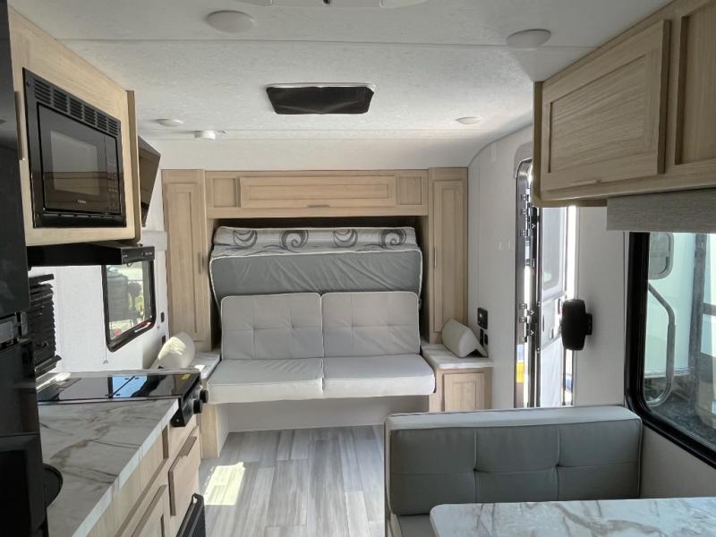 This compact travel trailer may only be 3,000 lbs. but it is still feature-packed! The front Murphy bed has a queen bed to sleep on at night and a sofa with storage access to sit on during the day. Grab some eggs from the 11 cu. ft. frost free refrigerator then fry them up on the two burner cooktop and enjoy them at the booth dinette with a large window to look out at your beautiful scenery. Freshen up each morning in the full rear bathroom with the shower with a skylight and keep the dirt outside where it belongs with the outside shower with hot and cold water. You will also enjoy the 12' power awning with LED lights that will allow you to visit outdoors each evening!