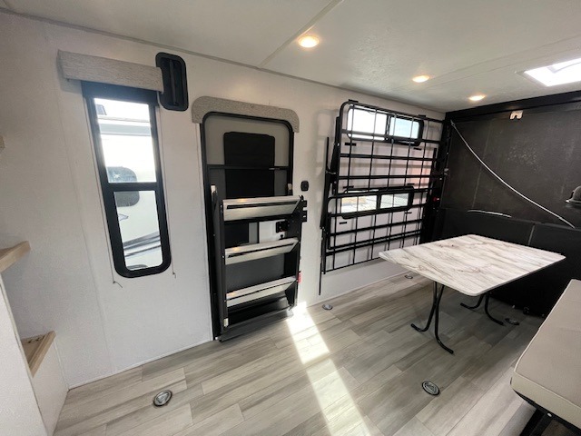 You can bring along your favorite ride-on toys in this MAX toy hauler with a 12' separate garage! Your guests will enjoy two flip-out sofas, a free-standing table, plus one of the dual entry doors here for convenience. Head to the main living area/kitchen to find a tri-fold sofa with direct TV viewing, a bar with stools, plus plenty of counter space to prep meals. The front private bedroom includes a queen bed for a great night's rest, plus dual wardrobes to keep your clothes wrinkle-free. Head outdoors to find a 21' power awning with LED lights, an outside kitchen with a plus a 200 watt solar panel for off-grid camping!