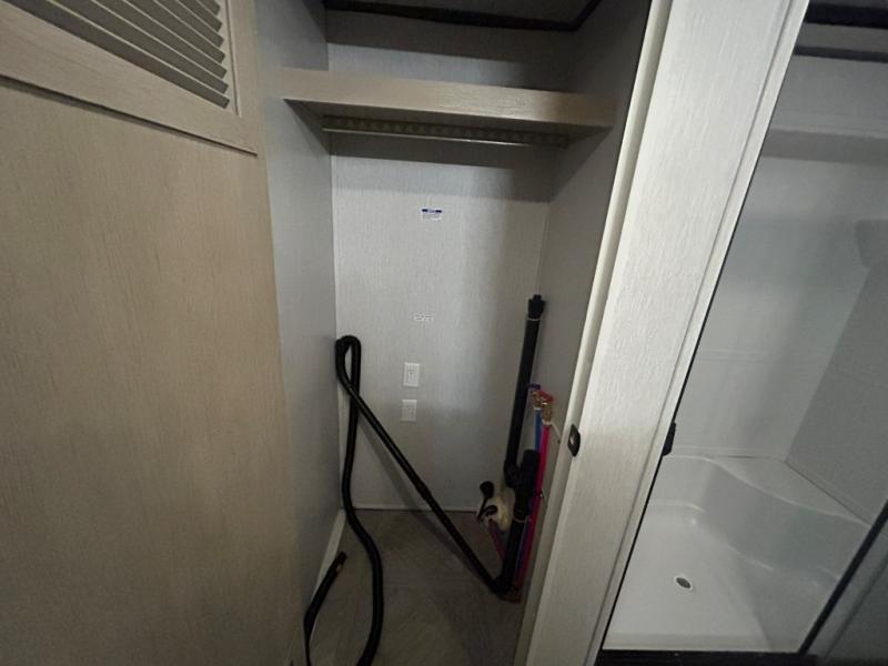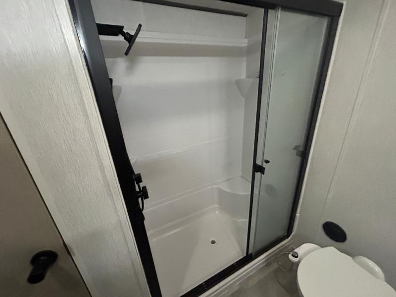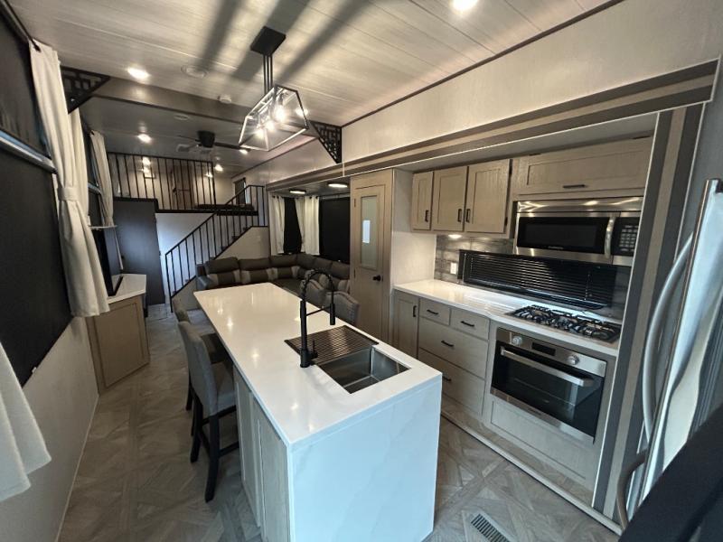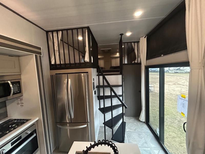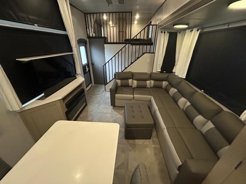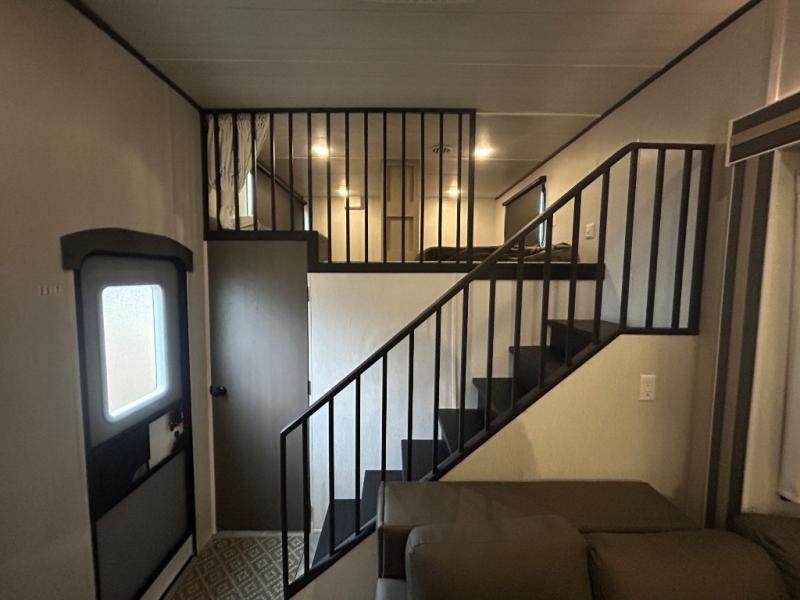 You will feel right at home in this destination trailer! It has not only has one loft in the rear with two 42" x 74" bunk mats, but also a second loft in the front with spiral steps leading up to two bunk mats. The front private bedroom has a custom king bed slide to lay your head on at night with front windows to let in lots of natural lighting and sunshine in the morning. Relax in true comfort at night on the L-shaped sectional sofa across from the entertainment center with a fireplace. The kitchen island provides extra space to prepare delicious meals and comes with four bar stools to enjoy your breakfast each morning. Everyone will stay squeaky clean with a walk-in shower in the rear private bedroom, plus there is an area prepped to add an optional washer and dryer. Head outside through either the patio door or the second entry/exit door each day!