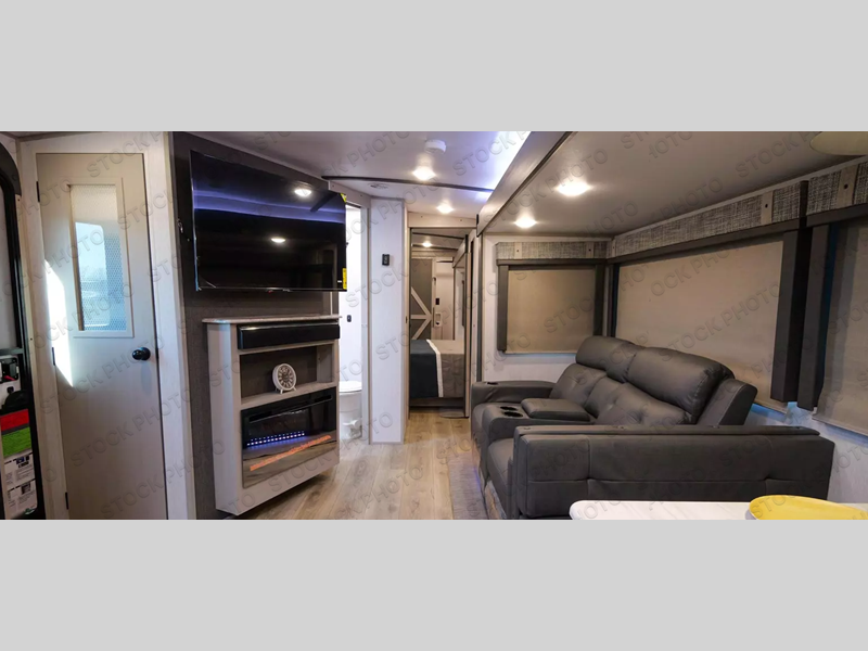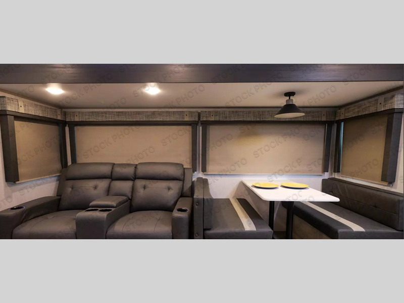 Once you step inside this dual entry travel trailer, you won't want to camp any other way! The rear private bedroom will have you feeling right at home with the custom king bed across from a dresser with a TV hookup, a large bedroom wardrobe, and there is even a closet that is prepped for you to add the optional washer and dryer. The dual entry bath makes it easy for everyone to access and it has a radius shower with a skylight above for added natural lighting as you get ready each morning. Both the theater seating and the booth dinette have a panoramic window for you to look out at your beautiful scenery. The chef of the group will love cooking in the front kitchen with all of the extra countertop space, as well as outdoors with the outside kitchen/bar!