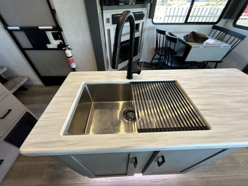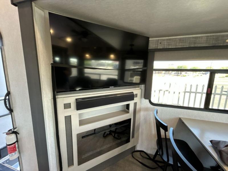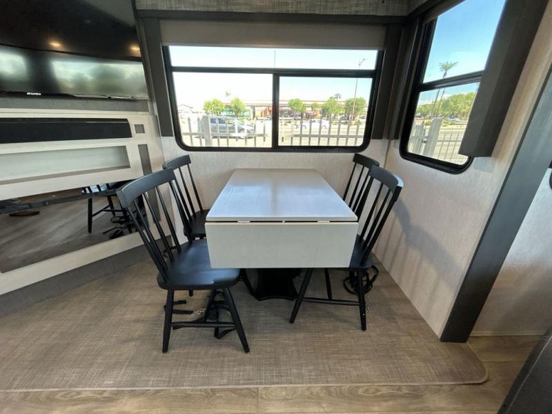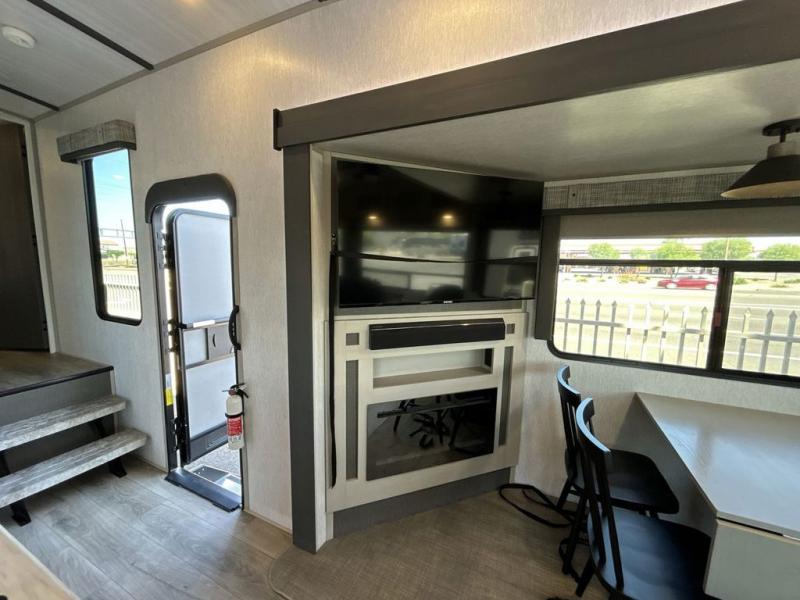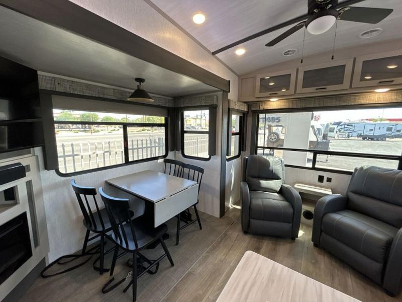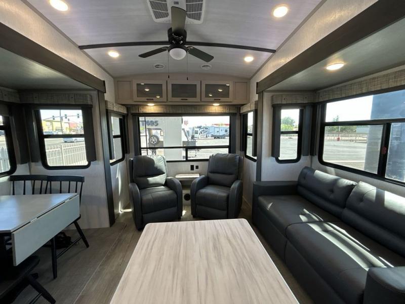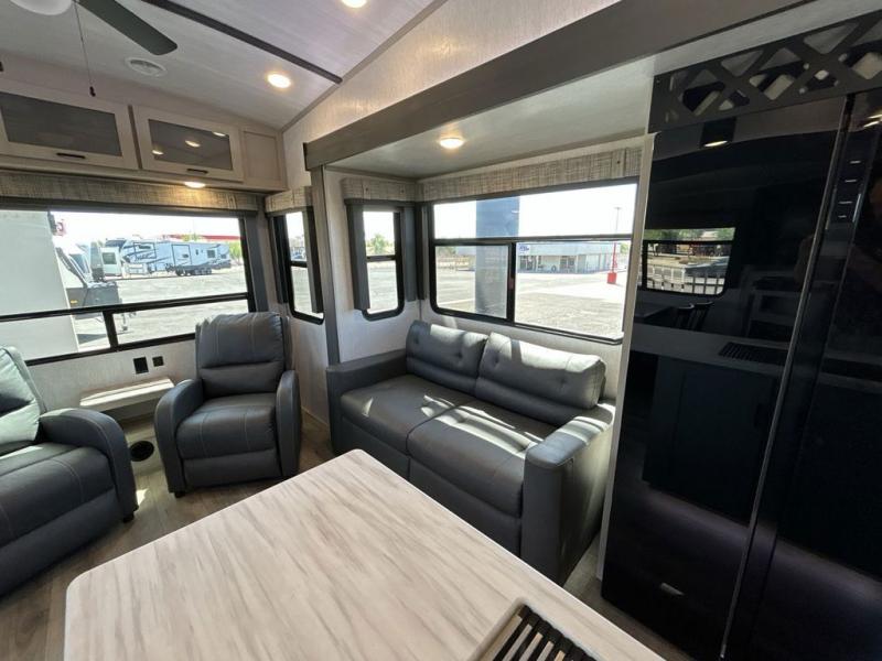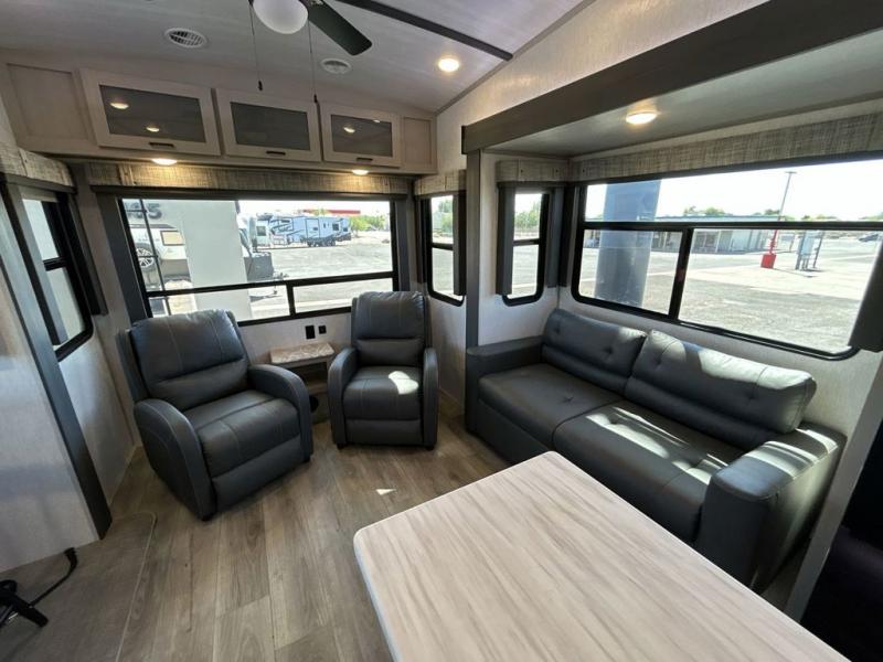 Enjoy the sunshine with panoramic windows throughout this fifth wheel! The rear living area is perfect for relaxing in at night on one of the two chairs or the tri-fold sofa. There is also a table with four chairs, a 50" LED TV, and a fireplace to make this area feel more like home. The kitchen has an island with a large sink to make clean up easier and a pantry big enough to store everyone's favorite snacks. The full bathroom has a residential walk-in shower with a seat and a skylight above for natural lighting as you get ready. When you're ready to hit the sack, head to the front private bedroom and enjoy a good night's rest on the custom king bed!