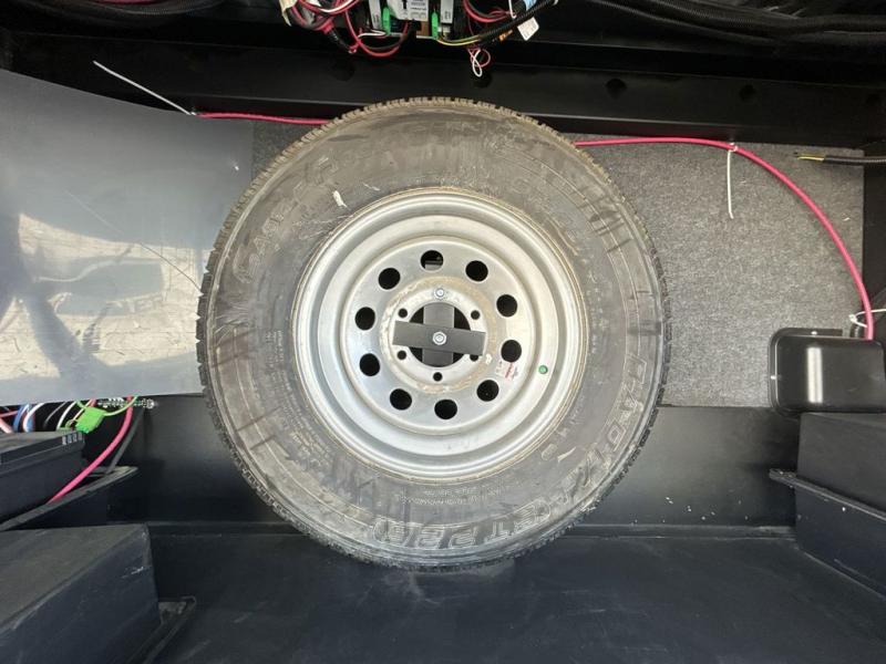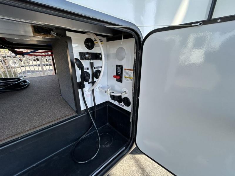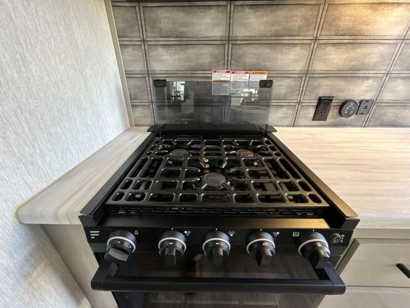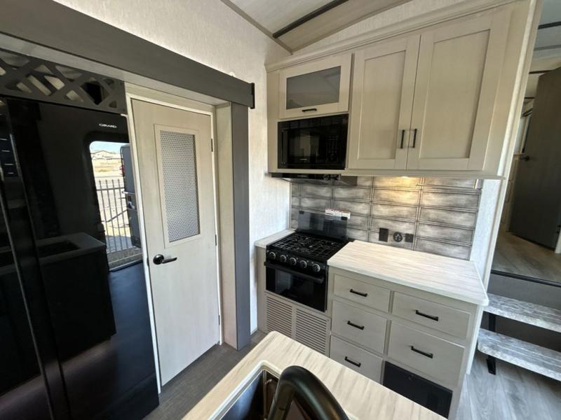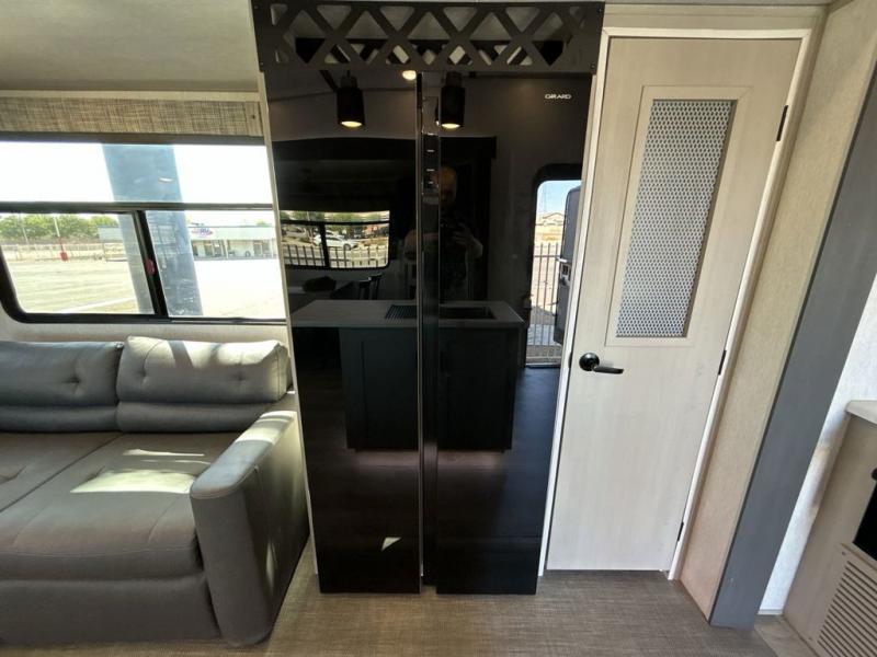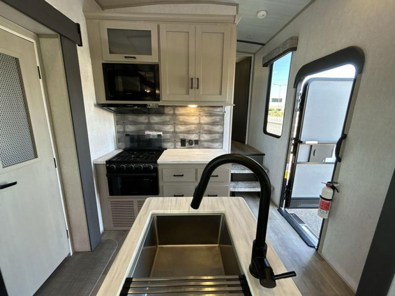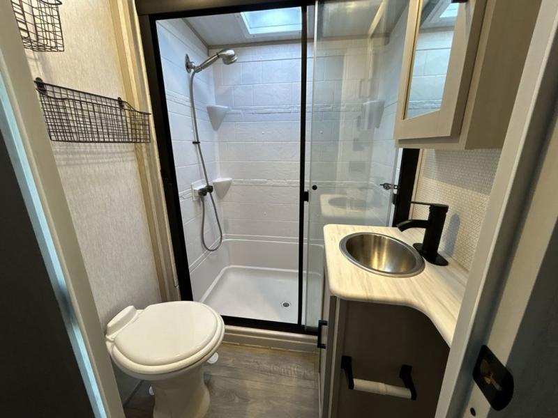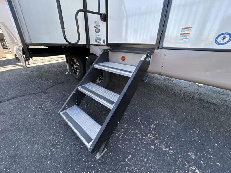 Enjoy the sunshine with panoramic windows throughout this fifth wheel! The rear living area is perfect for relaxing in at night on one of the two chairs or the tri-fold sofa. There is also a table with four chairs, a 50" LED TV, and a fireplace to make this area feel more like home. The kitchen has an island with a large sink to make clean up easier and a pantry big enough to store everyone's favorite snacks. The full bathroom has a residential walk-in shower with a seat and a skylight above for natural lighting as you get ready. When you're ready to hit the sack, head to the front private bedroom and enjoy a good night's rest on the custom king bed!
