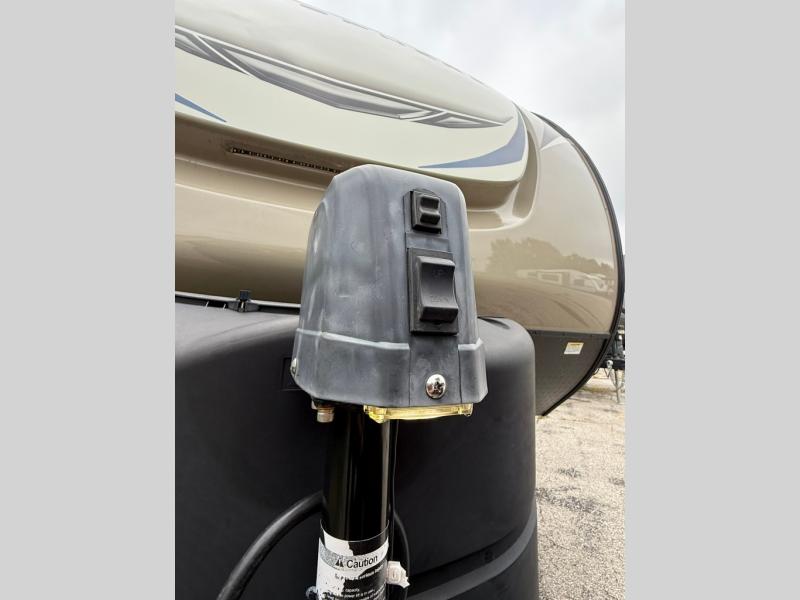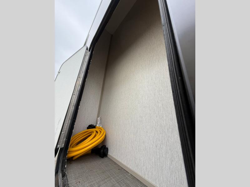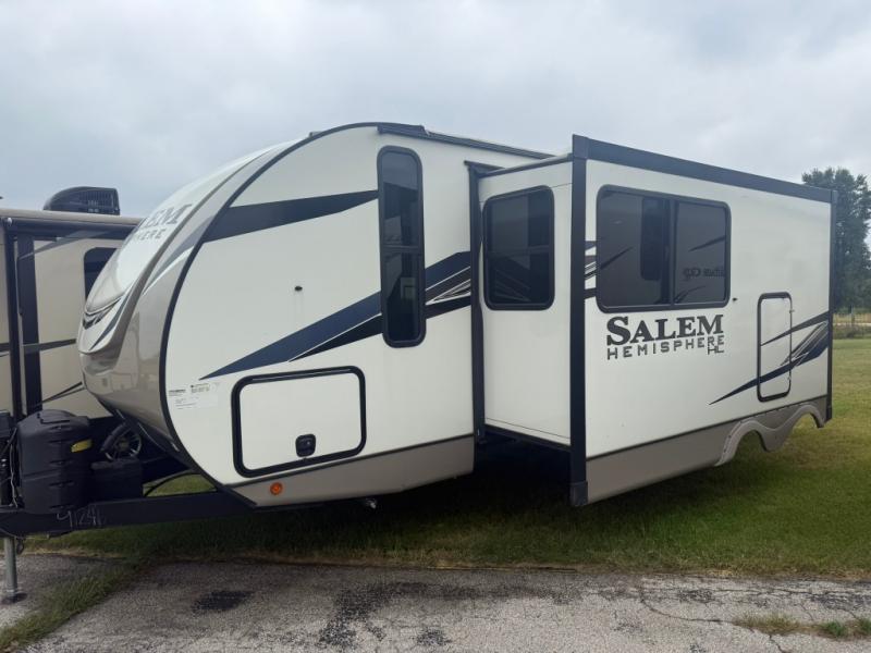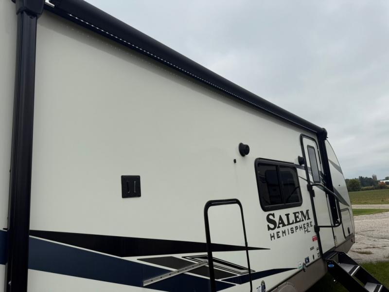 This Salem Hemisphere Hyper-Lyte trailer is perfect for a couple or even three or four if you don't mind converting the dinette for added sleeping space. You will love the panoramic windows that bring your surrounding views right inside, and on a sunny day keeps it light and airy along with the skylight overhead in the main living area as well as added space thanks to the large slide. Snuggle up each night on the RV queen bed for a great night's rest and enjoy the 30" x 36" walk-in shower with skylight as you wake. A 16' awning provides added living space and protection from the elements if you want to enjoy as much time outdoors as possible. Outside refrigerator, a LP quick-connect hook-up for your griddle/grill, and spray port for cleaning up. No worries about packing all of your fun games both inside and out, with the Texas size pass-through storage you can bring it all along!