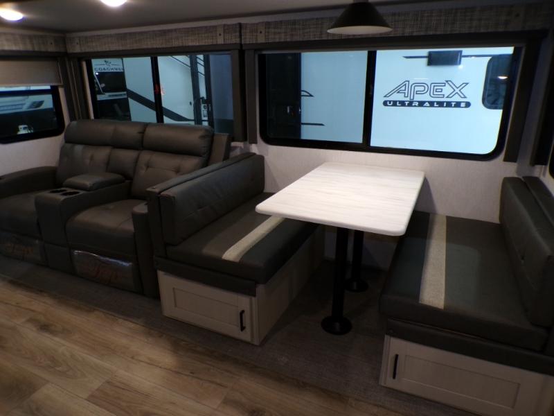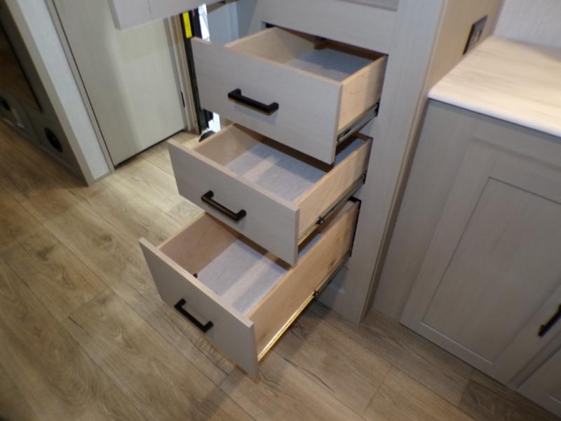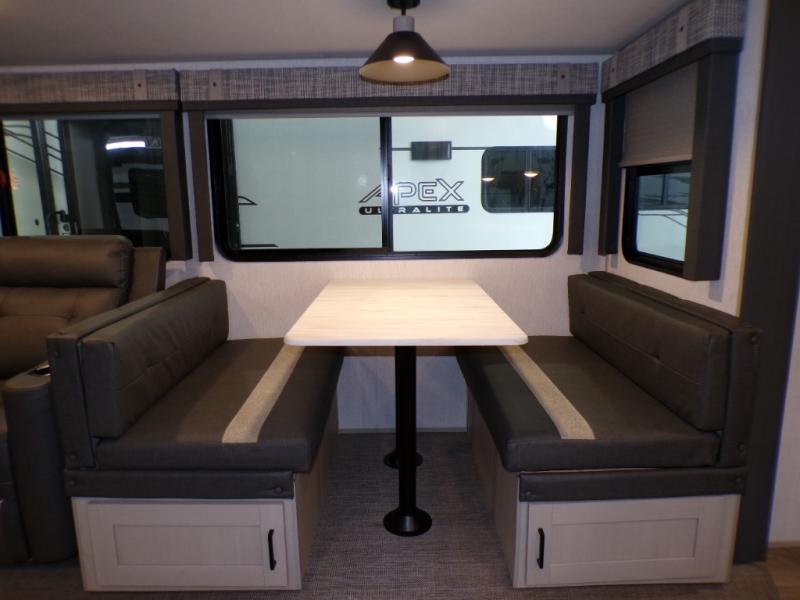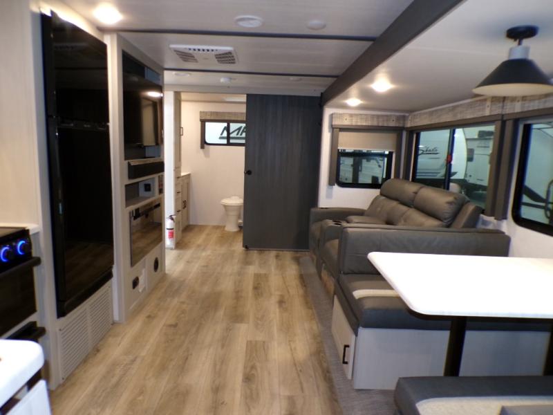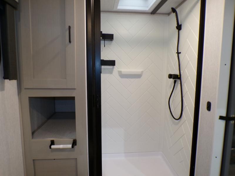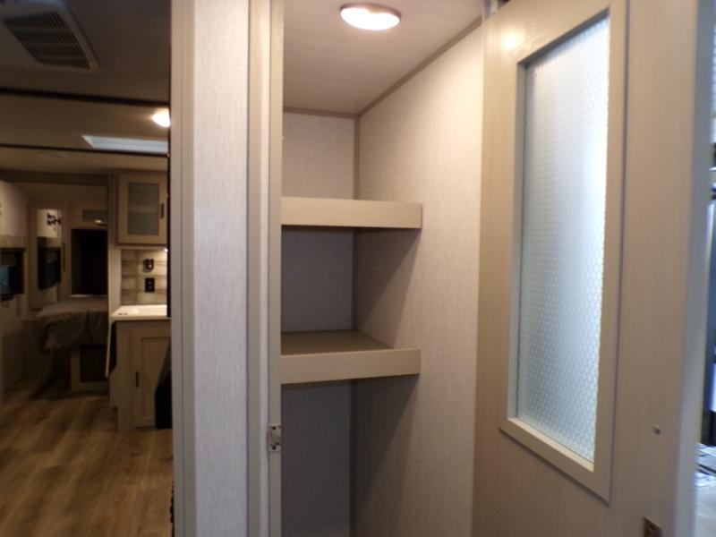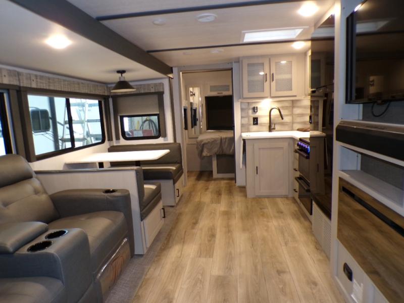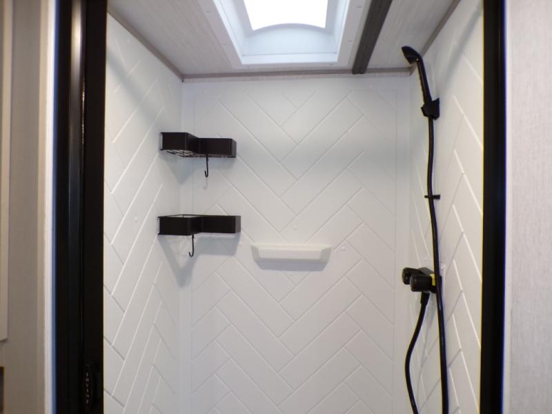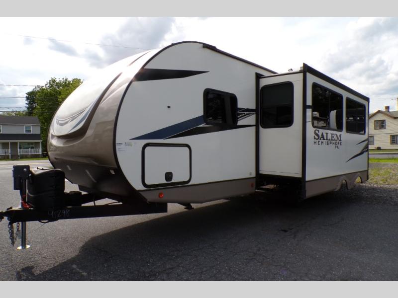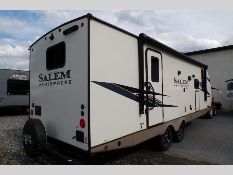 You will experience better gas mileage and a smoother ride with any one of these Forest River Salem Hemisphere Hyper-Lyte travel trailers! The stunning interiors include European Oak colored horizontal plank flooring for an easy clean up, beautiful saddle colored wood cabinetry, and matte black cabinet hardware. With a high efficiency A/C cooling system, you can be sure to stay cool even on the hottest summer day. The mandatory Upgraded Options package includes an outside shower to rinse the mud off before entering, a central switch center, and an ivory performance colored exterior fiberglass with smoked quartz metallic accents to turn heads while at the campsite!