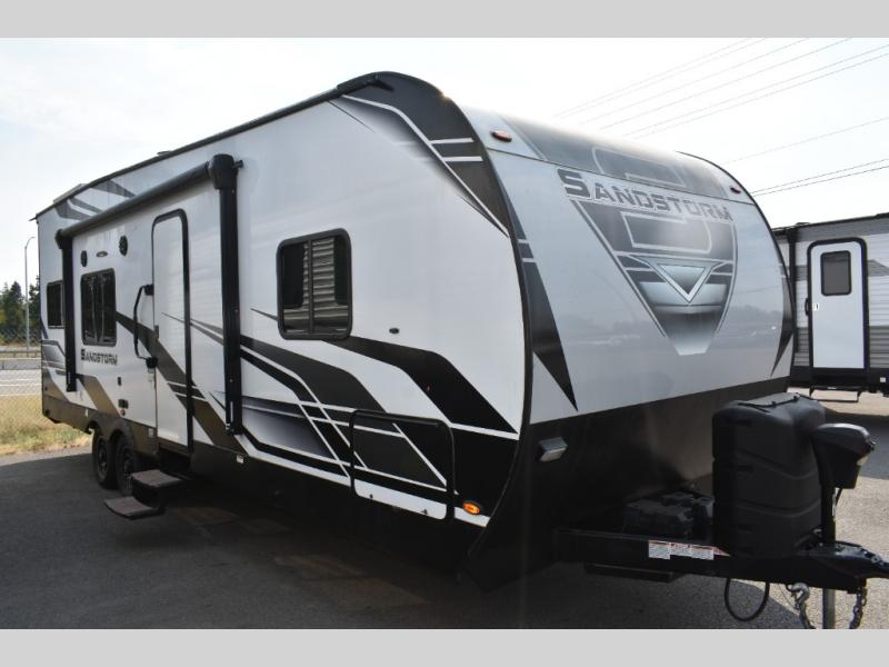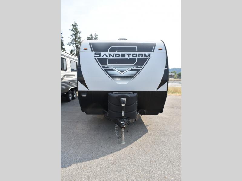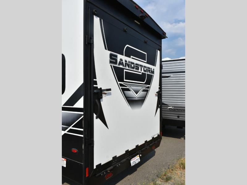Each Sandstorm toy hauler fifth wheel and travel trailer by Forest River features a 102" wide-body construction to bring along four-wheelers, dirt bikes, or kayaks! You will find convenient amenities, such as 220 watts of solar power and a regulator with power boost, a 35 gallon fuel station, an outside shower to wash off your gear, and more. There is also a power awning with LED lights outdoors to create an outdoor living space, plus heated and enclosed tanks to camp all year long. The interior includes LED accent lighting, black night shades throughout, and a glass shower to name a few comforts. And don't overlook the available options that can added to customize your toy hauler just the way you like it!