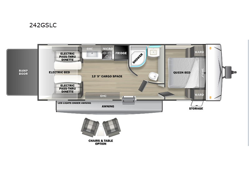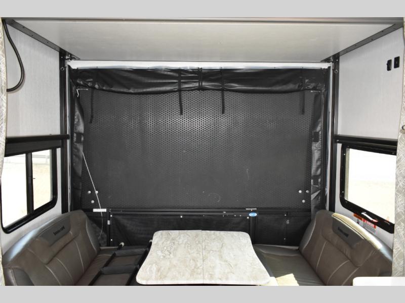 If you and your spouse enjoy hitting the trails, then this Sandstorm toy hauler with a fiberglass exterior is for you! You can easily load and unload your off-road toys with the 3,000 lb. ramp door, and the tie-downs are mounted into steel so that you can be sure your toys will arrive safely. When you're ready to wind down your nights, you can head into the front private bedroom and relax on the queen-size bed or entertain a few guests at the electric pass-through dinette which can also transform into an extra sleeping space. You can even choose to add the optional chairs with table for a comfortable place to read a book at night!
