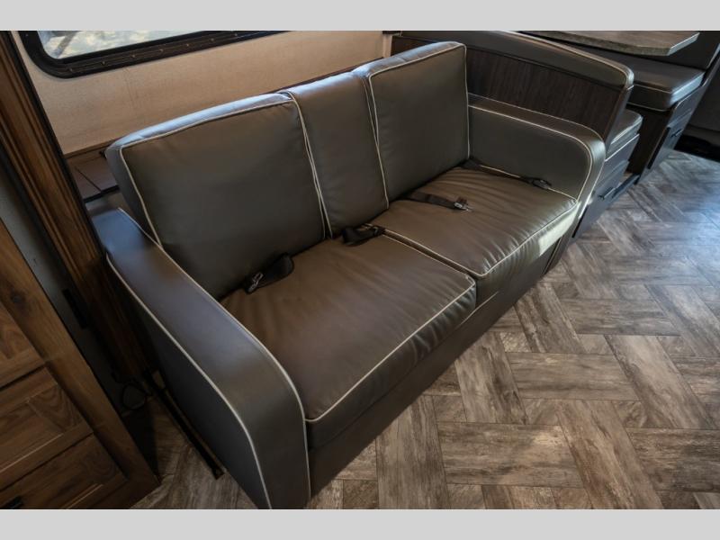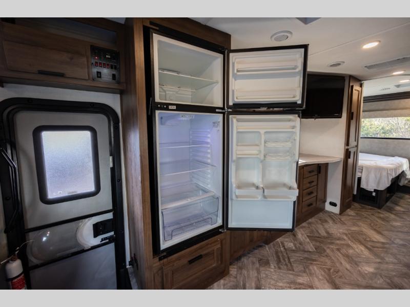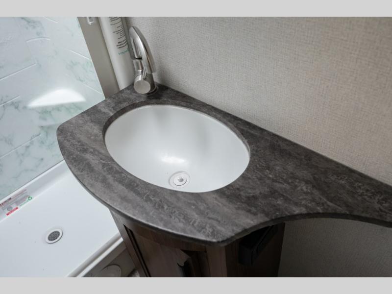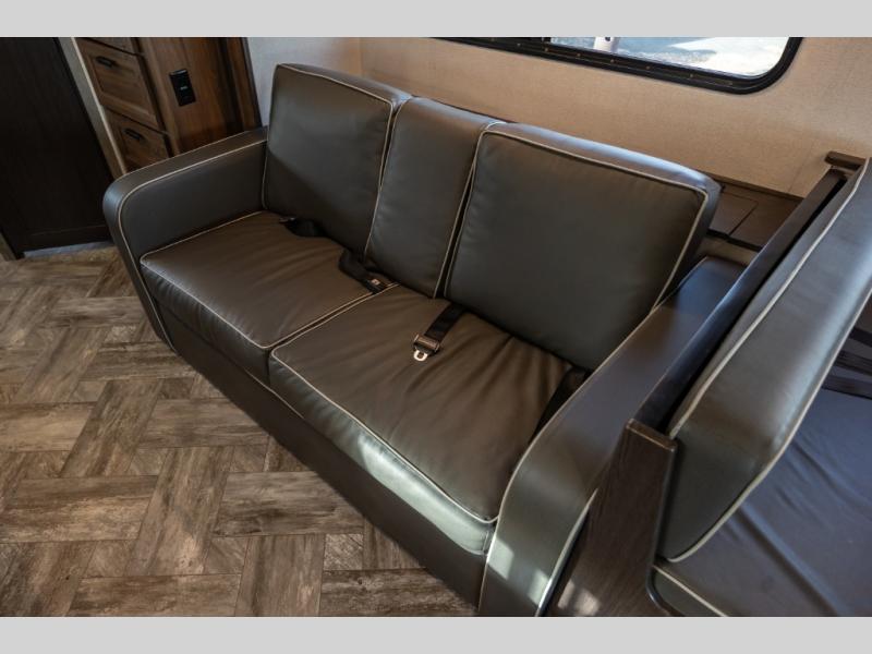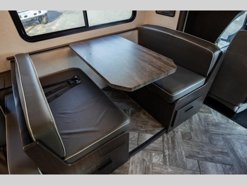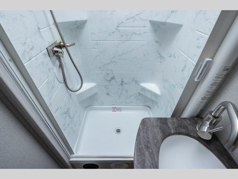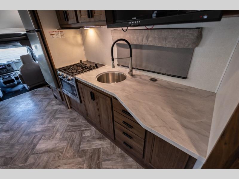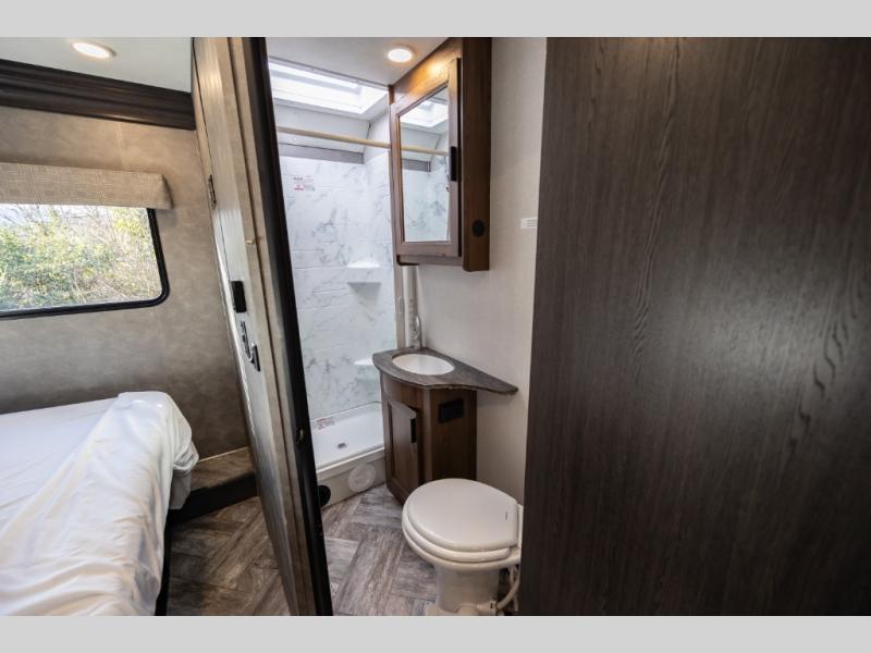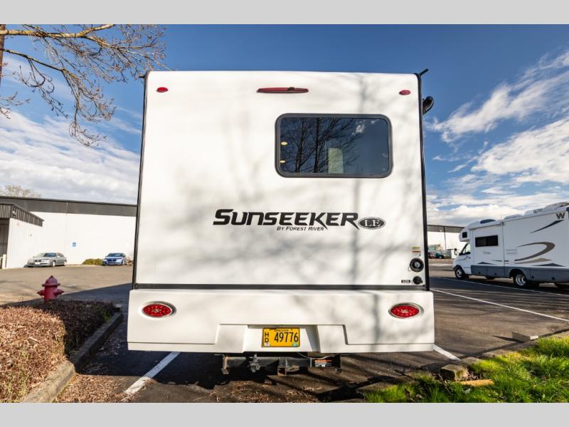 Don't make the mistake of passing up this Sunseeker LE Class C gas motorhome! There is a full bathroom with a shower skylight, oxygen-infused shower head with flexible extension, and an electric roof fan, and the bathroom is right next to the bedroom for convenience. The pantry, linen closet, wardrobe, and front storage offer you places to store your belongings, and there are also two large storage drawers in the booth dinette as well. While you're resting on the sofa, you can watch the 40" 12V LED TV, or you can chat with the chef who is preparing dinner on the recessed three-burner range or in the convection microwave.