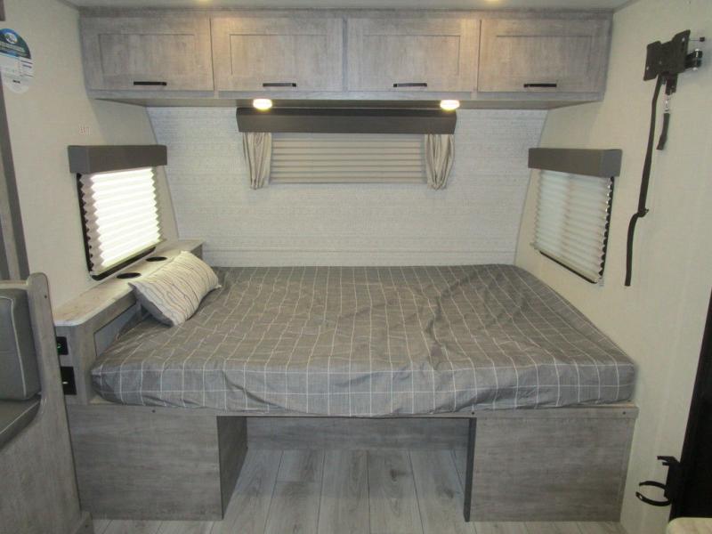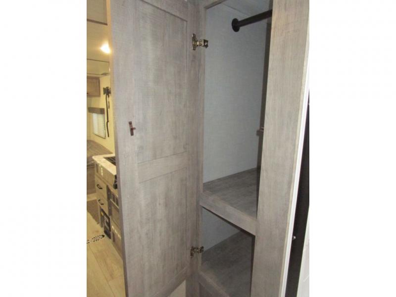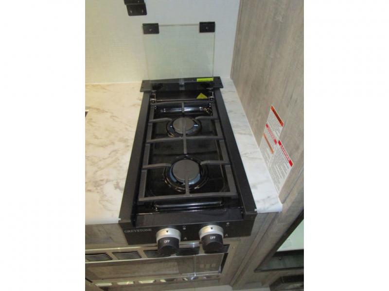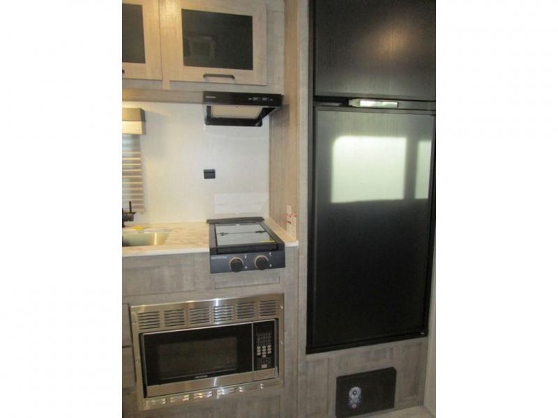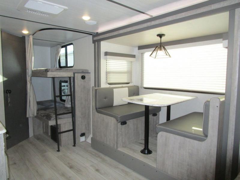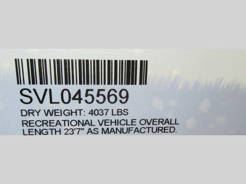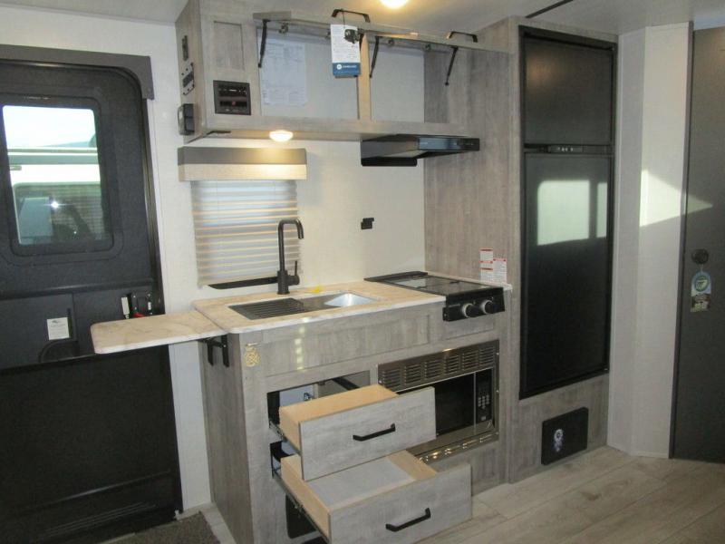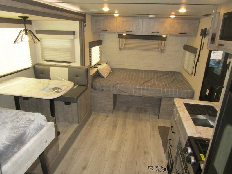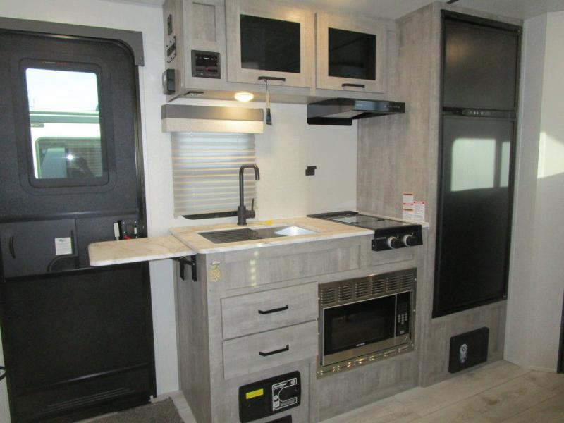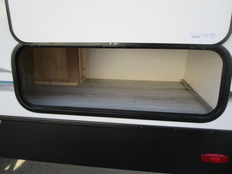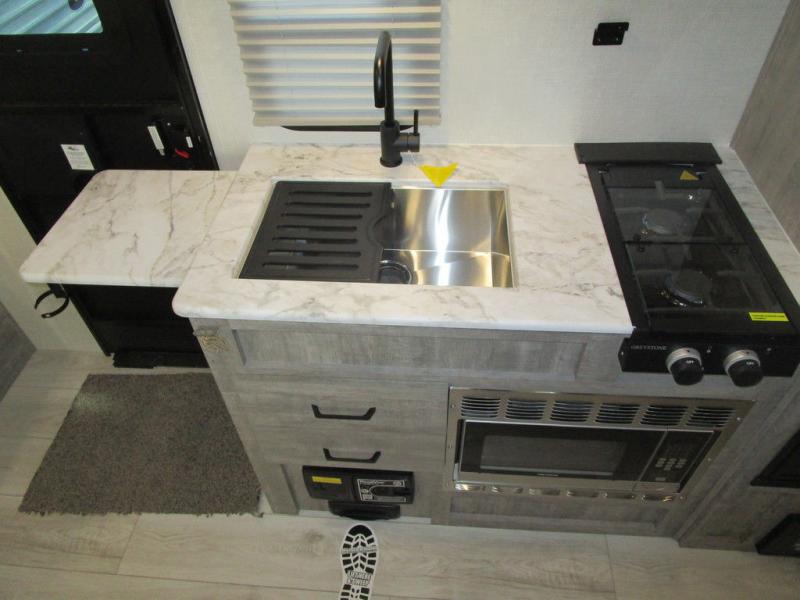 Bring along family or friends in this travel trailer that can sleep up to six people each night. The dinette slide will provide the chef space to cook on the two burner cooktop, or they may just head outdoors to cook on the outside kitchen. There is also an outdoor shelf here and a spray port for your convenience. The true queen-size bed up front is sure to provide a great night's rest, plus there is a "Stargazer" front window that will allow natural light in and beautiful starry nights.
