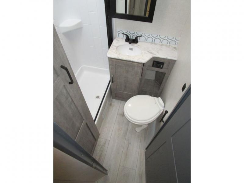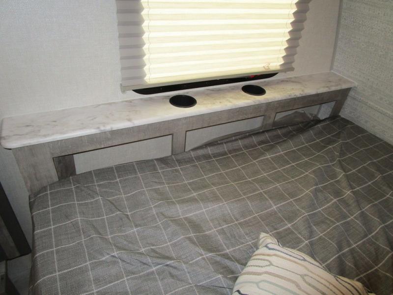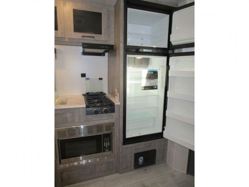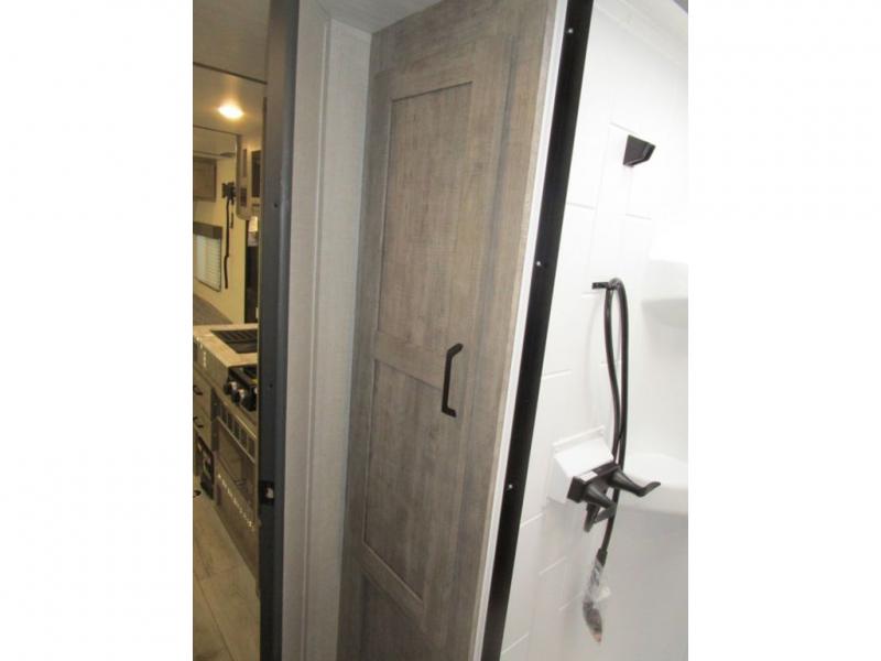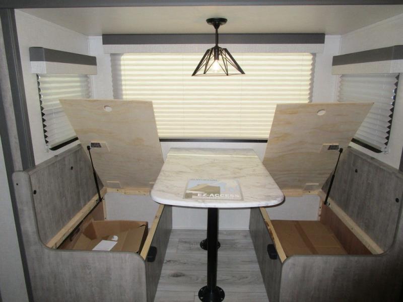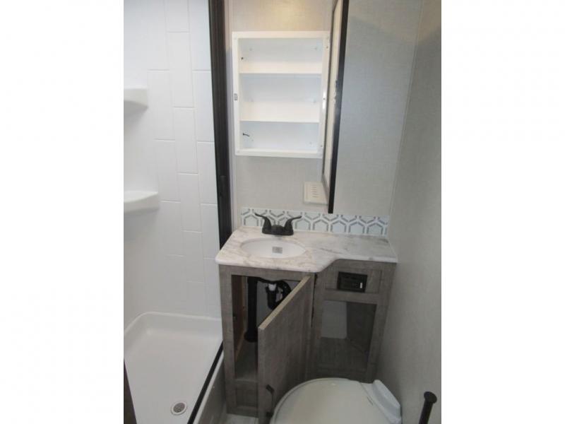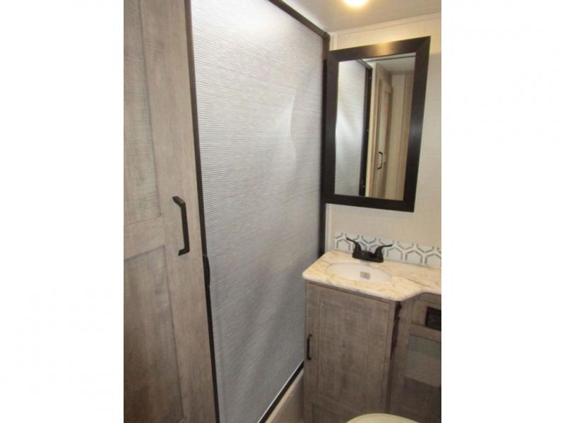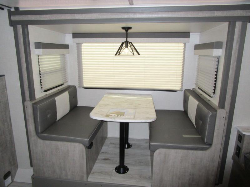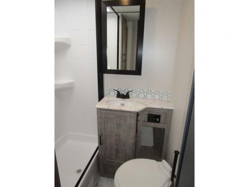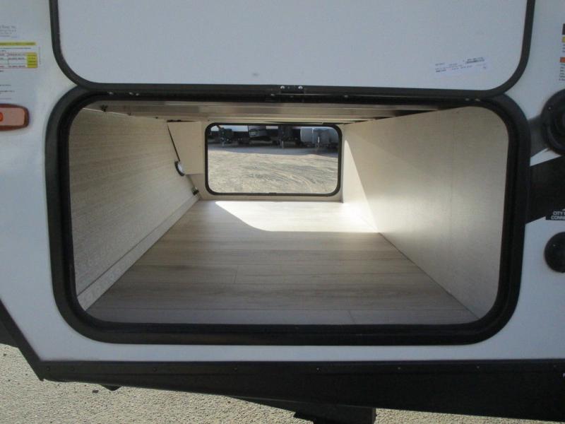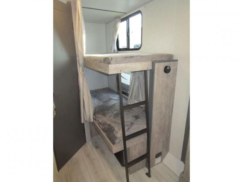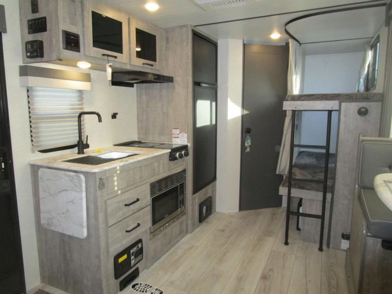 Bring along family or friends in this travel trailer that can sleep up to six people each night. The dinette slide will provide the chef space to cook on the two burner cooktop, or they may just head outdoors to cook on the outside kitchen. There is also an outdoor shelf here and a spray port for your convenience. The true queen-size bed up front is sure to provide a great night's rest, plus there is a "Stargazer" front window that will allow natural light in and beautiful starry nights.