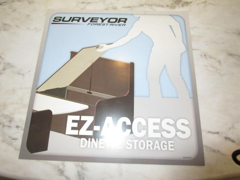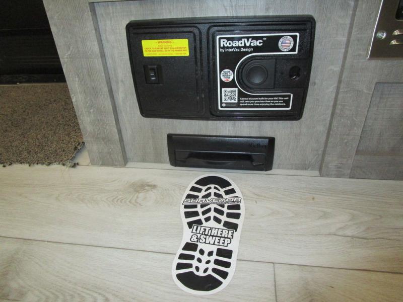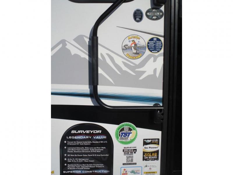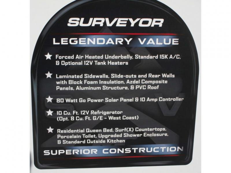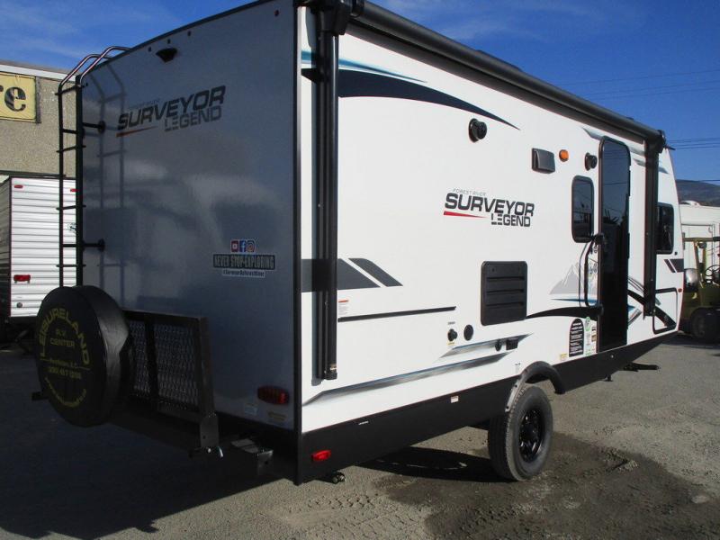 With any Surveyor Legend travel trailer by Forest River you will enjoy quality craftsmanship, convenient amenities, and at-home comforts. The Azdel composite panels provide a longer-lasting trailer, and the power tongue jack will get you back on the road in no-time. Each model includes the Surveyor Legend Package that comes standard with pleated night shades, an automotive style tinted front windshield, a multi-zone Bluetooth stereo, and more. You'll enjoy the one-touch electric awning with LED lights outdoors, plus rooftop solar prep and rear camera prep to make parking easier than ever. The inside will have you feeling right at home with Surf(x) seamless countertops, Congoleum designer carefree linoleum, residential faucets in the bath and kitchen, plus many more essentials you won't want to camp without.