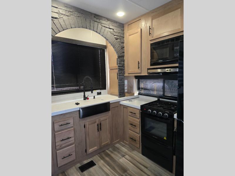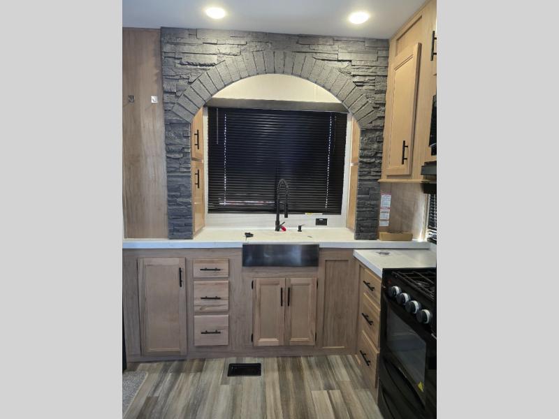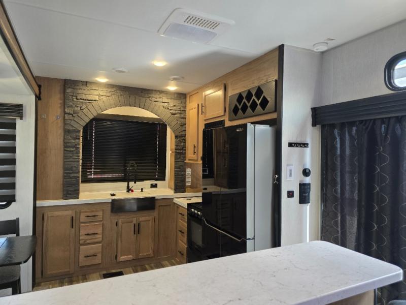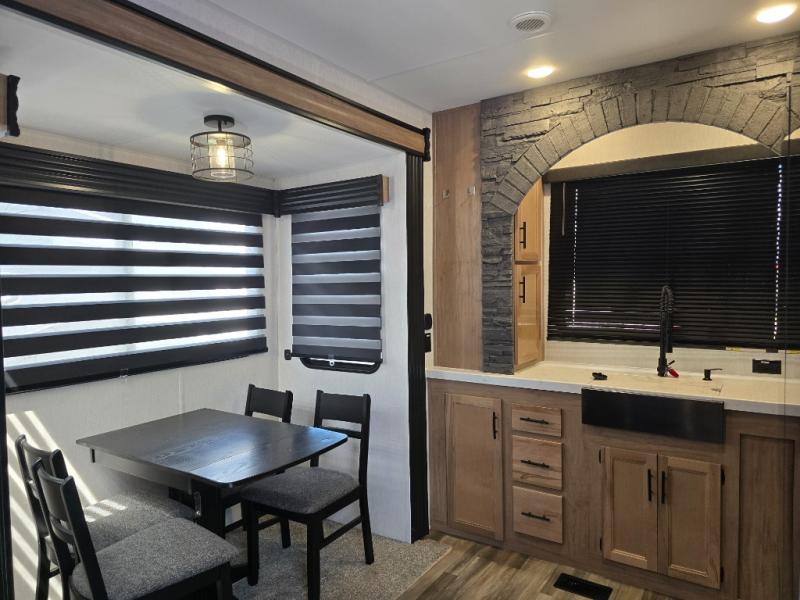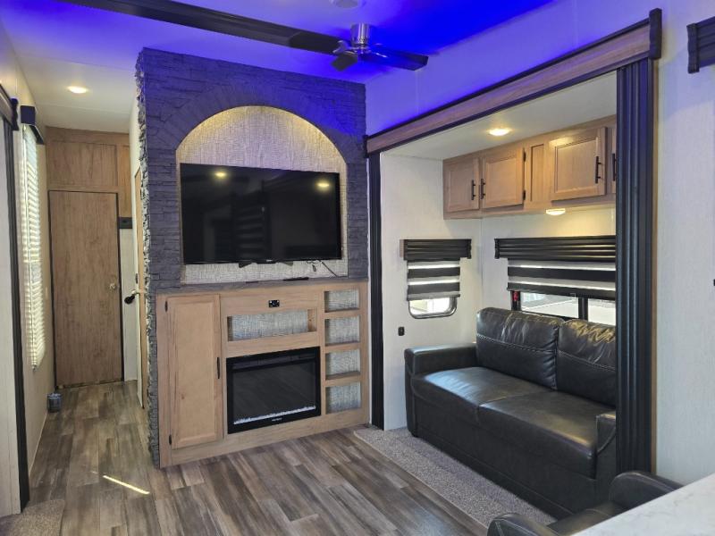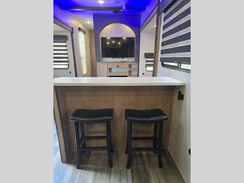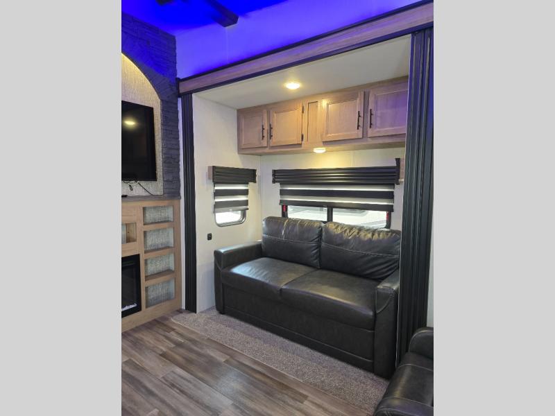 This Timberwolf destination trailer is very residential, and it includes almost everything your home offers you! You'll be able to get in and out easily with the two entry doors, and the front entry door leads into the large front kitchen. This kitchen is perfect for any chef because it has an 18-cubic foot refrigerator, two pantries, a microwave, range with oven, and residential farm-style sink. The free-standing dinette with chairs is also included in this space for socializing while cooking, but it won't be in your way while you cook because it sits within a slide out. There is more space to sit and enjoy a meal at the bar top with stools, and if you just want to eat while you watch the entertainment center, you can sit in one of the two lounge chairs or on one of the two sofas. If you want to warm it up and create a bit of ambiance, add the optional fireplace for a cozy evening.
