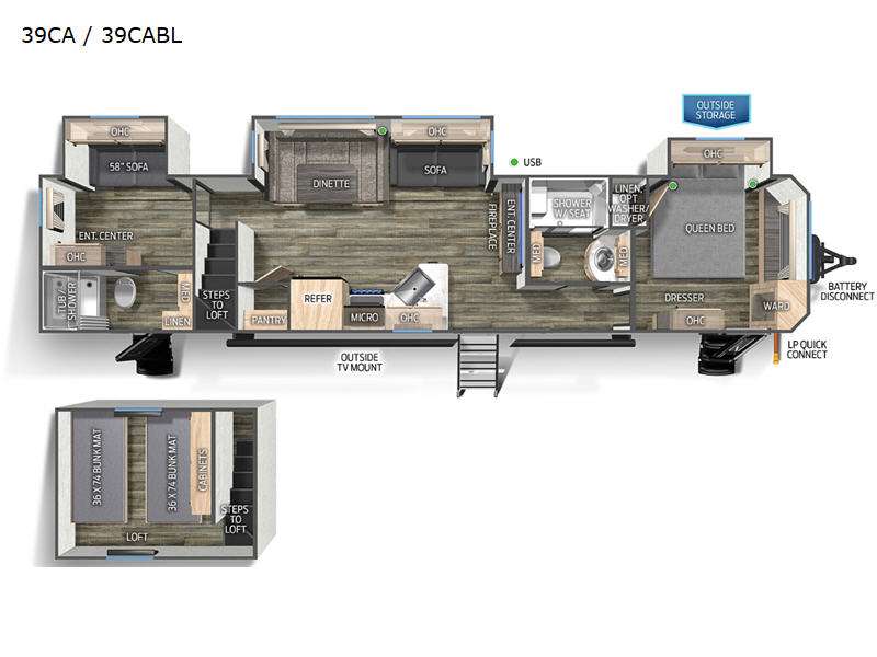 There are stairs leading up to the loft on this Timberwolf Black Label destination trailer, and once you get up to the loft, you'll find two 36" x 74" bunk mats, two cabinets, and a nightstand in between the mats. This loft sits above the second bedroom and the second bathroom. In this second bedroom, you'll find a 58" sofa on a slide out, so you'll have plenty of space to work at the desk on the other side of the room, and there is a TV mount if you want to turn this space into a relaxing den area. The main living area also offers you a large slide for your U-shaped dinette and sofa, and there is an entertainment center that you can watch from the furniture. A large pantry sits next to the 18-cubic foot refrigerator in the kitchen, so you'll have a great amount of storage for all types of foods. The front private bedroom contains a queen bed slide, bench, dresser, wardrobe, and linen closet that can be used for the optional washer/dryer.