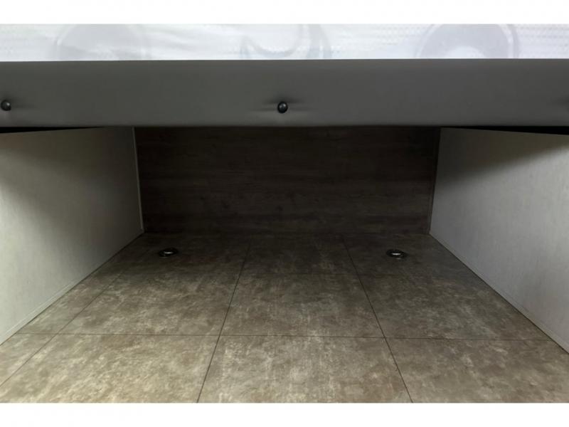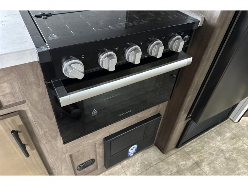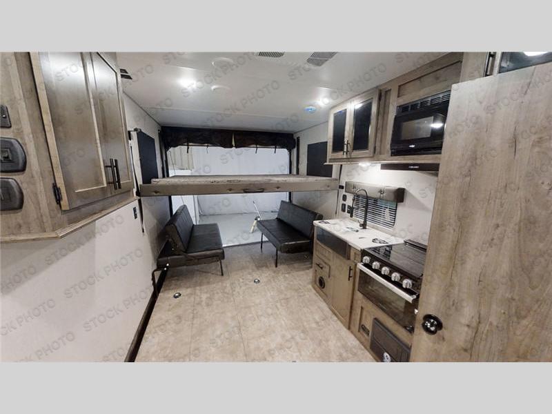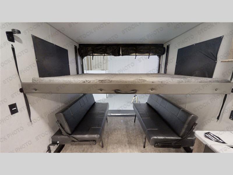 Enjoy each trip to the campground with this toy hauler that can sleep six people each night. When you arrive at your destination, set up the 12' patio awning, grab the lawn chairs from the outside storage compartment, and enjoy some fresh air. Inside, you can make lunch on the three burner cooktop or in the microwave oven, and there is a refrigerator here for your perishables. The full bath will allow you to clean up after trail riding, and the flip-up bed up front will provide a great night's rest. There is a quick set queen bed system in the garage area, plus dual flip-up sofas for your guests!