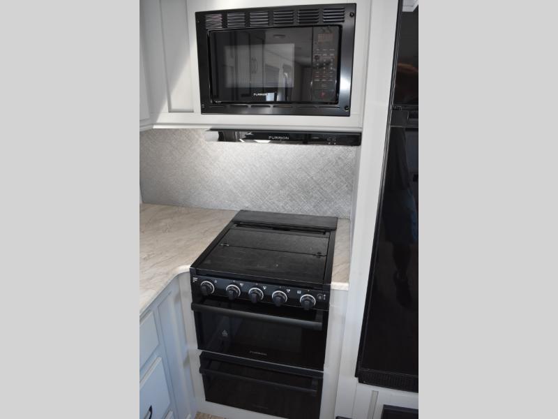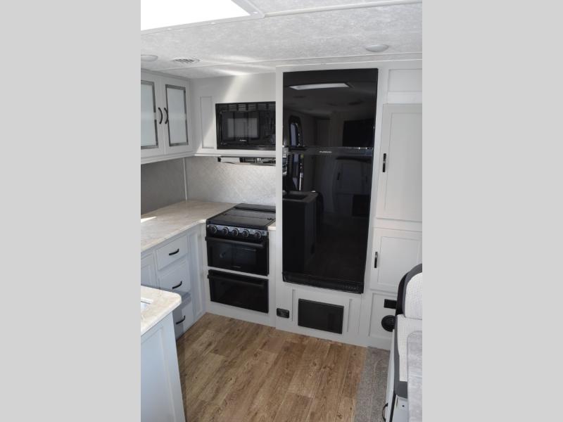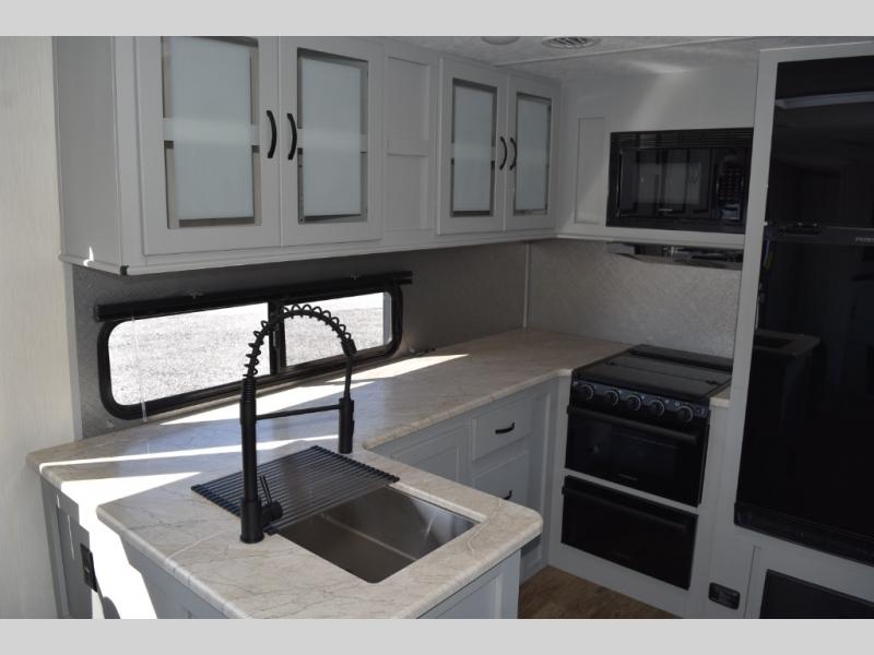 Escape to the Great Outdoors in this Vibe travel trailer. Once you arrive at your campsite, set up the 18' electric awning with LED lights, then grab the fishing poles from the large pass-through storage. You may want to make a quick lunch on the universal outside kitchen before heading out. If the weather isn't cooperating, you can cook on the three burner cooktop or in stainless steel 17' oven, and there is even a residential refrigerator to hold all your ingredients. The spacious full bath includes a 36" x 30" walk-in shower to clean up every day, and there is a linen closet to store clean towels and necessities.
