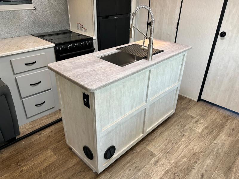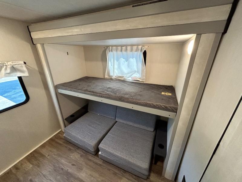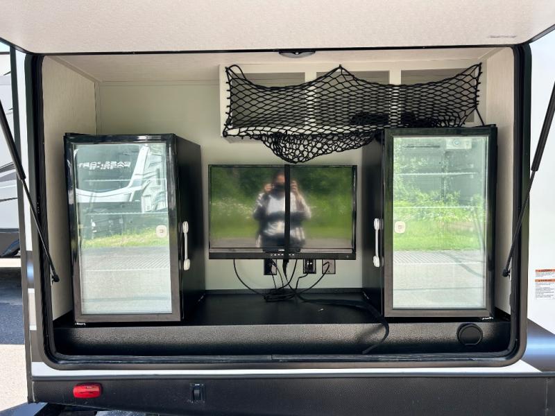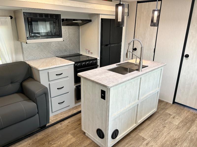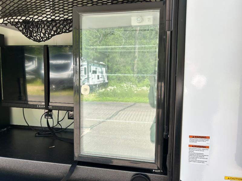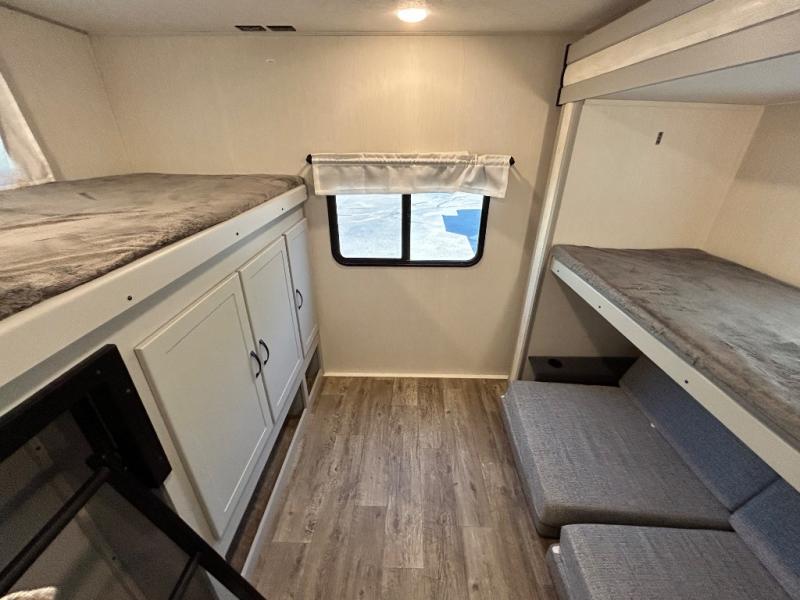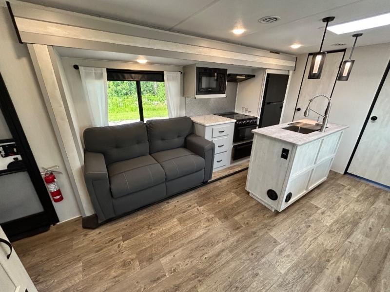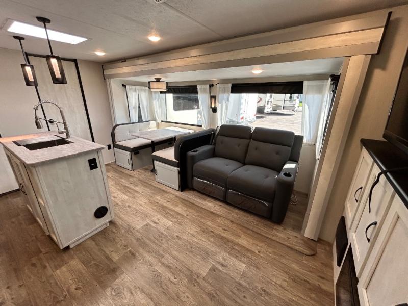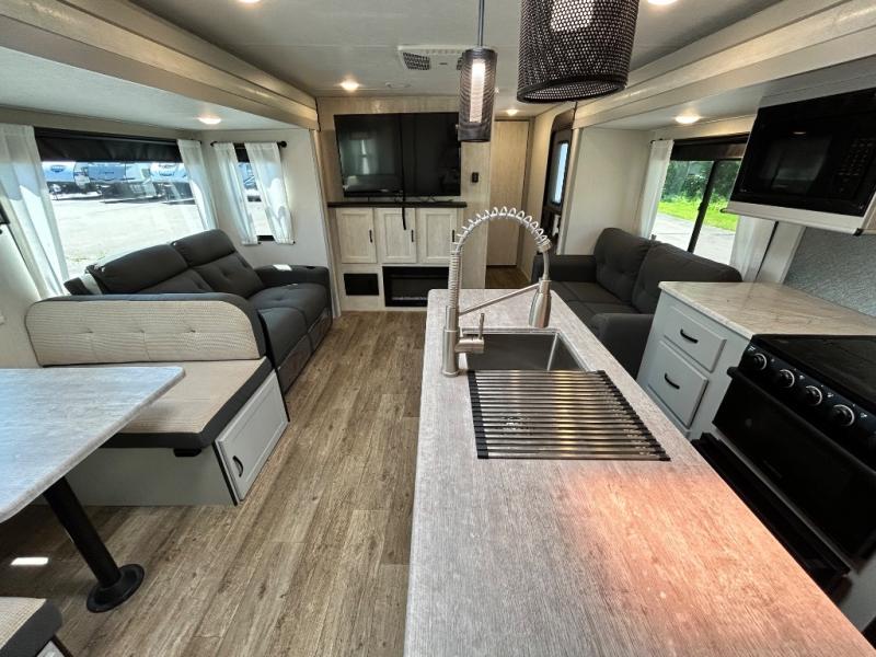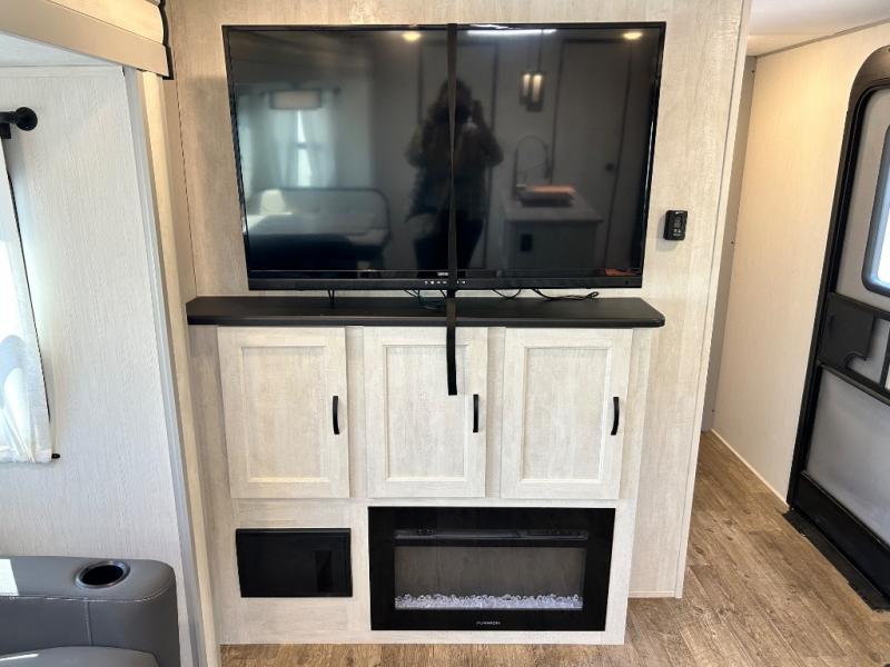 Whether you enjoy spending time outdoors or indoors, there is something for everyone in this travel trailer. The large pass-through storage can store your fishing poles, and the 20' electric awning with LED lights will create an outdoor living space. There is even an exterior baggage door with two exterior refrigerators, a TV, a spray port, and storage for snacks! You will love all the interior space thanks to the dual opposing slides in the main living area, which will give the chef space to work around the kitchen island. Your crew can visit on the two tri-fold sofas and booth dinette while the fireplace is going, but you'll probably find the kids spending most of their time in the private bunkhouse! They will have two bunks, Vibe cubes, a slide out for more space, plus a wardrobe to store all their clothes. What more could you want in a travel trailer?!
