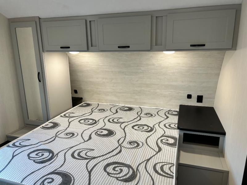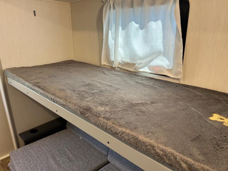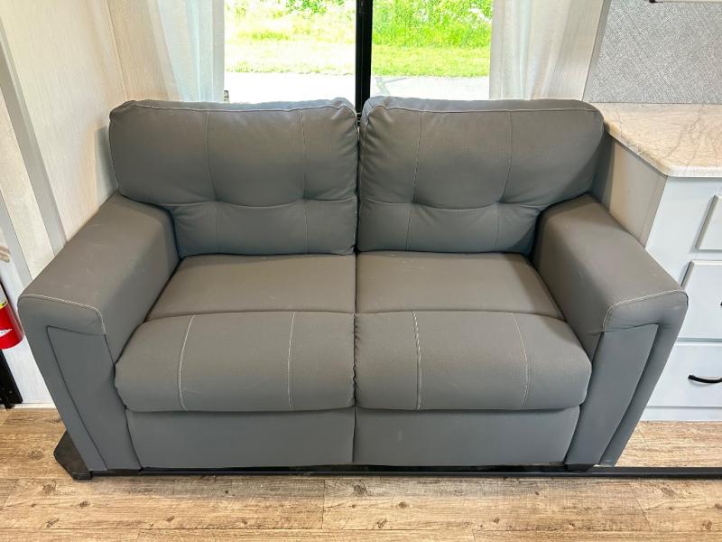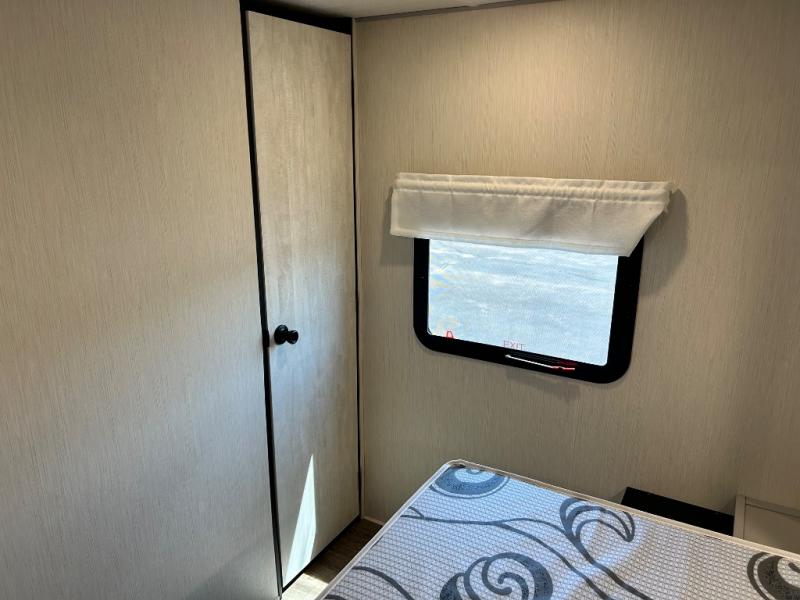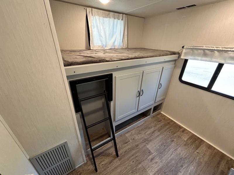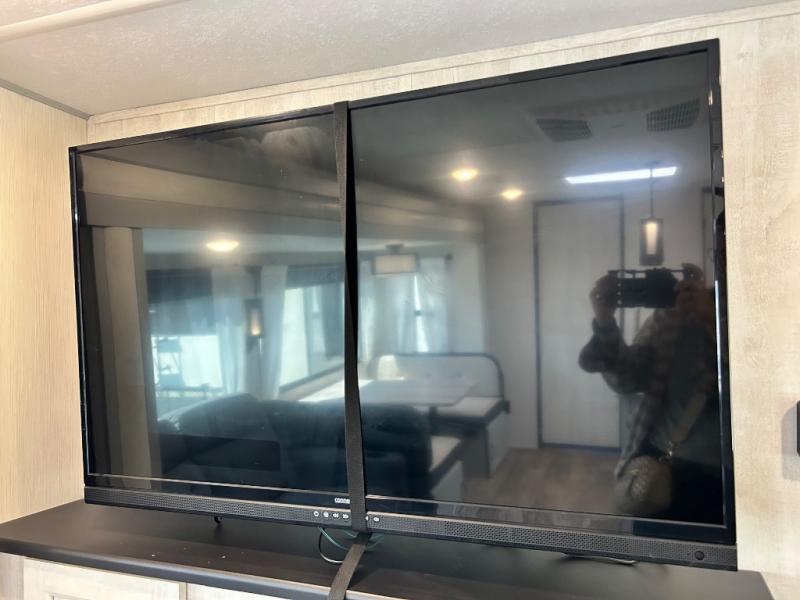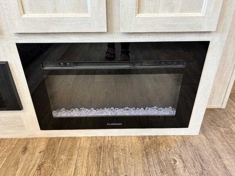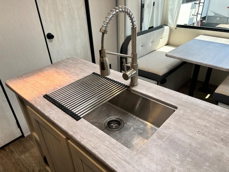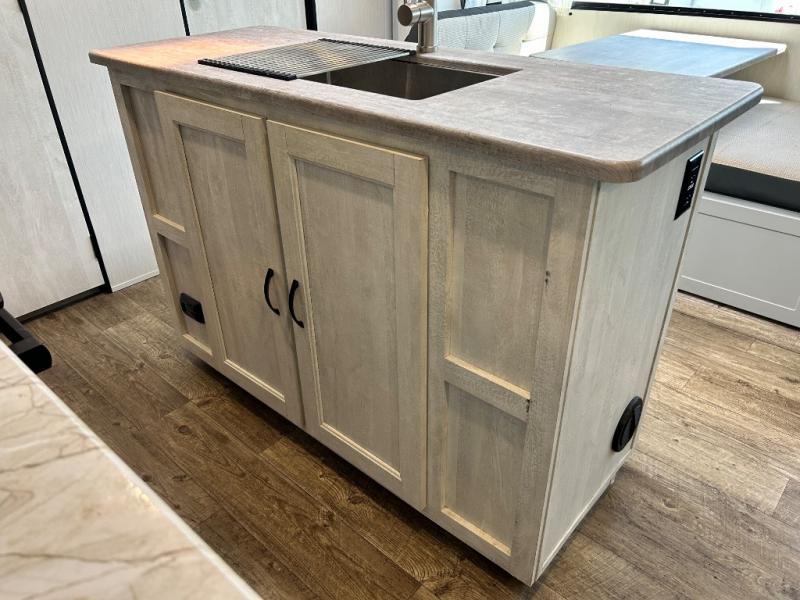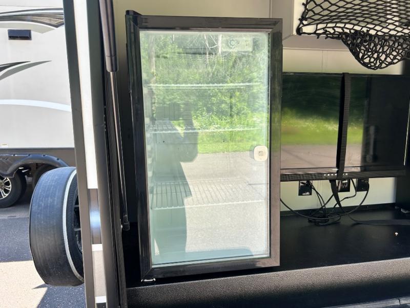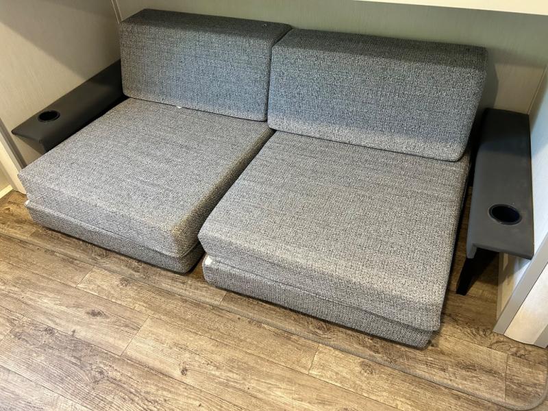Whether you enjoy spending time outdoors or indoors, there is something for everyone in this travel trailer. The large pass-through storage can store your fishing poles, and the 20' electric awning with LED lights will create an outdoor living space. There is even an exterior baggage door with two exterior refrigerators, a TV, a spray port, and storage for snacks! You will love all the interior space thanks to the dual opposing slides in the main living area, which will give the chef space to work around the kitchen island. Your crew can visit on the two tri-fold sofas and booth dinette while the fireplace is going, but you'll probably find the kids spending most of their time in the private bunkhouse! They will have two bunks, Vibe cubes, a slide out for more space, plus a wardrobe to store all their clothes. What more could you want in a travel trailer?!