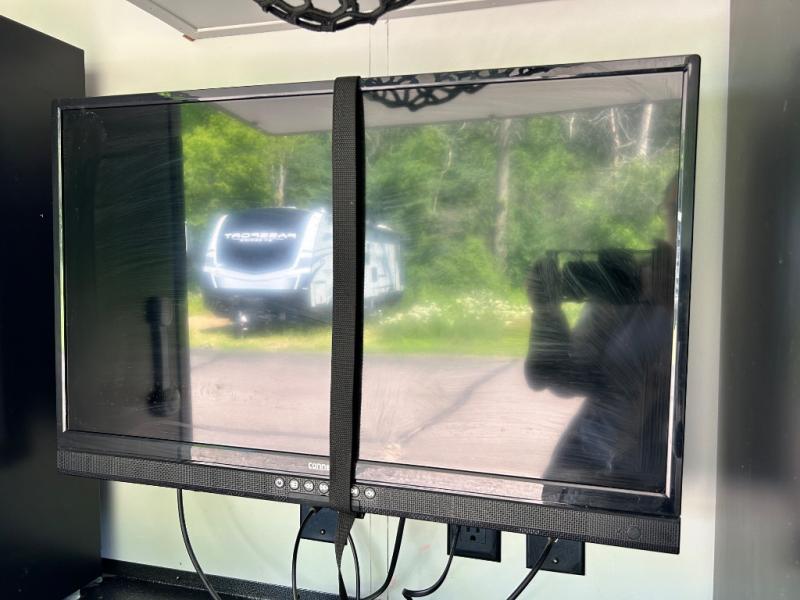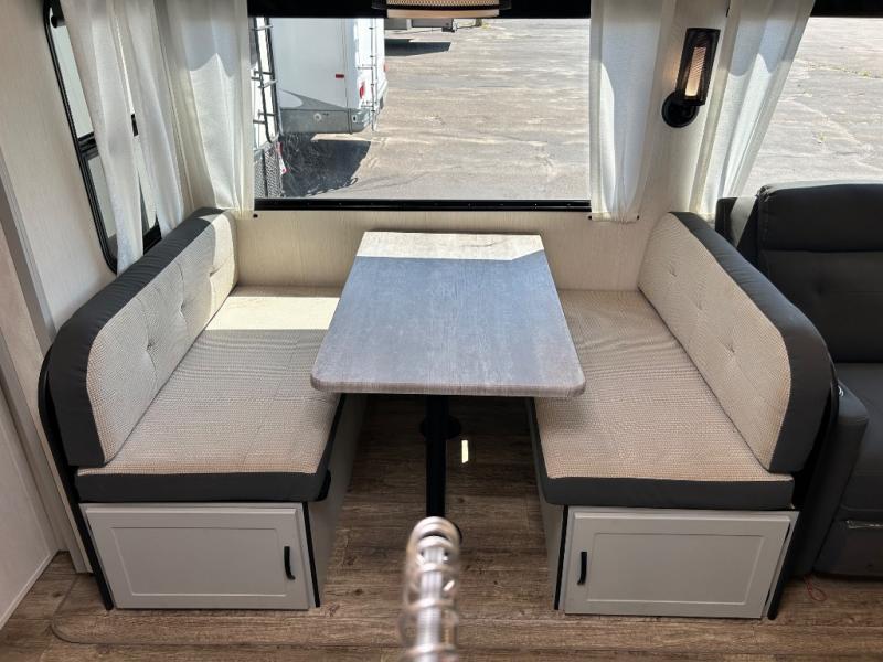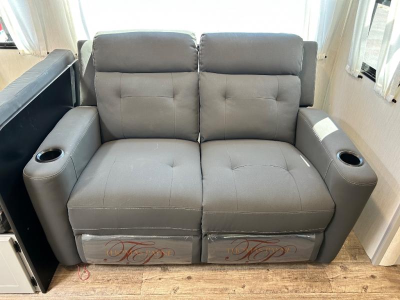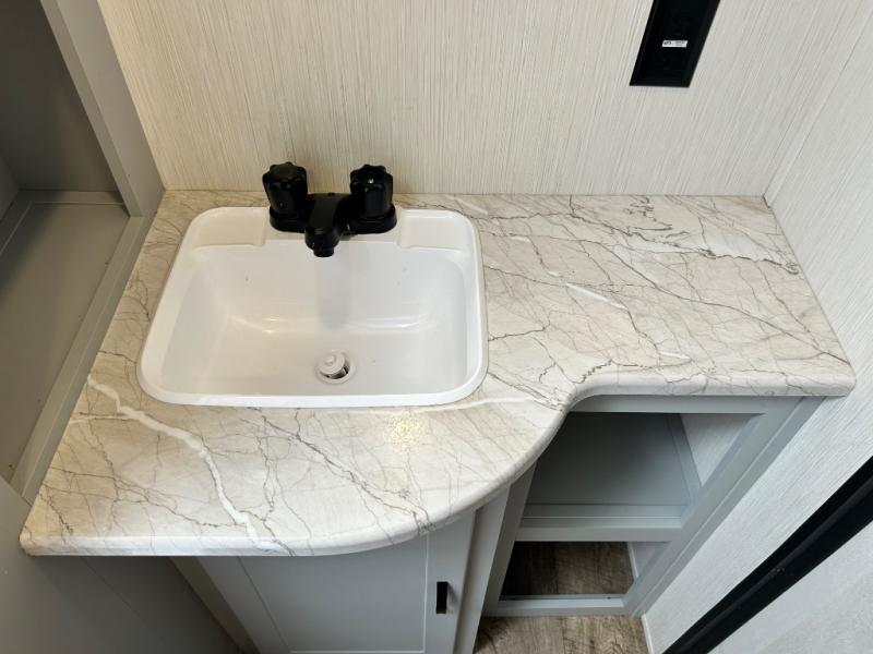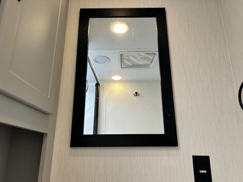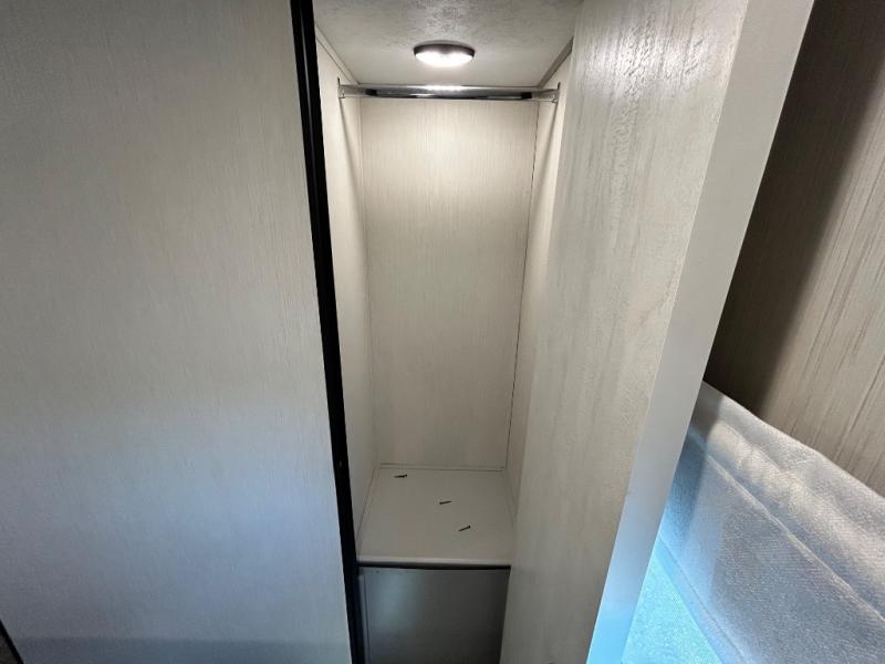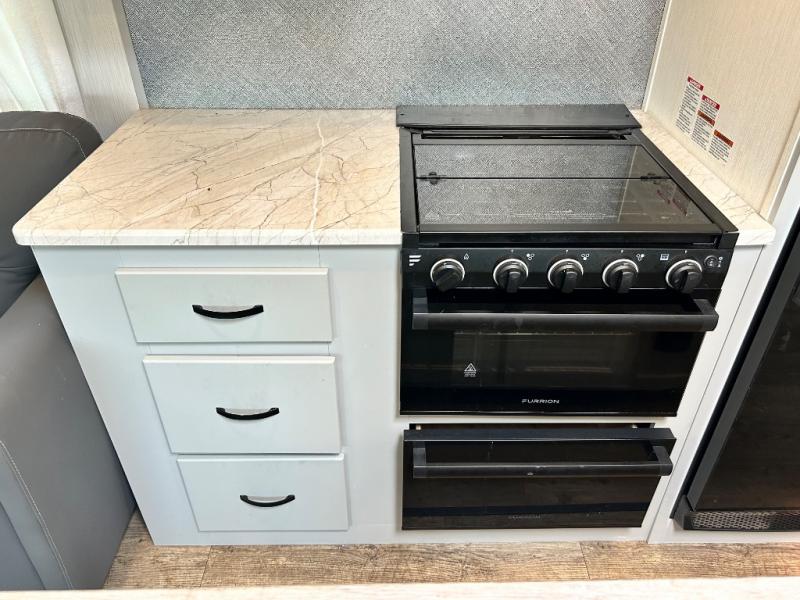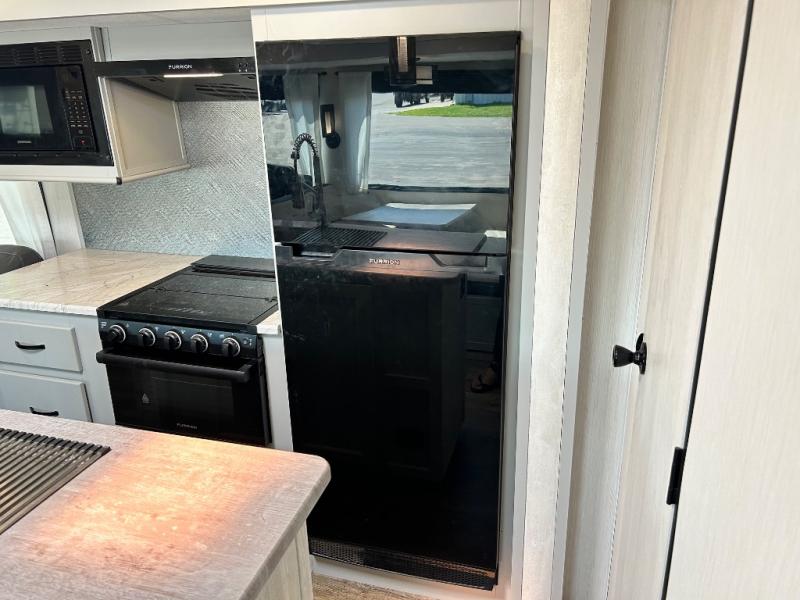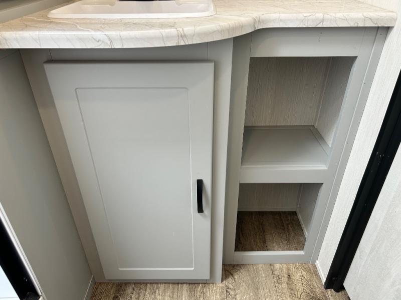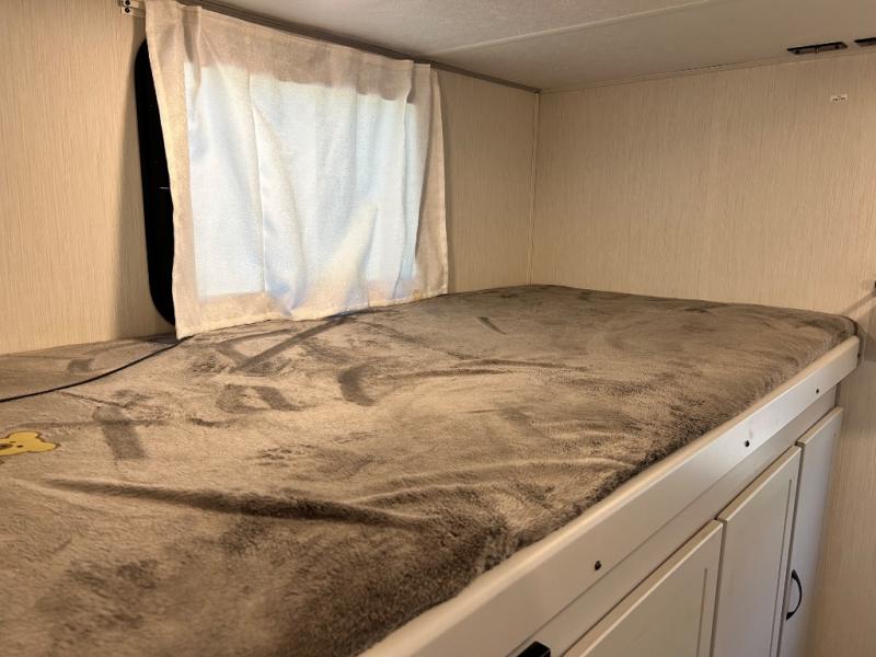 Whether you enjoy spending time outdoors or indoors, there is something for everyone in this travel trailer. The large pass-through storage can store your fishing poles, and the 20' electric awning with LED lights will create an outdoor living space. There is even an exterior baggage door with two exterior refrigerators, a TV, a spray port, and storage for snacks! You will love all the interior space thanks to the dual opposing slides in the main living area, which will give the chef space to work around the kitchen island. Your crew can visit on the two tri-fold sofas and booth dinette while the fireplace is going, but you'll probably find the kids spending most of their time in the private bunkhouse! They will have two bunks, Vibe cubes, a slide out for more space, plus a wardrobe to store all their clothes. What more could you want in a travel trailer?!