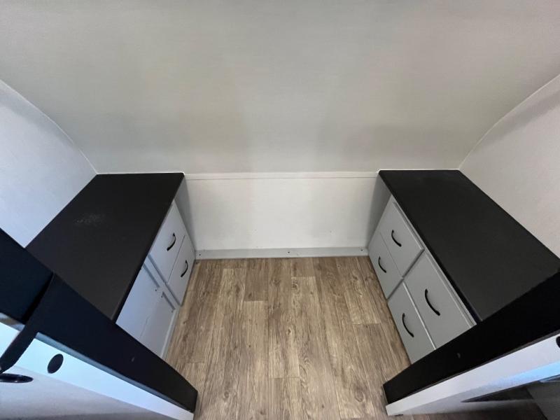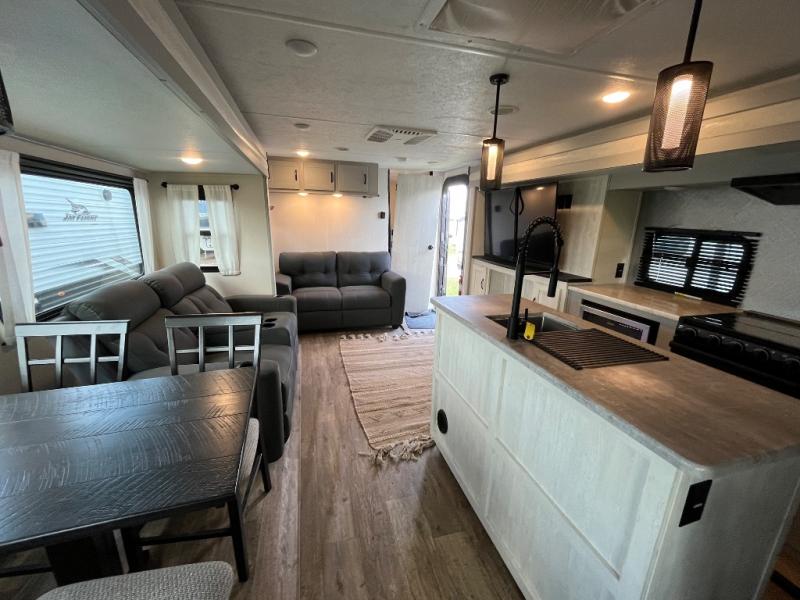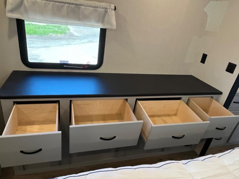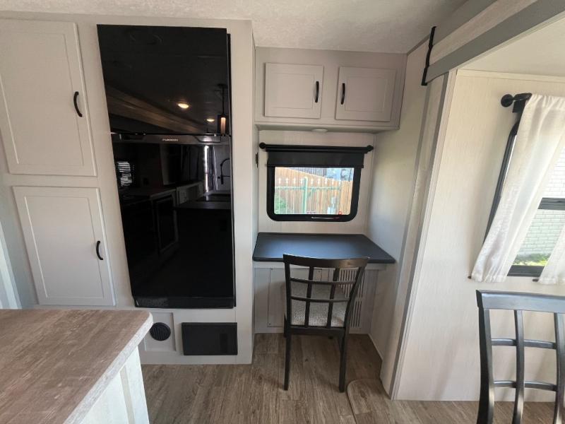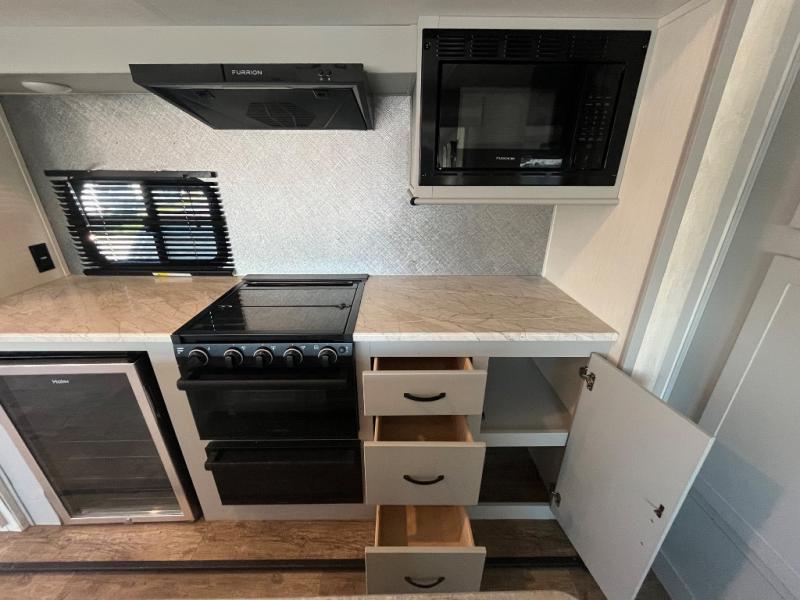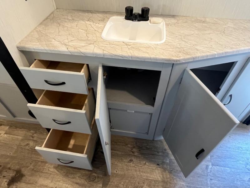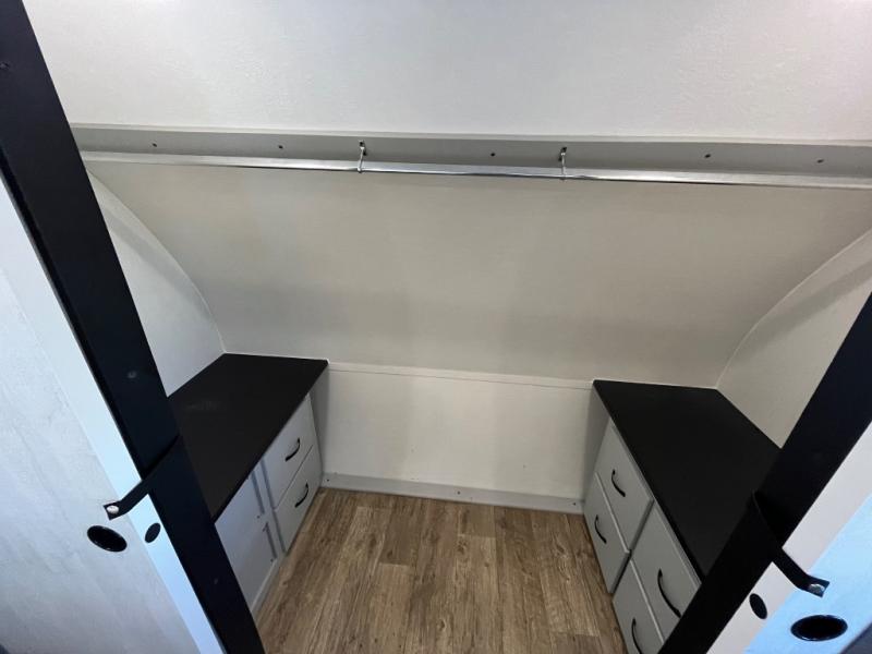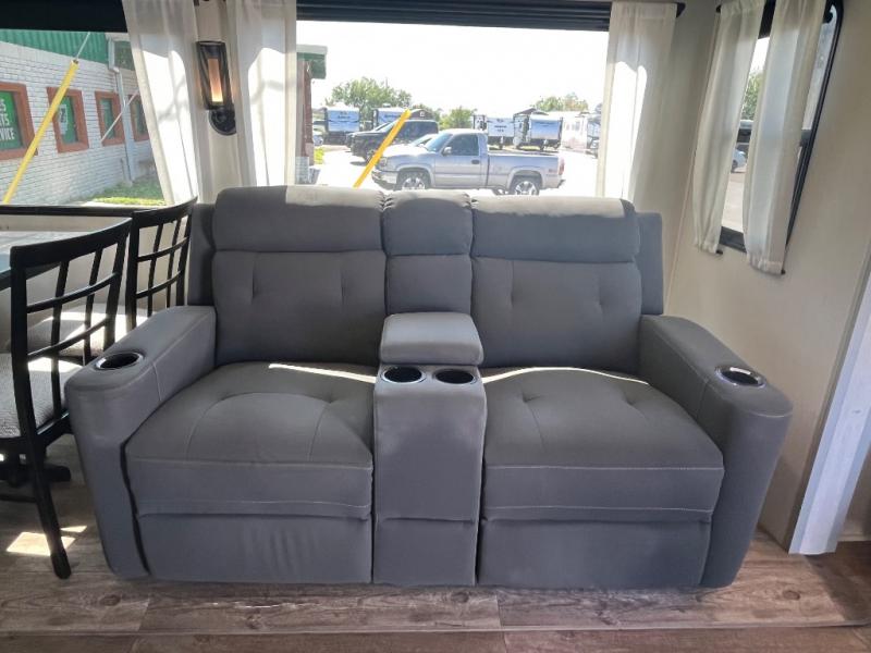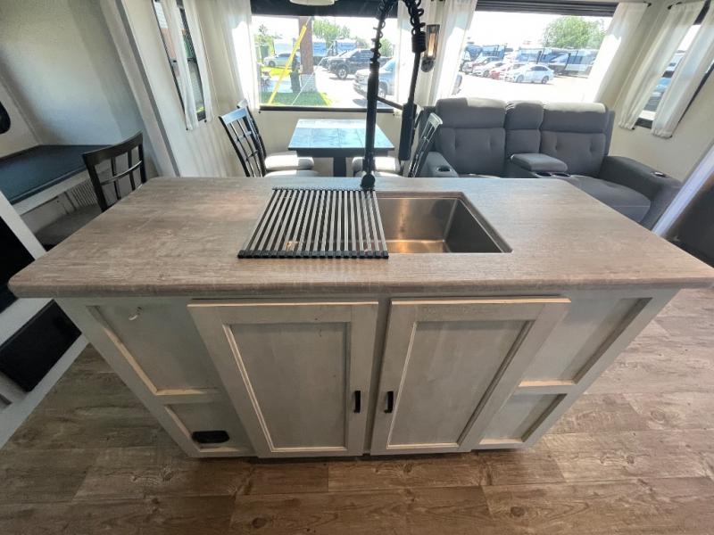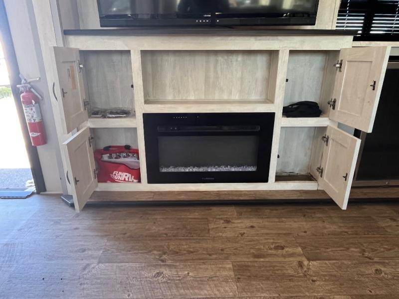 You won't believe all that this travel trailer has to offer! If you need to get some work done then you can utilize the flip-up desk next to the oversized refrigerator and large pantry. The kitchen island makes meal prepping easier, and the beverage cooler helps save space in your refrigerator for perishables. The kitchen skylight brings in natural lighting. Relax each night on either the tri-fold sofa or theater seating across from the entertainment center with a fireplace, or you can play some games at the booth dinette. As you enter the walk-through bathroom, you will notice an area prepped to add an optional washer and dryer. The front private bedroom has a queen bed slide with nightstands on either side with power to charge your electronics while you recharge. The exterior not only has multiple baggage doors and two awnings, but also an exterior hot/cold shower!