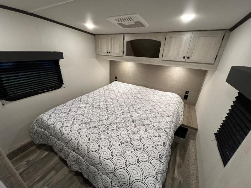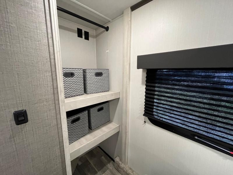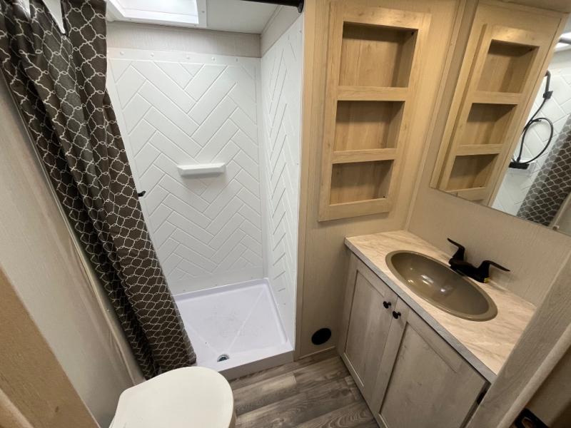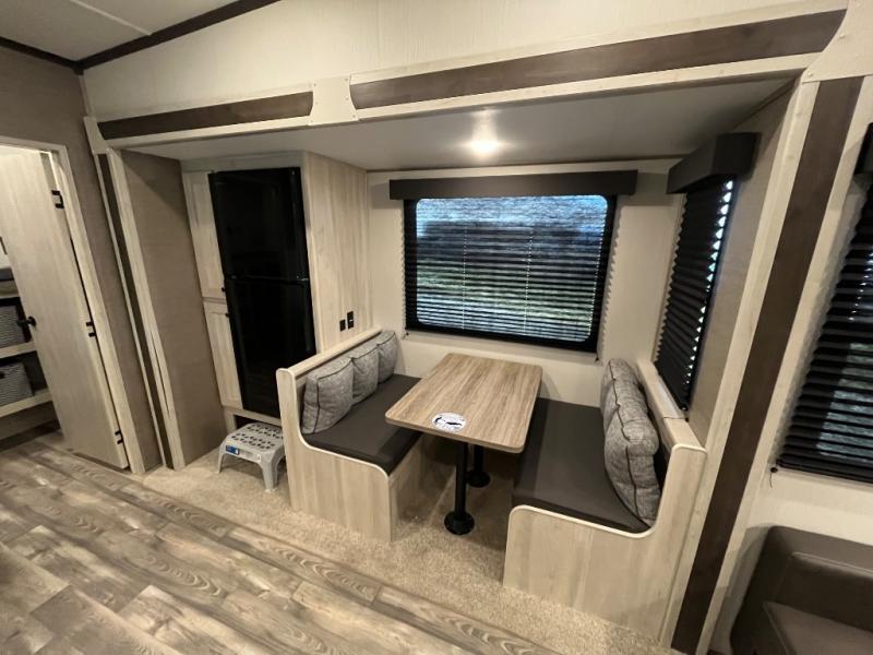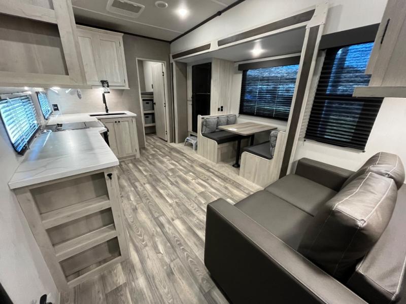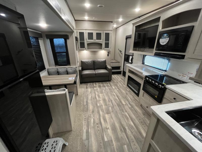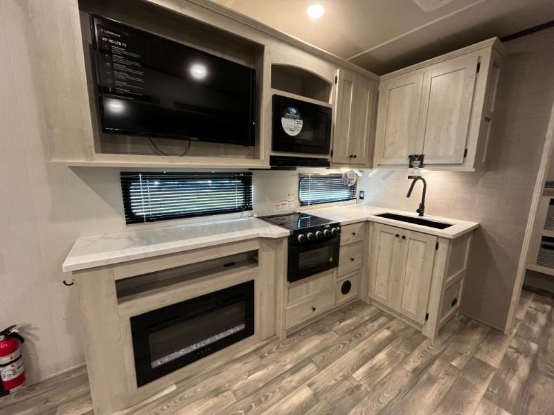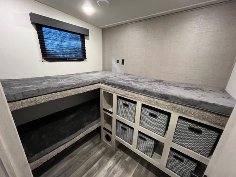 This fifth wheel offers plenty of room for a big group to get away together! With a front bedroom with a king bed, plus a rear bunk room with three bunks and a unique storage unit, everyone will have their own space. A central living area and kitchen provides a gathering space that everyone will love. The kitchen has a 17" range, microwave, and 10.7 cu. ft. 12V refrigerator so you can cook as easily as at home. A dinette booth with cornhole boards and sofa will be comfortable places to relax by the electric fireplace!
