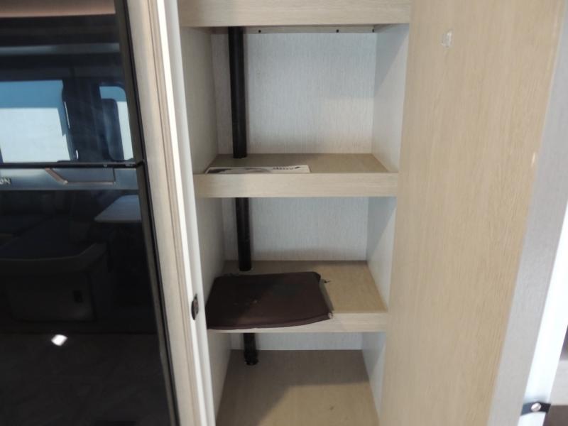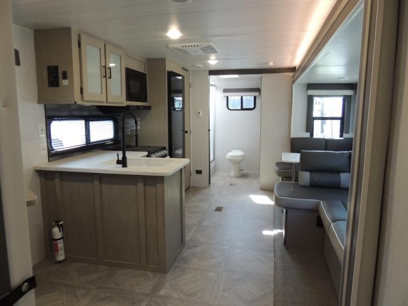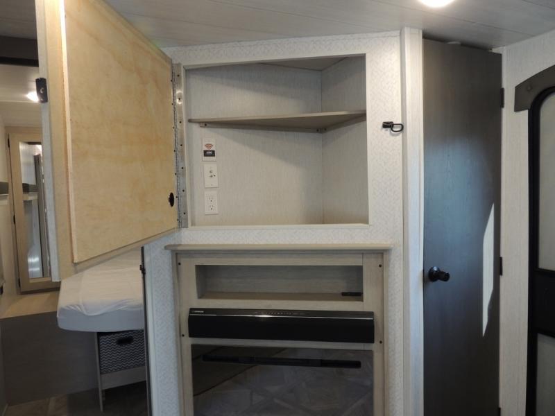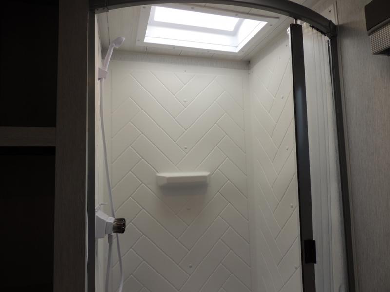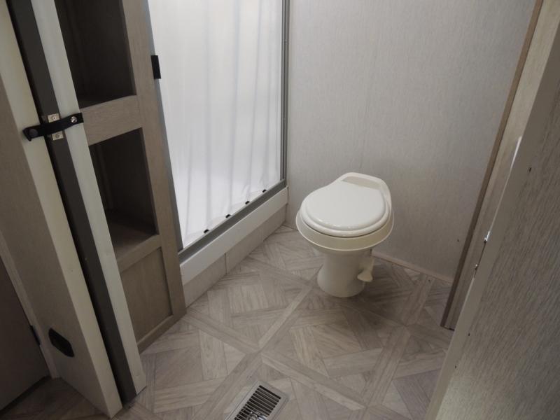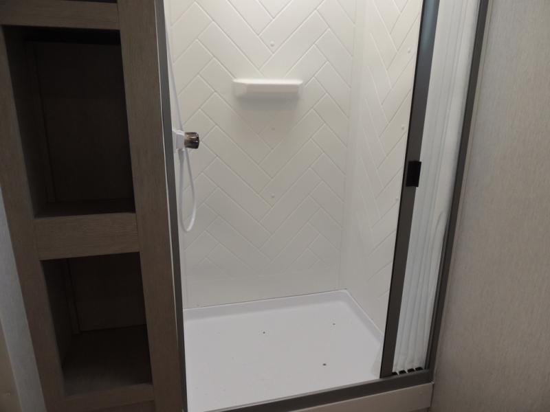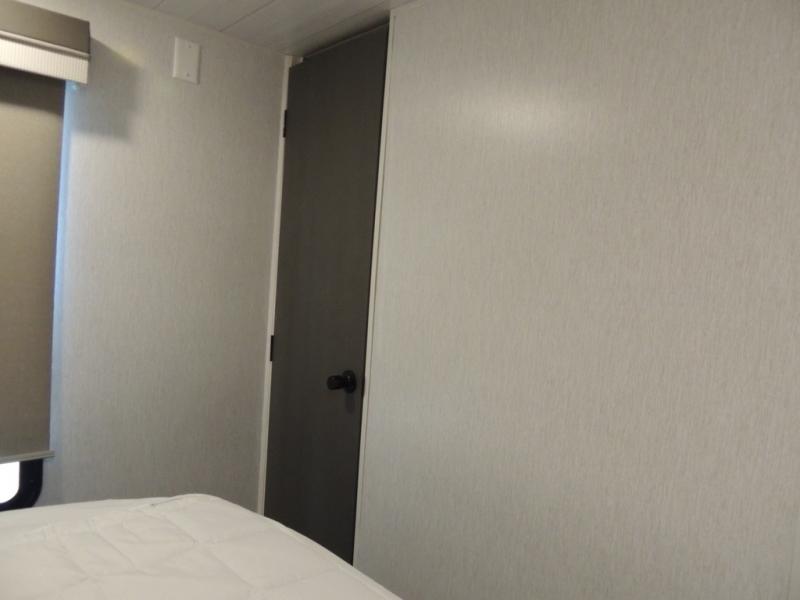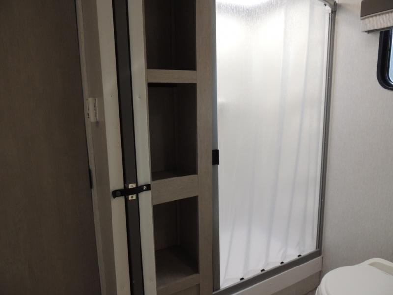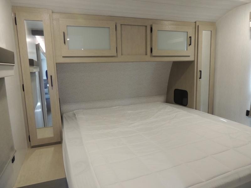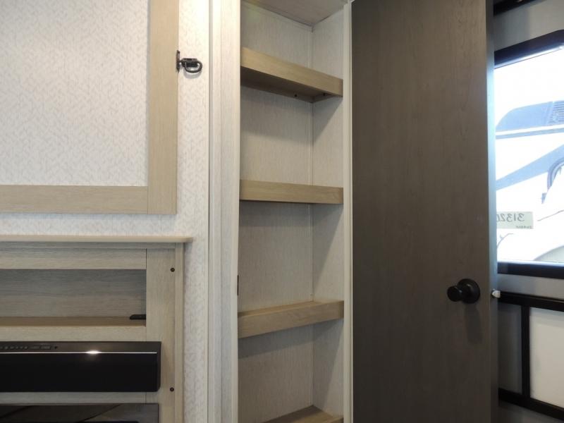 Sleeping for up to six with a custom king bed in the private front bedroom, and a versa-lounge and u-shaped dinette which can both be transformed into added sleeping when needed. You will love the added space thanks to the large slide and the view through the large panoramic windows will bring the outdoors inside! Cooking will be easy either indoors our out with an exterior camp kitchen situated under the 20' awning. Inside, two pantries and an oversized fridge will hold all of your food, both dry and canned goods plus perishables will be kept fresh. The front private bedroom is where you will find the custom king-sized bed. There is also a walk-in closet as well as two nightstands and two upper shirt closets for your clothing and other personal belongings. A nice sized walk-in shower in the back of this unit, plus linen cabinet and extra wardrobe will keep everyone feeling clean and refreshed. On the outside of this unit, you will find more storage in the front pass-through compartment which is great for outdoor games and gear.