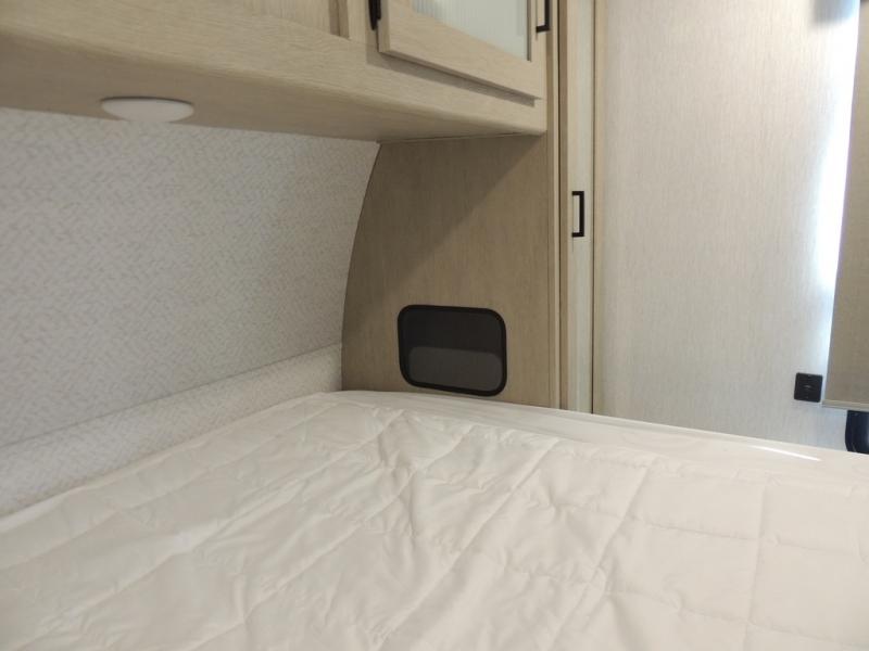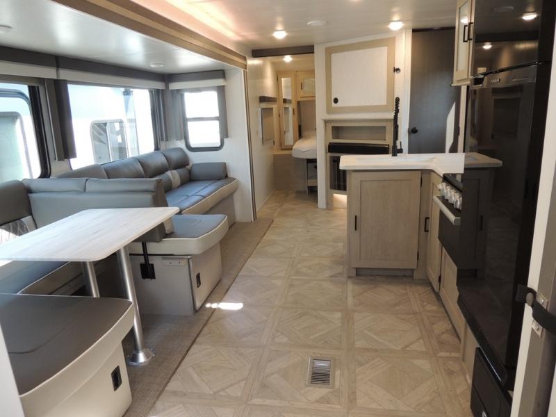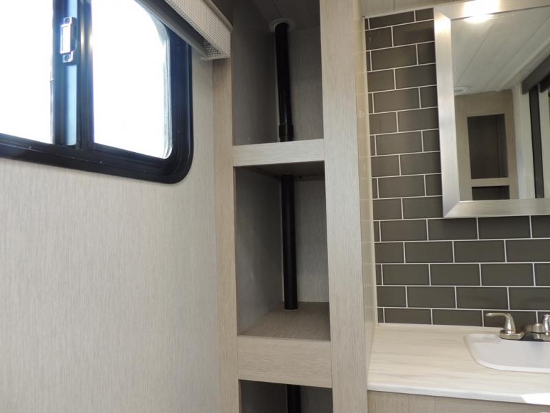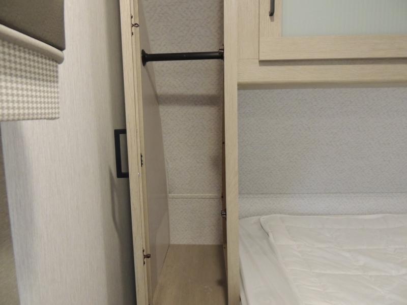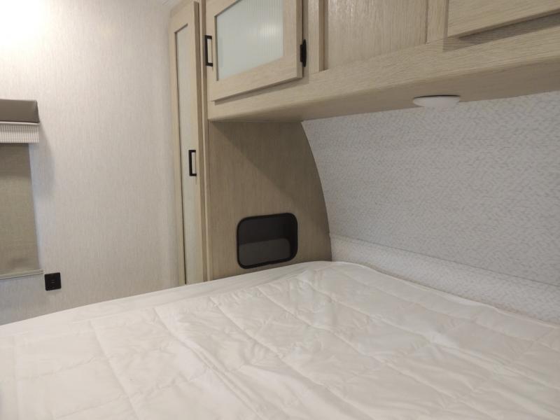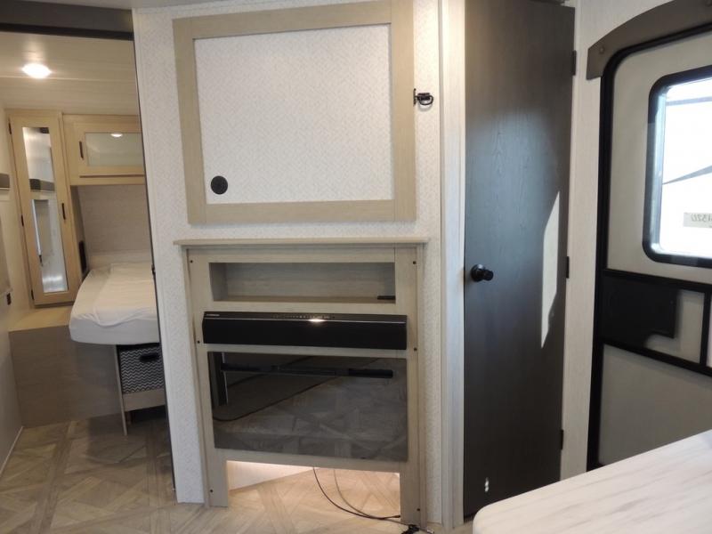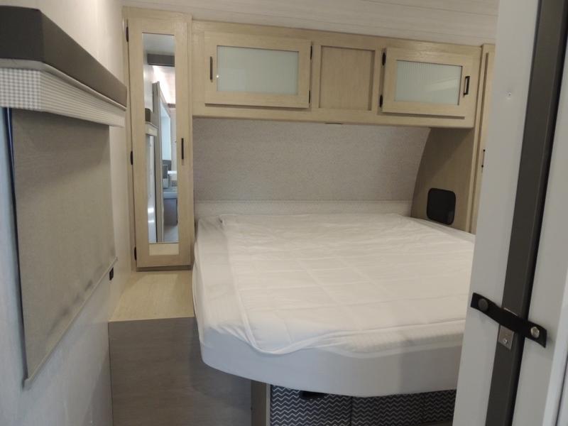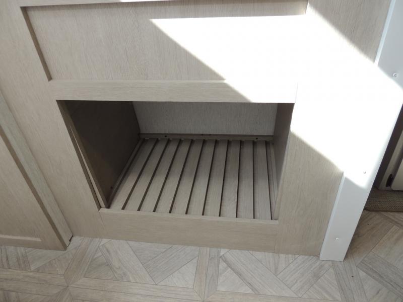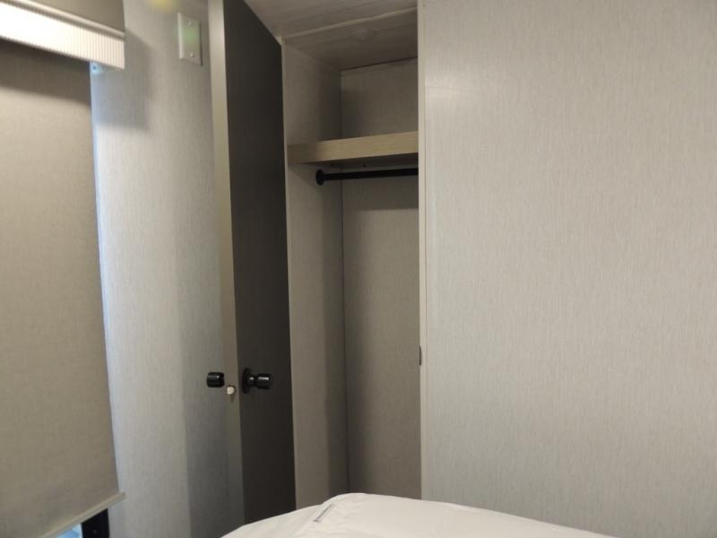 Sleeping for up to six with a custom king bed in the private front bedroom, and a versa-lounge and u-shaped dinette which can both be transformed into added sleeping when needed. You will love the added space thanks to the large slide and the view through the large panoramic windows will bring the outdoors inside! Cooking will be easy either indoors our out with an exterior camp kitchen situated under the 20' awning. Inside, two pantries and an oversized fridge will hold all of your food, both dry and canned goods plus perishables will be kept fresh. The front private bedroom is where you will find the custom king-sized bed. There is also a walk-in closet as well as two nightstands and two upper shirt closets for your clothing and other personal belongings. A nice sized walk-in shower in the back of this unit, plus linen cabinet and extra wardrobe will keep everyone feeling clean and refreshed. On the outside of this unit, you will find more storage in the front pass-through compartment which is great for outdoor games and gear.