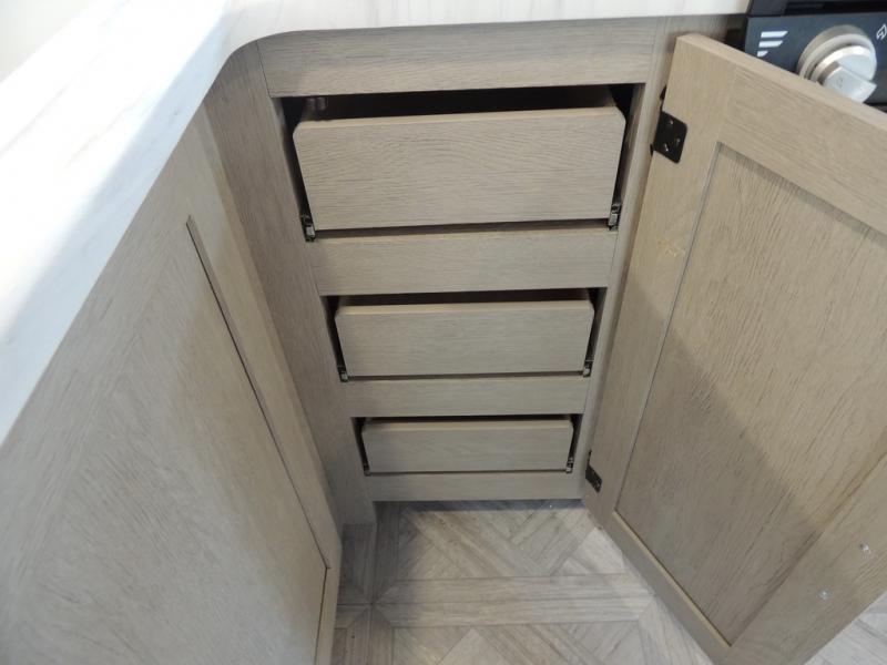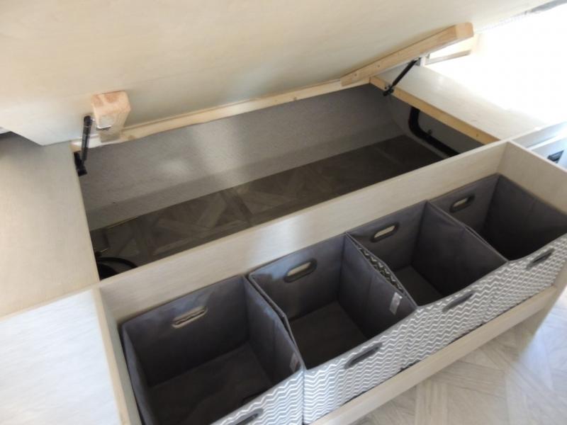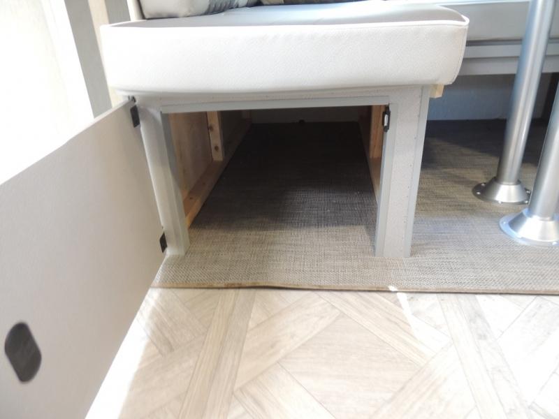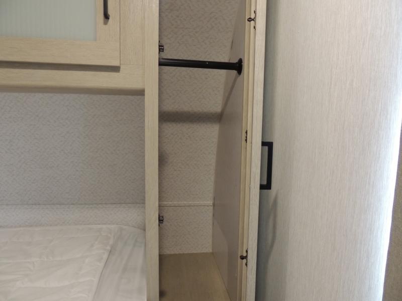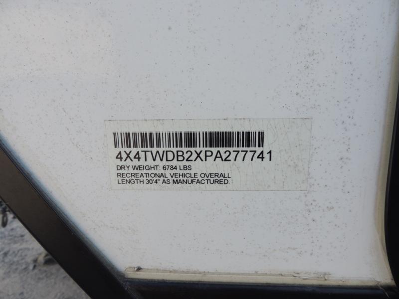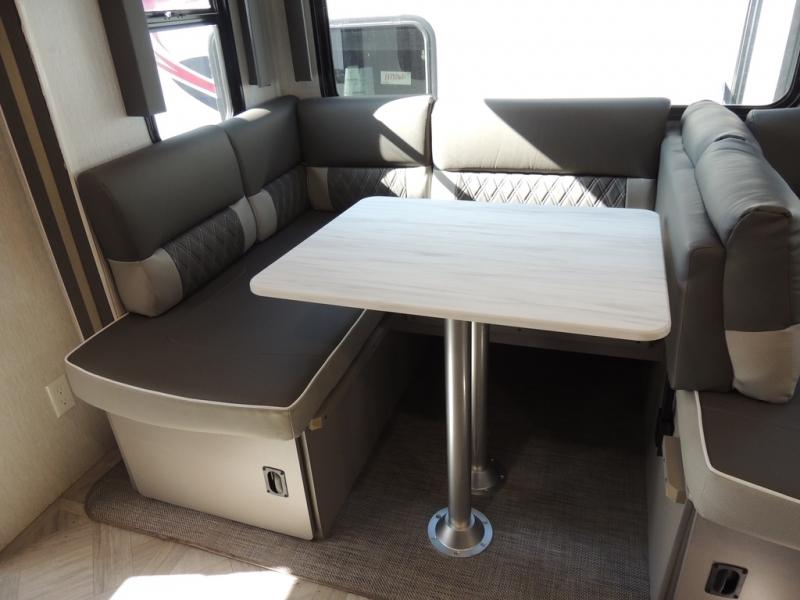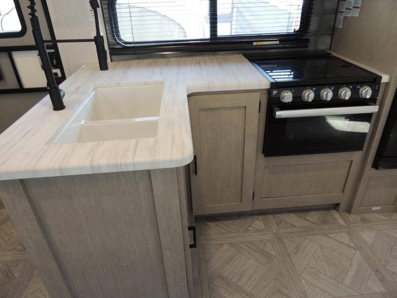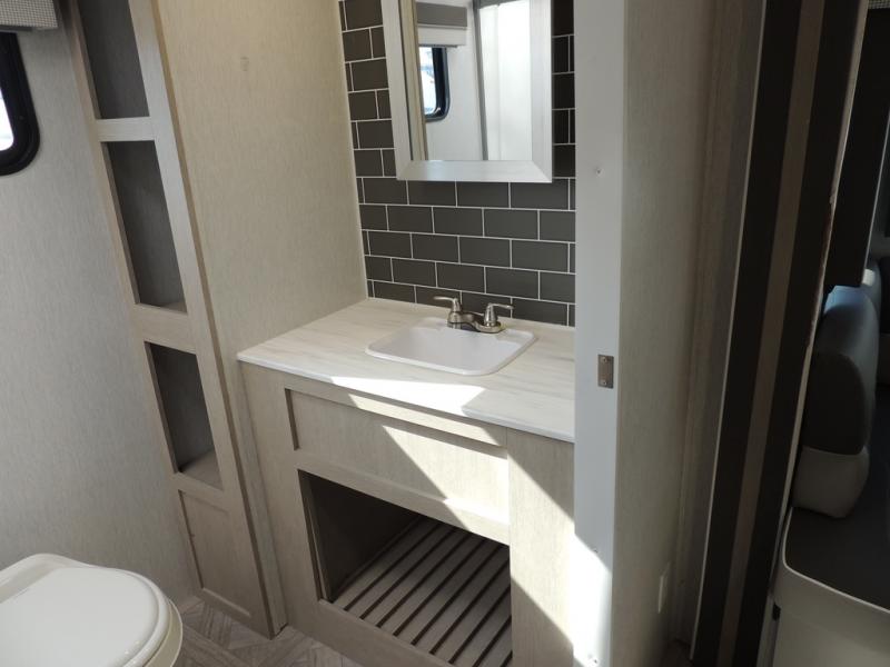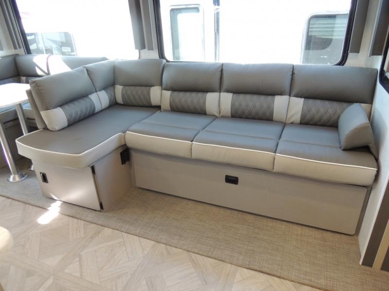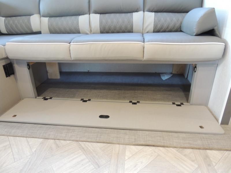 Sleeping for up to six with a custom king bed in the private front bedroom, and a versa-lounge and u-shaped dinette which can both be transformed into added sleeping when needed. You will love the added space thanks to the large slide and the view through the large panoramic windows will bring the outdoors inside! Cooking will be easy either indoors our out with an exterior camp kitchen situated under the 20' awning. Inside, two pantries and an oversized fridge will hold all of your food, both dry and canned goods plus perishables will be kept fresh. The front private bedroom is where you will find the custom king-sized bed. There is also a walk-in closet as well as two nightstands and two upper shirt closets for your clothing and other personal belongings. A nice sized walk-in shower in the back of this unit, plus linen cabinet and extra wardrobe will keep everyone feeling clean and refreshed. On the outside of this unit, you will find more storage in the front pass-through compartment which is great for outdoor games and gear.