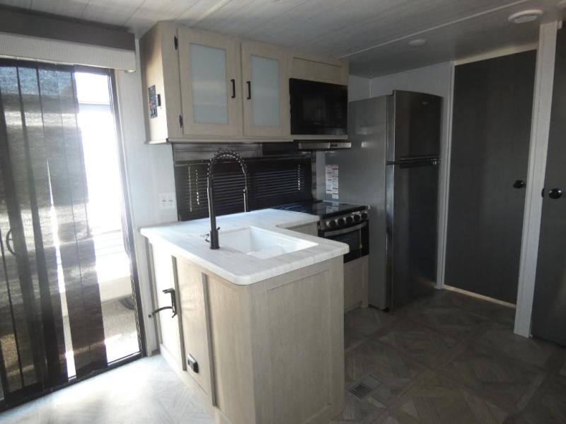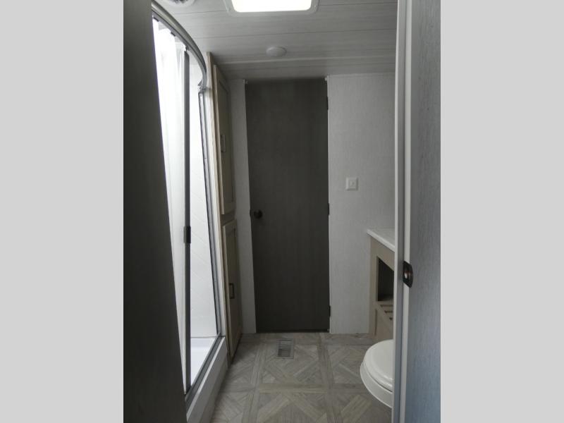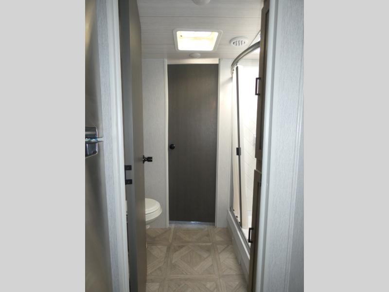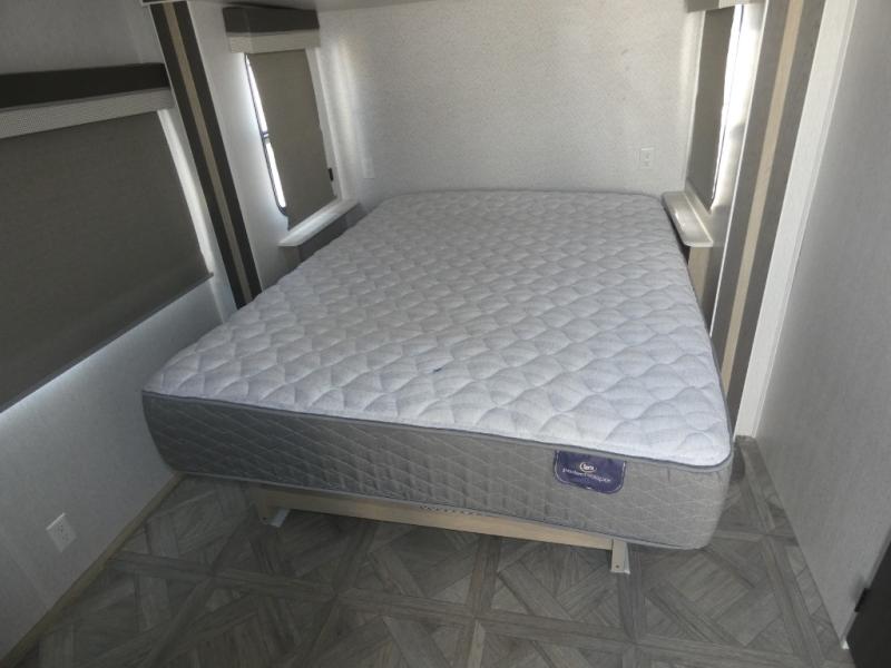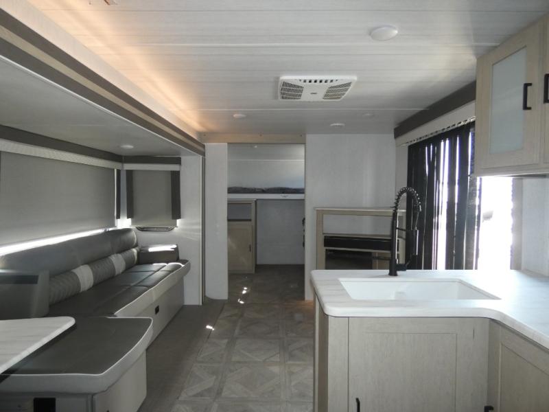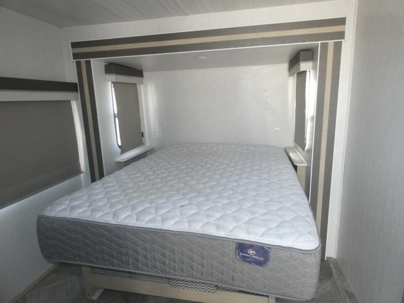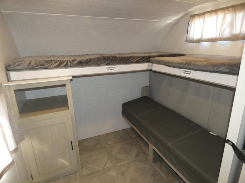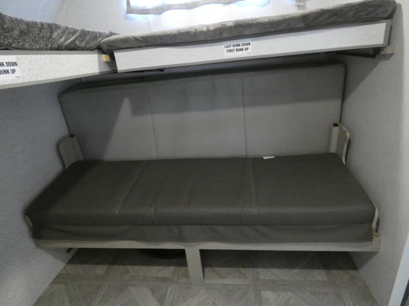You're going to love this Wildwood travel trailer and its unique layout. The private bunkhouse is up front, and the private bedroom is at the rear of the unit. You will love the walk-through bath that leads into the bedroom, and the custom king bed slide out provides more interior space. Enjoy breakfast at the booth dinette, and the Versa Lounge will provide a comfortable place to take an afternoon nap before heading back out to explore. The kids will love the front private bunkhouse with its Versa queen bed and Versa bunk beds. This model also includes an 18' power awning that will shade you during the day and create an outdoor living space you are sure to love.