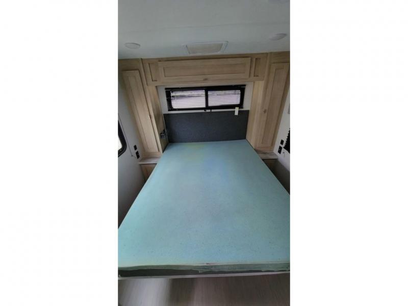 Pack your bags and head to the campground in this cozy travel trailer. Once you arrive you can make lunch on the outdoor LP griddle, and there is an exterior refrigerator for drinks or snacks. The U-shaped dinette inside will be perfect for meal times and game night, plus this space can double as additional sleeping space if you have guests. There is a separated bath, with the toilet and sink in one room, and the shower across the hall so two people can freshen up at the same. And don't overlook the rear bedroom with a queen bed, dual wardrobes, plus an overhead cabinet with a window below.