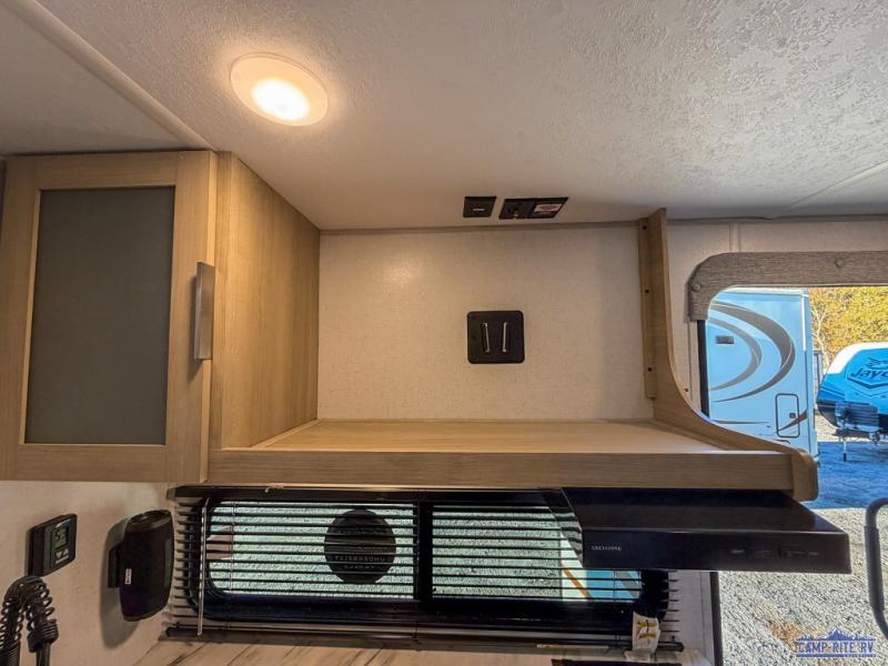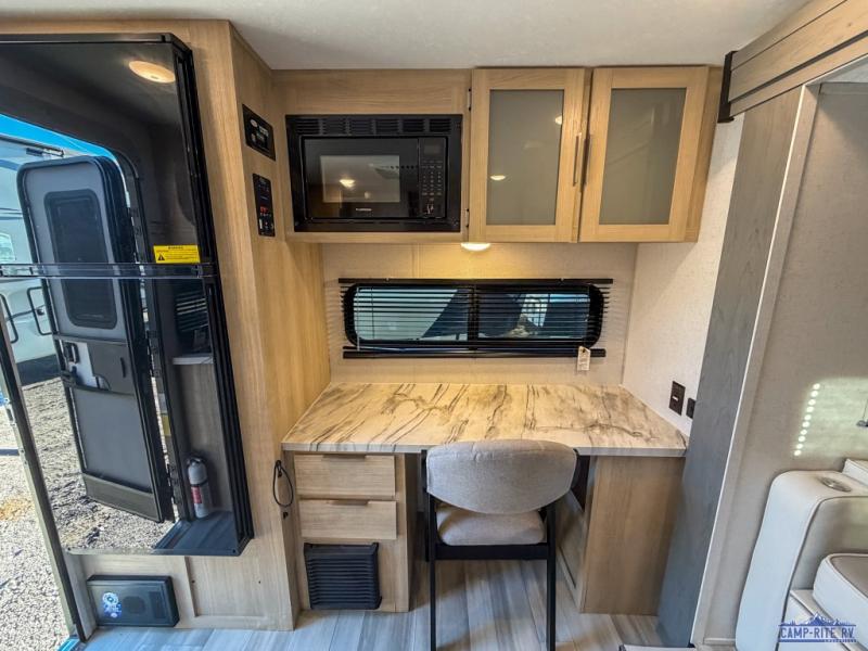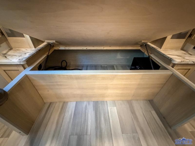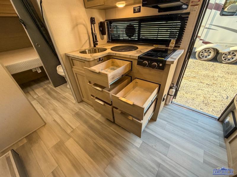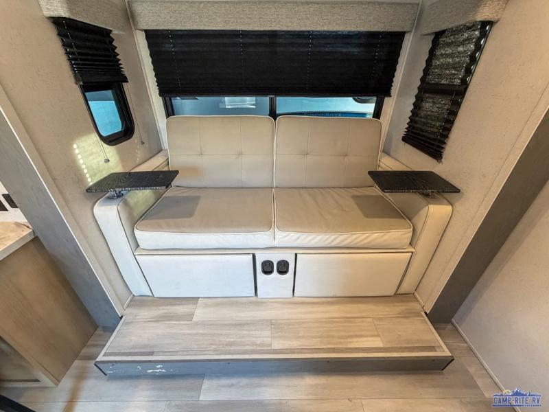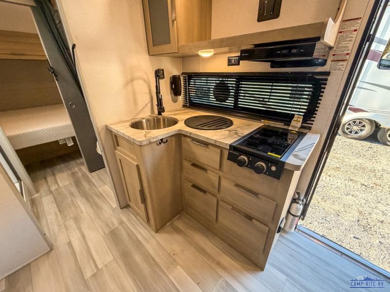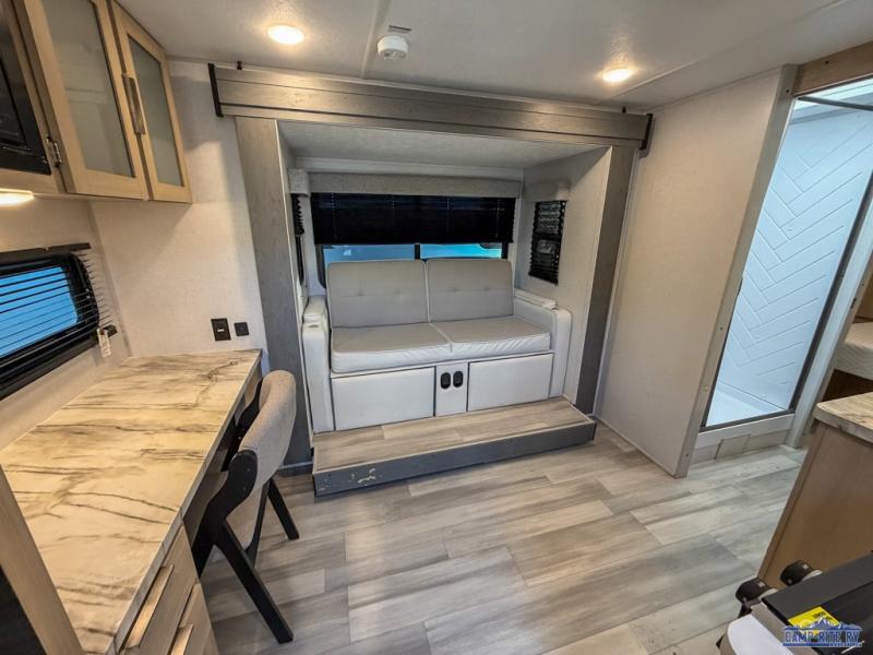 You're going to love every minute spent in this couple's trailer. The queen bed in the front private bedroom will provide a great night's rest, and there are dual wardrobes to easily get dressed in the morning. Head to the kitchen through the bath, then prepare eggs and bacon on the two burner cooktop. There is theater seating here to enjoy your coffee at each morning, or you may want to get some work done at the mobile station!