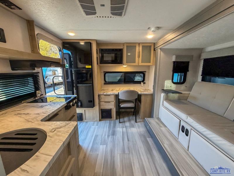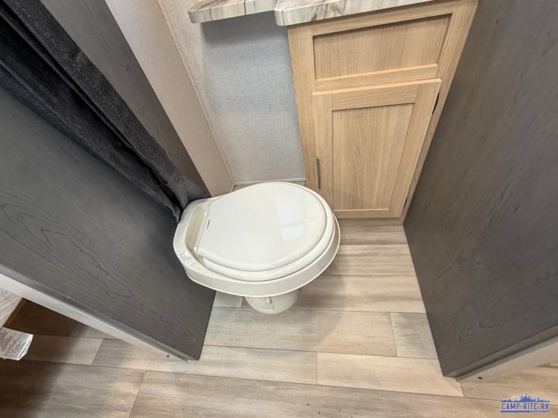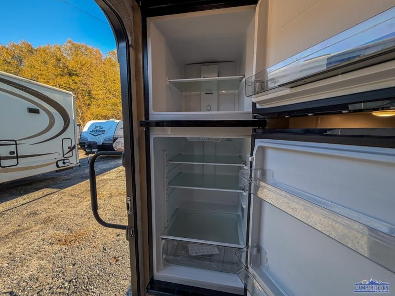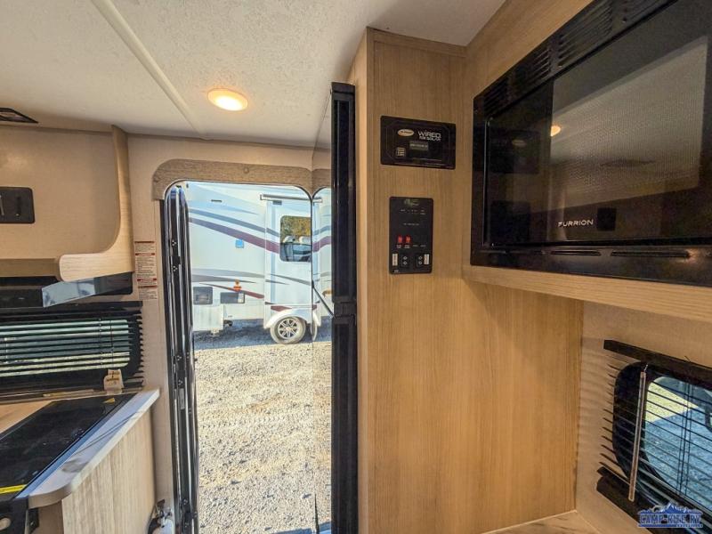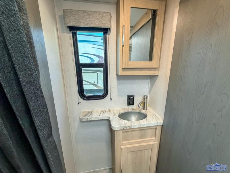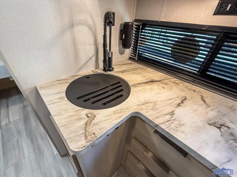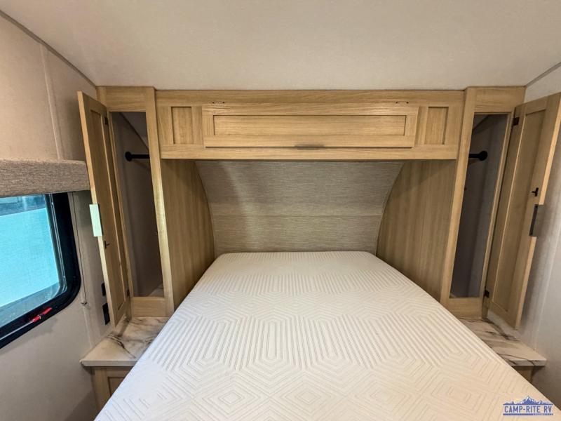 You're going to love every minute spent in this couple's trailer. The queen bed in the front private bedroom will provide a great night's rest, and there are dual wardrobes to easily get dressed in the morning. Head to the kitchen through the bath, then prepare eggs and bacon on the two burner cooktop. There is theater seating here to enjoy your coffee at each morning, or you may want to get some work done at the mobile station!