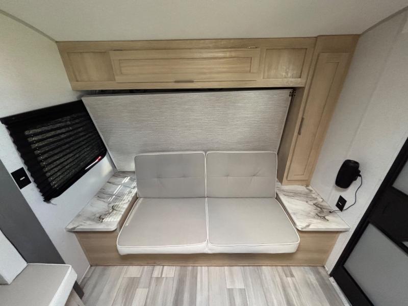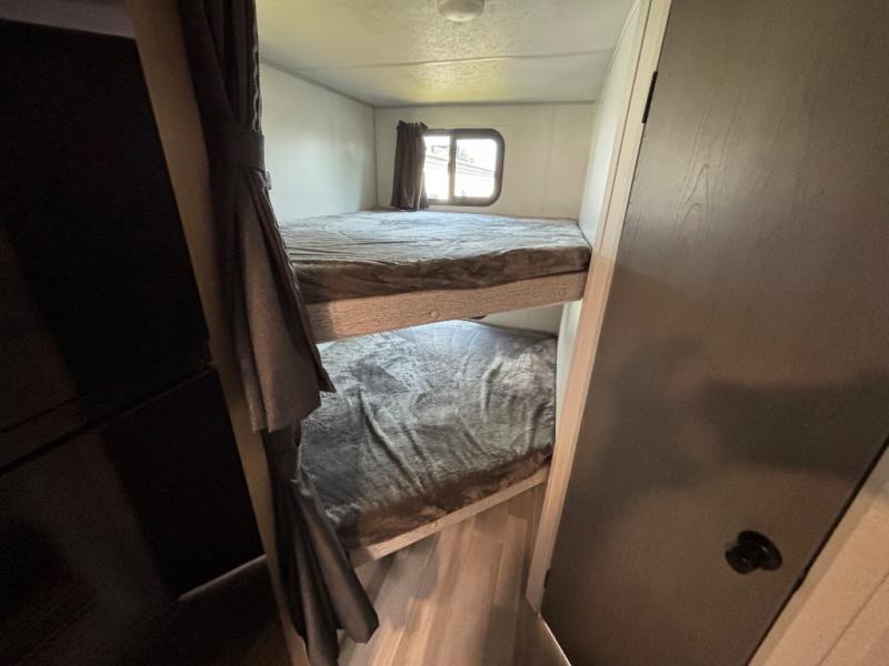 Bring your whole crew along for trips in this roomy travel trailer that can sleep eight people each night. Once you've set up the 14' power awning with LED lights, make lunch on the outdoor LP griddle, and there is an outdoor refrigerator for cold drinks. Explore some trails or take your fishing poles down to the river, then head back to the trailer to clean up in the full bath. The kids may want to rest on the double-size bunks, while the adults play a game around the U-shaped dinette. This model also includes a sofa with storage access, plus a Murphy bed that lowers over the sofa when you're ready for bed. Don't let this travel trailer slip away!