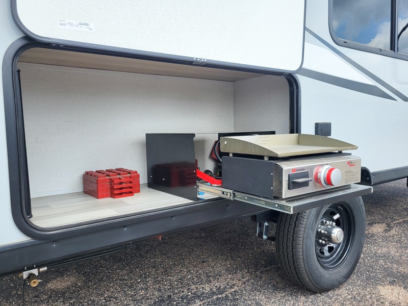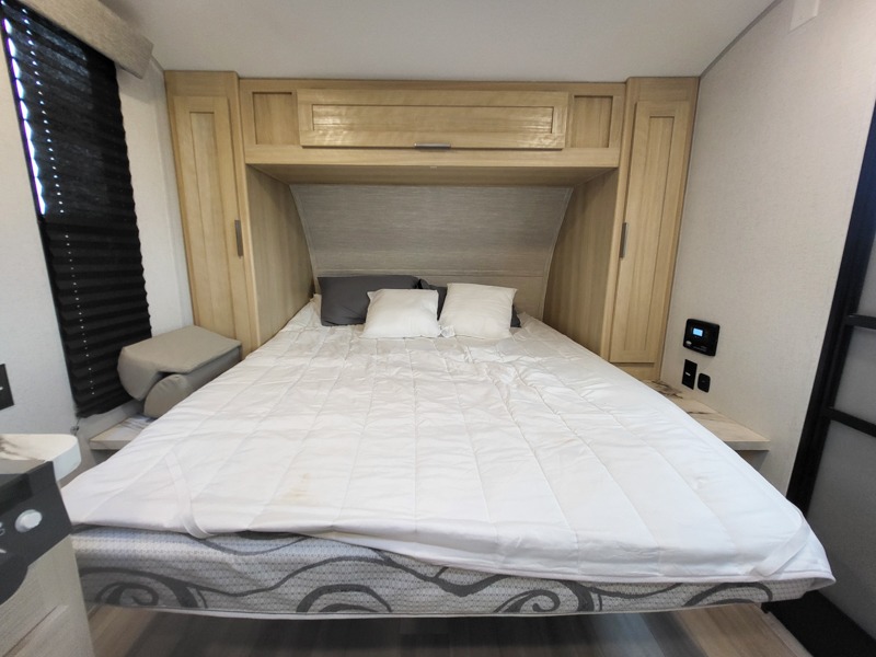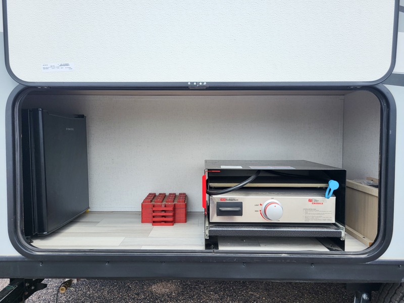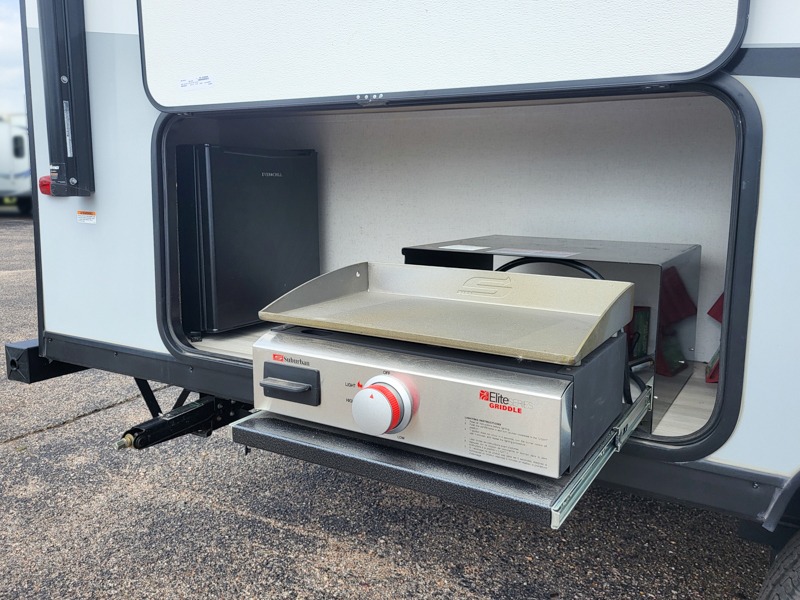 Find all you're looking for and more in this versatile travel trailer. The RV queen Murphy bed will be perfect for a great night's rest, and in the morning you can easily fold it up to relax on the sofa with storage access. The chef of your group can prepare breakfast on the two burner cooktop, or head outdoors to cook on the outside kitchen and enjoy the 14' power awning. The full bath allows you to stay clean all week, and the double-size bunks will be perfect for extra guests!